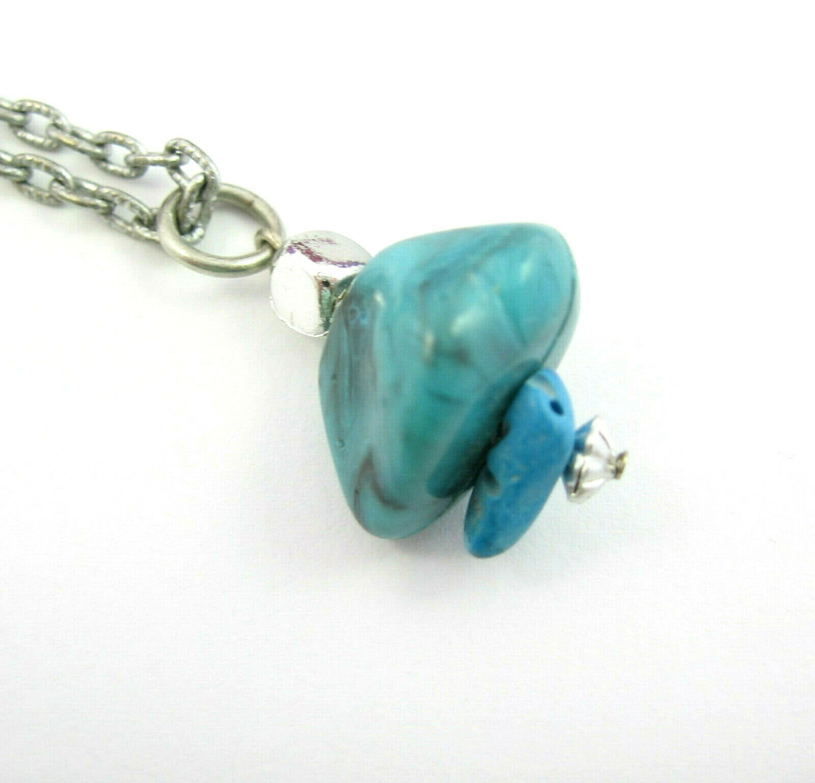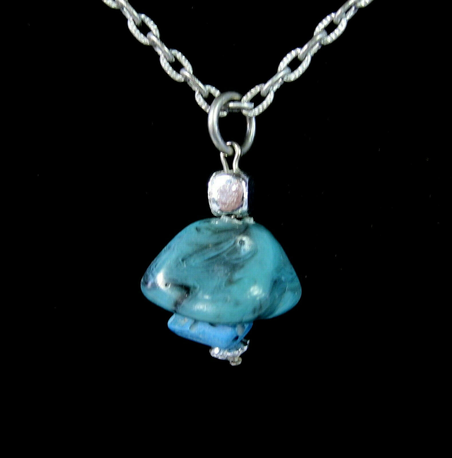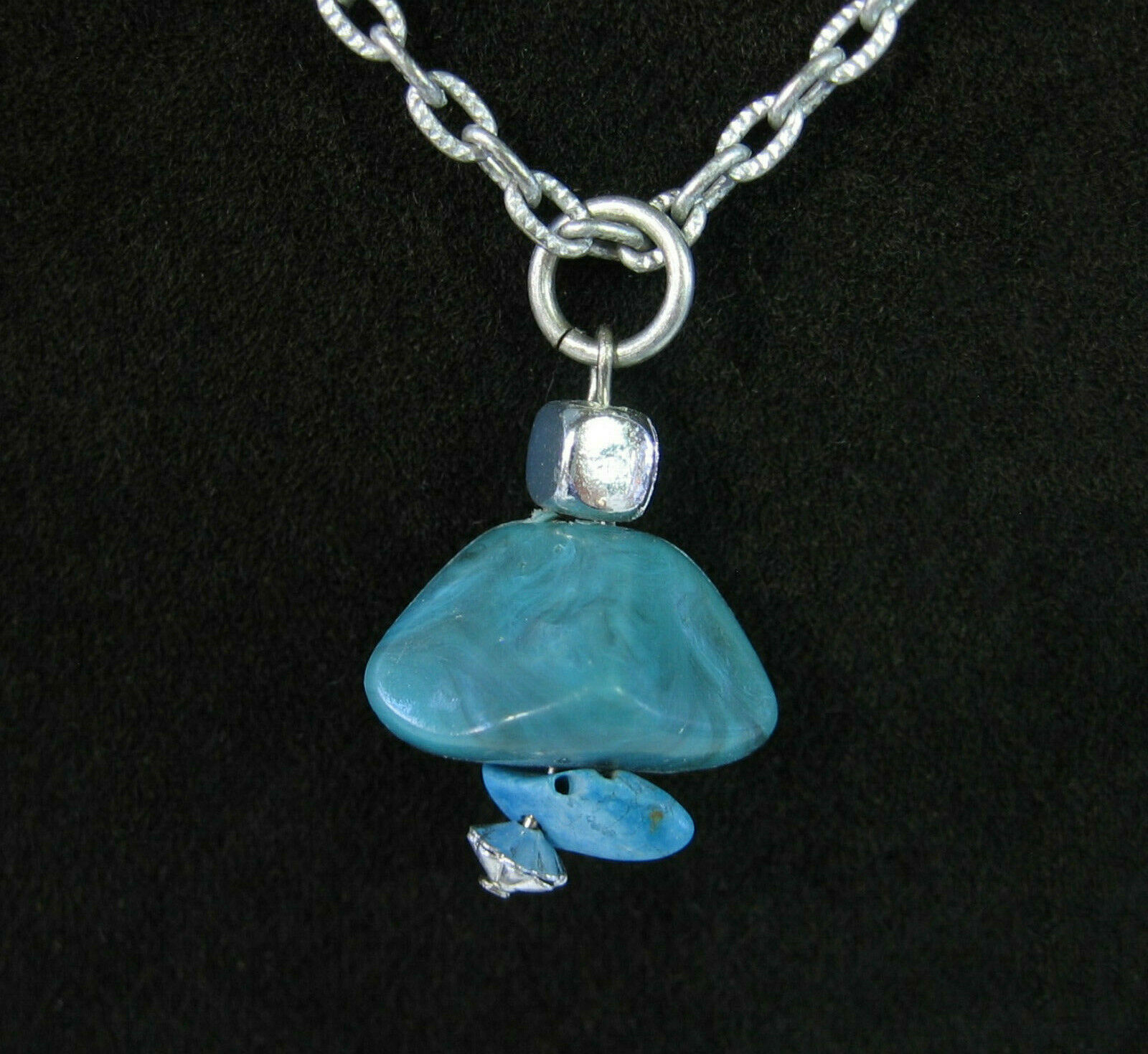 In a silvertone metal, this is a Faux Or Imitation Turquoise BLUE STONE PENDANT NECKLACE!