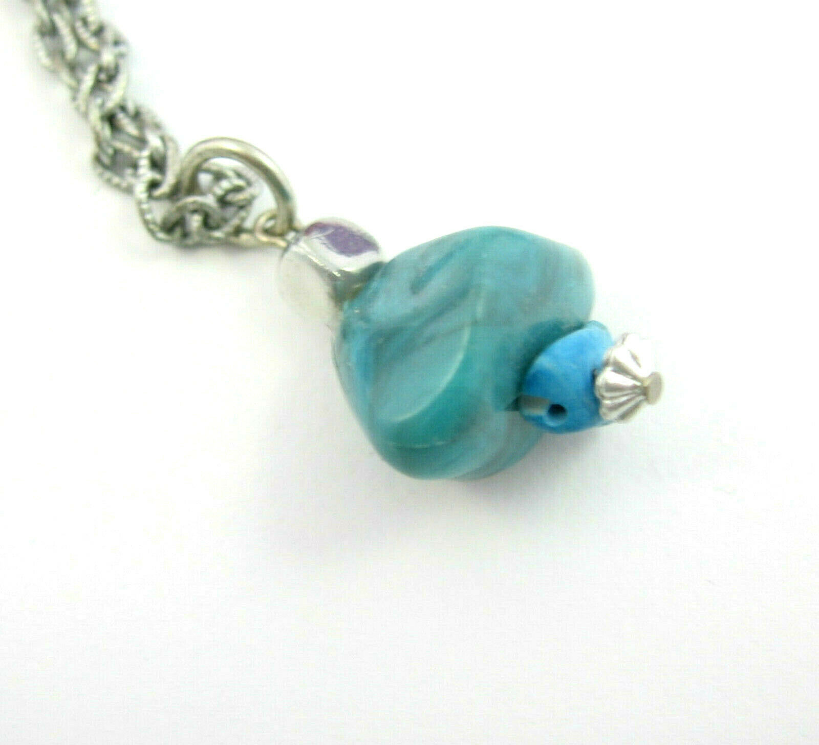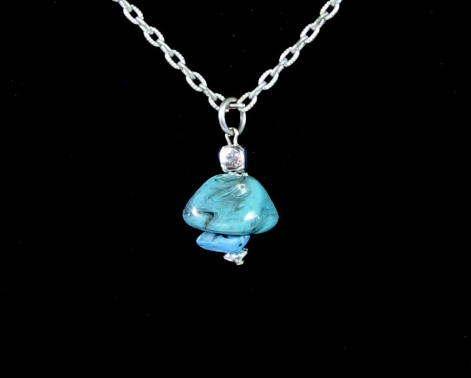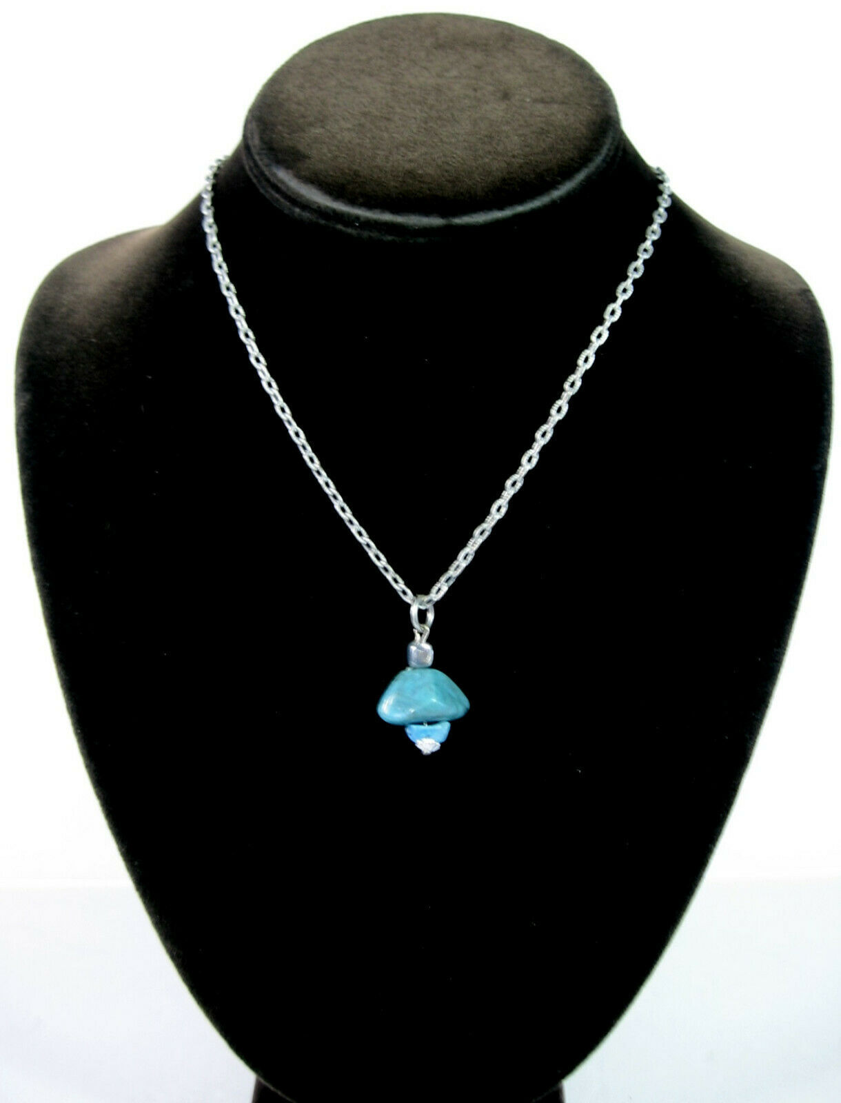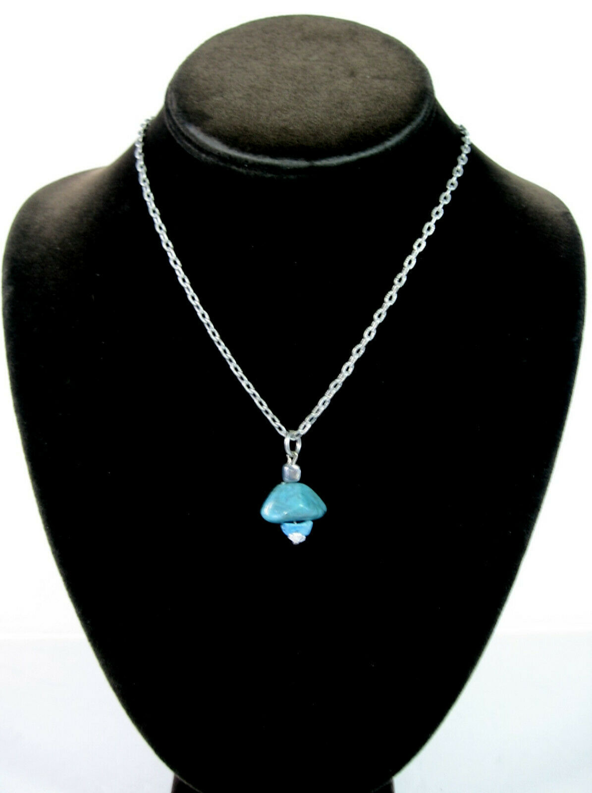 In a silvertone metal, this is a Faux Or Imitation Turquoise BLUE STONE PENDANT NECKLACE!