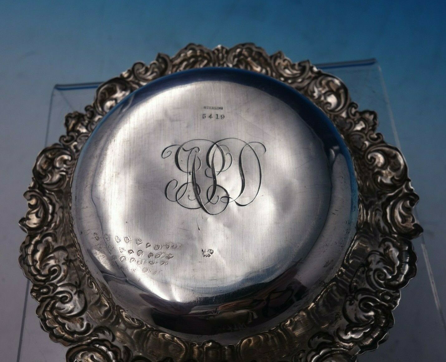 Beautiful Pompadour by Whiting sterling silver candy dish marked #5419. This piece measures 1" tall x 5" in diameter and weighs 1.53 troy ounces. It is monogrammed on the bottom (see photos) and is in good vintage condition. Lovely!