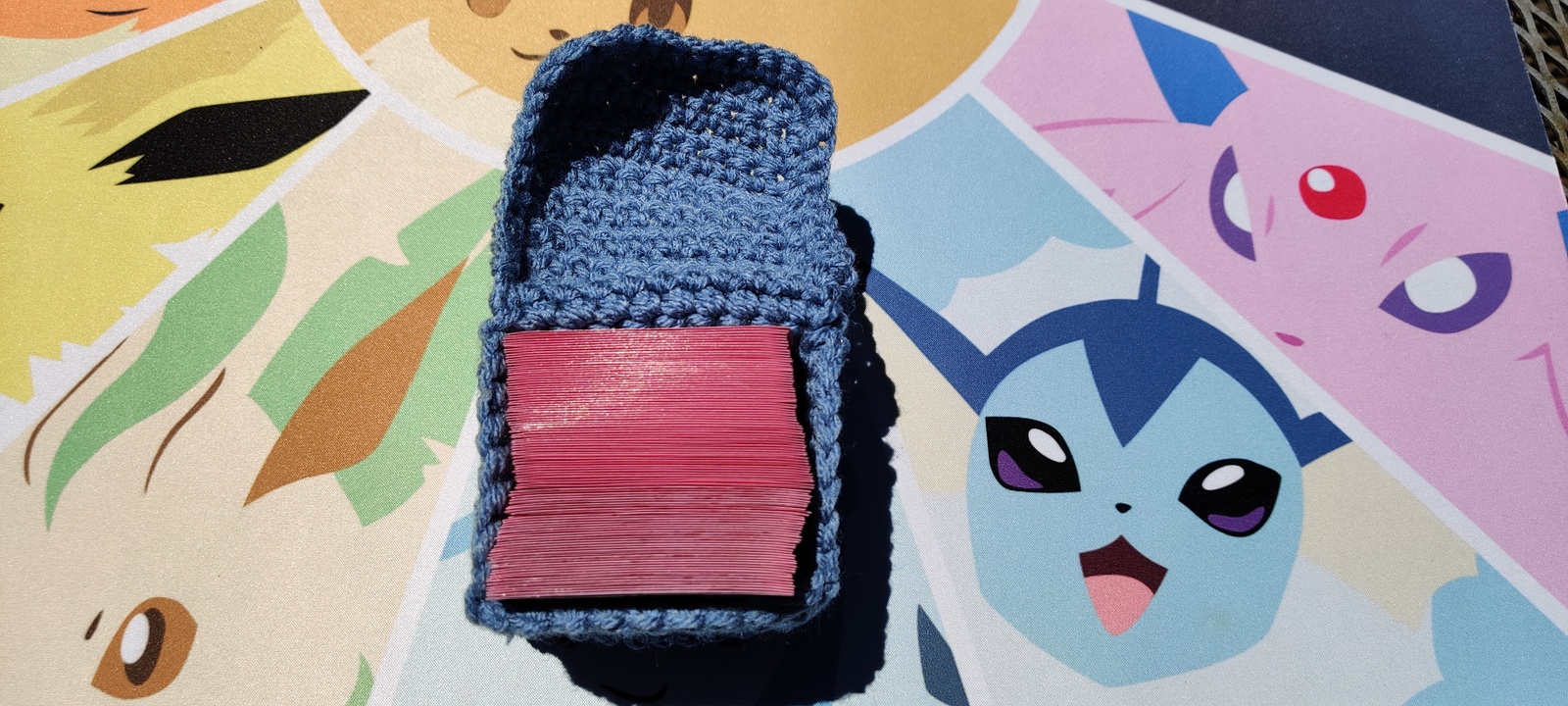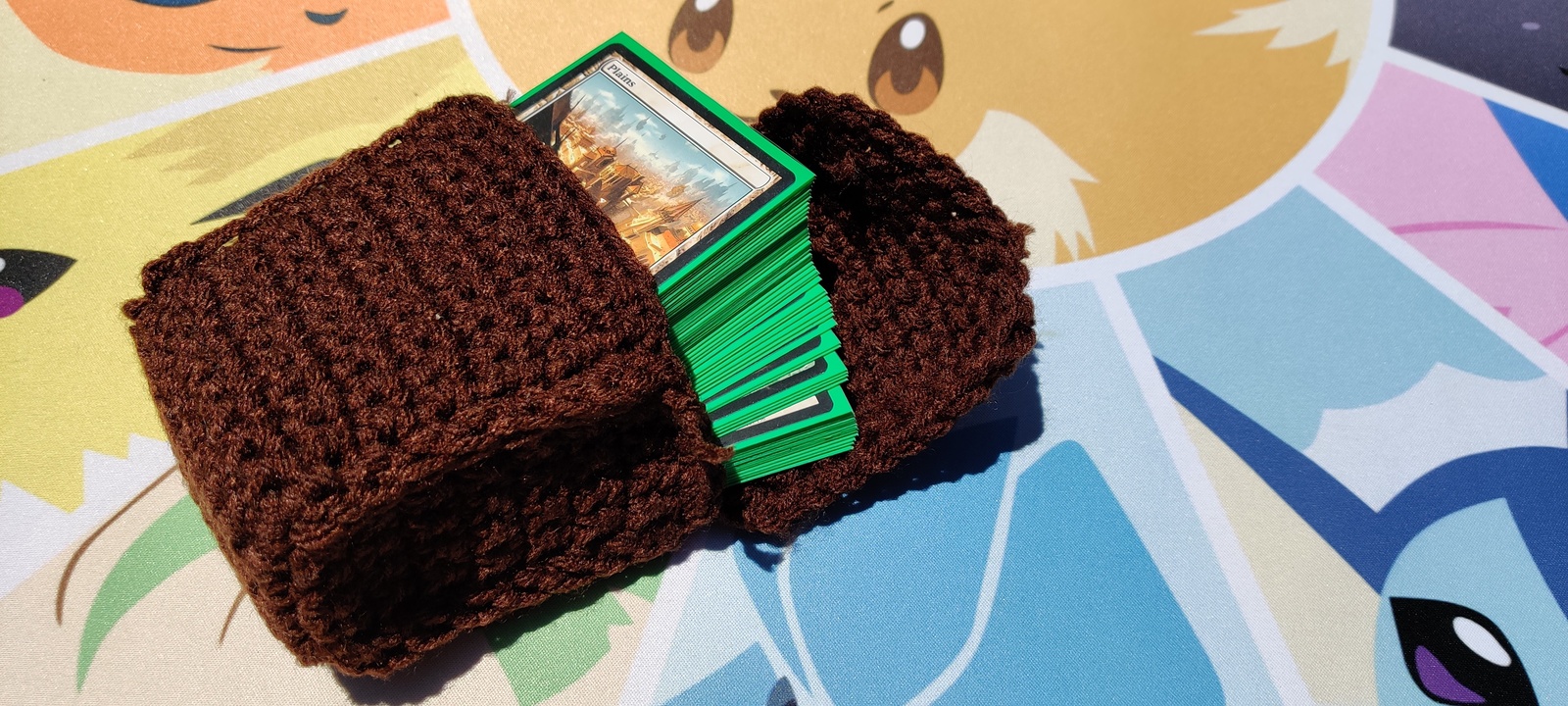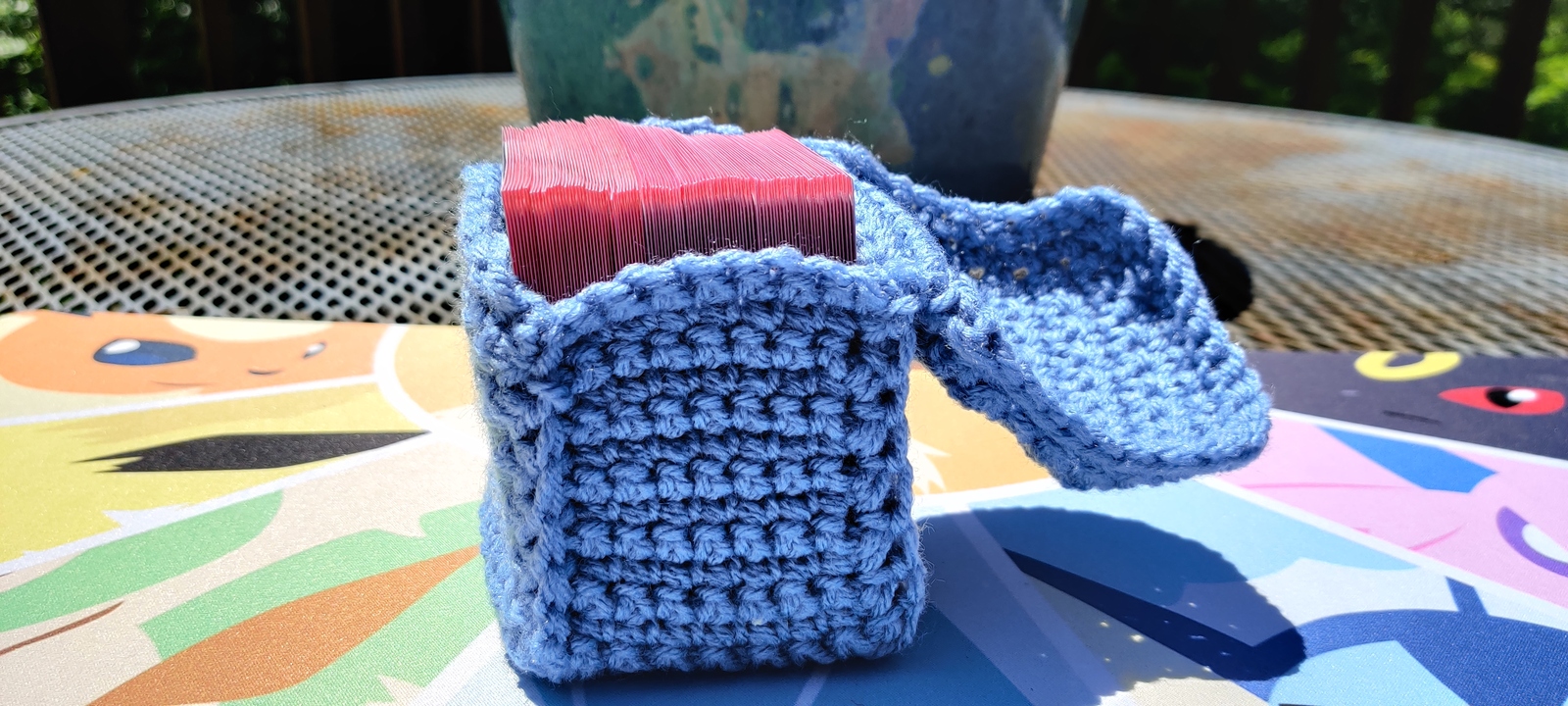 Handmade, crochet deck "box" perfect for storing your deck when you head out for a tournament or casual game at your LGS or friends. Fits standard trading card games in a single sleeve. Choose from 60 card or 100 card deck sizes.