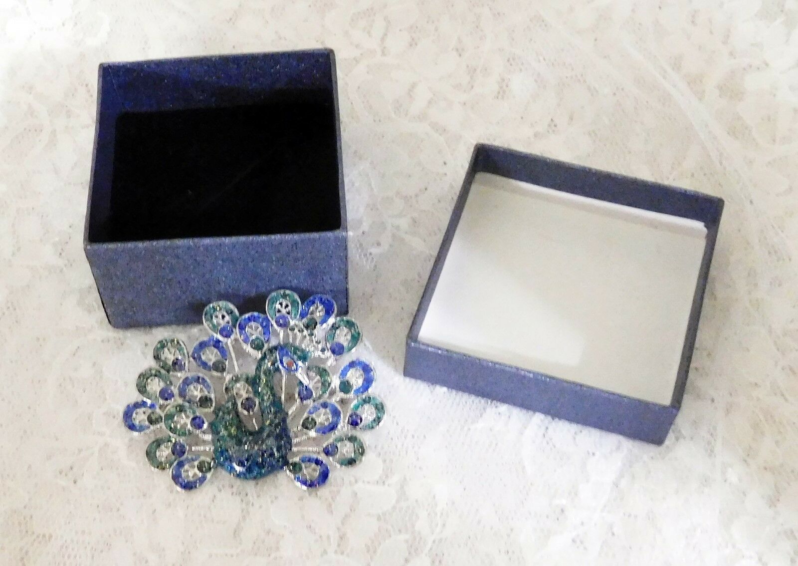Enameled Blue/Green/Silver Peacock Pin - 2" tall x 2 1/2" wide - Beautiful! Excellent Condition - Comes with original Box - Pin clasp functions normally - See photos for further description.
