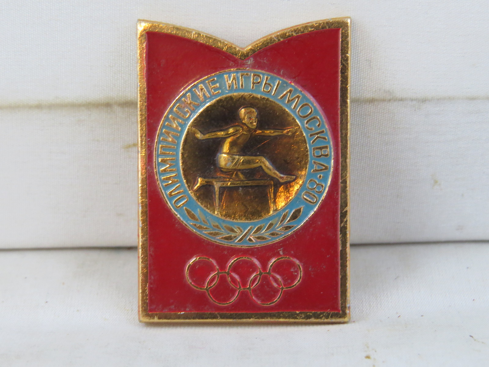 Up for sale is a vintage Olympic pin. It is from the 1980 Summer Olympic Games which were held in Moscow Russia. The pin is shaped like a banner with a red base colour. The Inner ring has a blue base colour with Summer Olympics Moscow 80. The middle of the pin has an image of a hurdler stamped on a gold background. What a great addition to any pin collection.