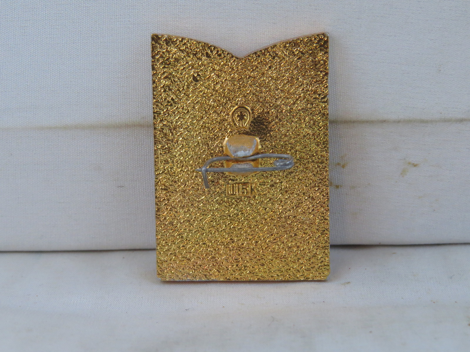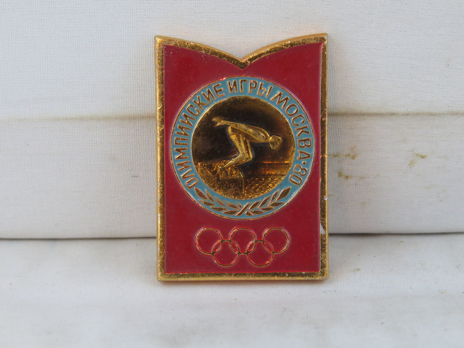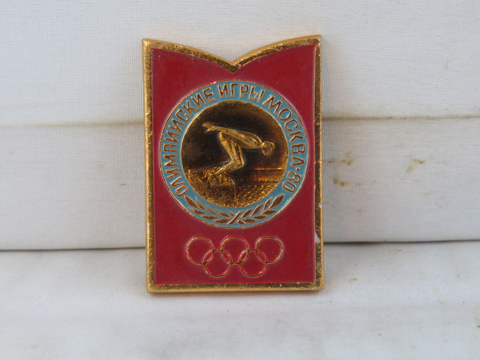 Up for sale is a vintage Olympic pin. It is from the 1980 Summer Olympic Games which were held in Moscow Russia. The pin is shaped like a banner with a red base colour. The Inner ring has a blue base colour with Summer Olympics Moscow 80. The middle of the pin has an image of a swimmer jumping into a pool stamped on a gold background. What a great addition to any pin collection.