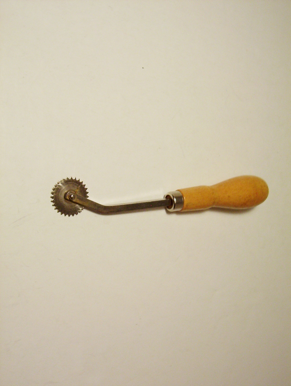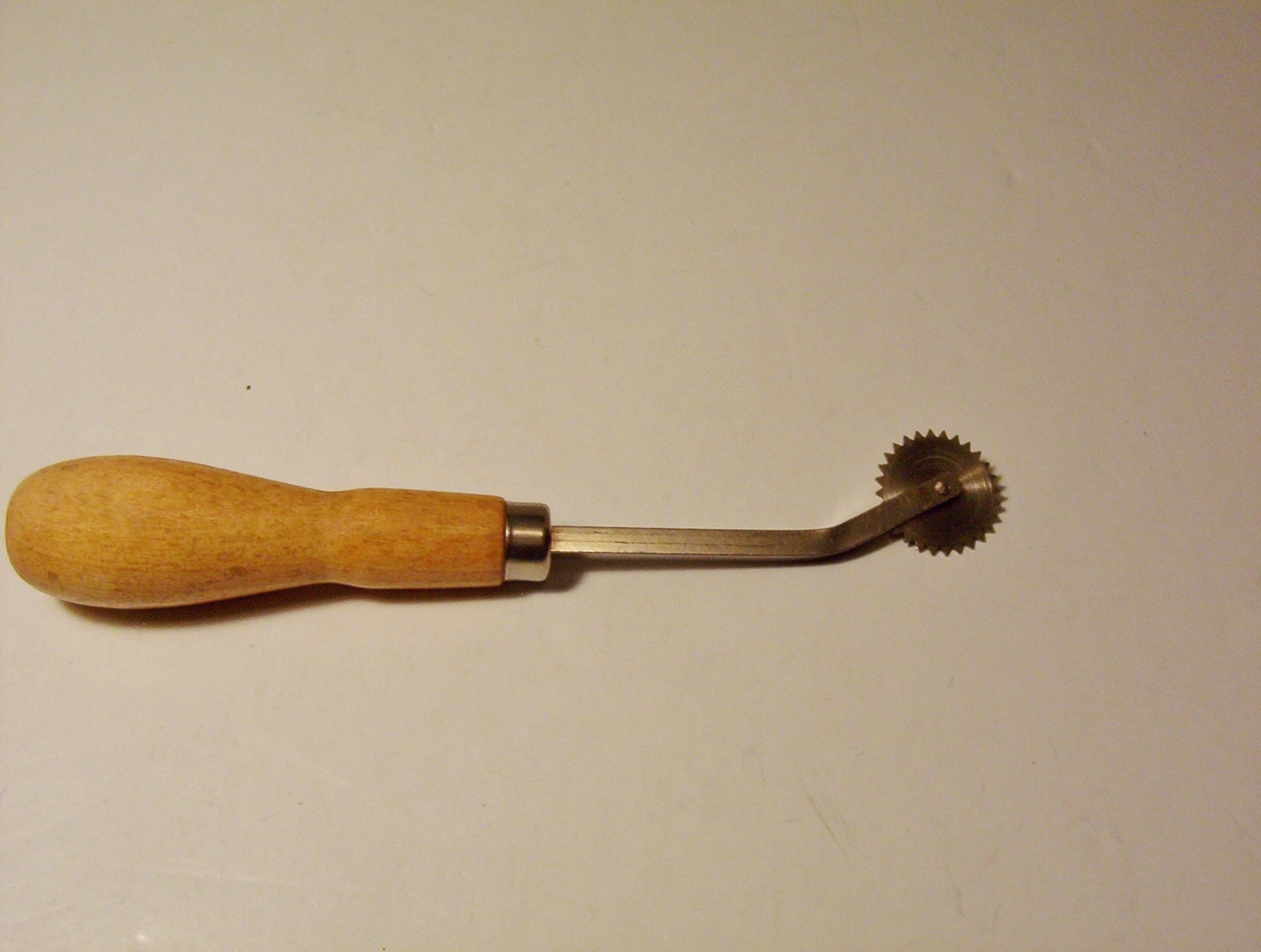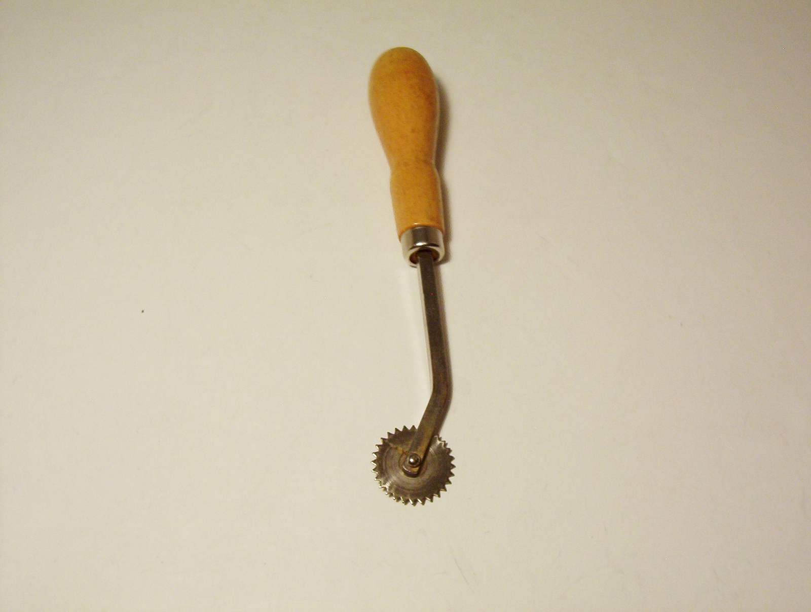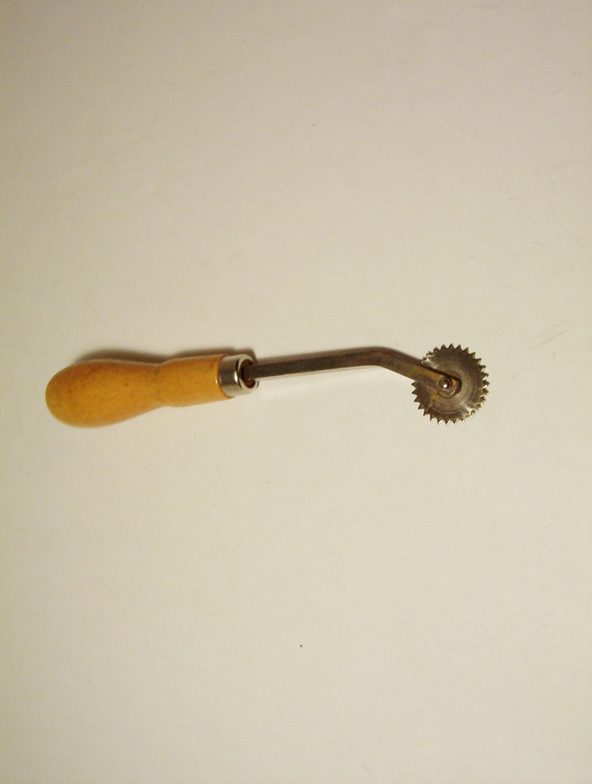 This is a wood handled tracing wheel used to mark patterns on the material. Would make a nice addition to your sewing tools.