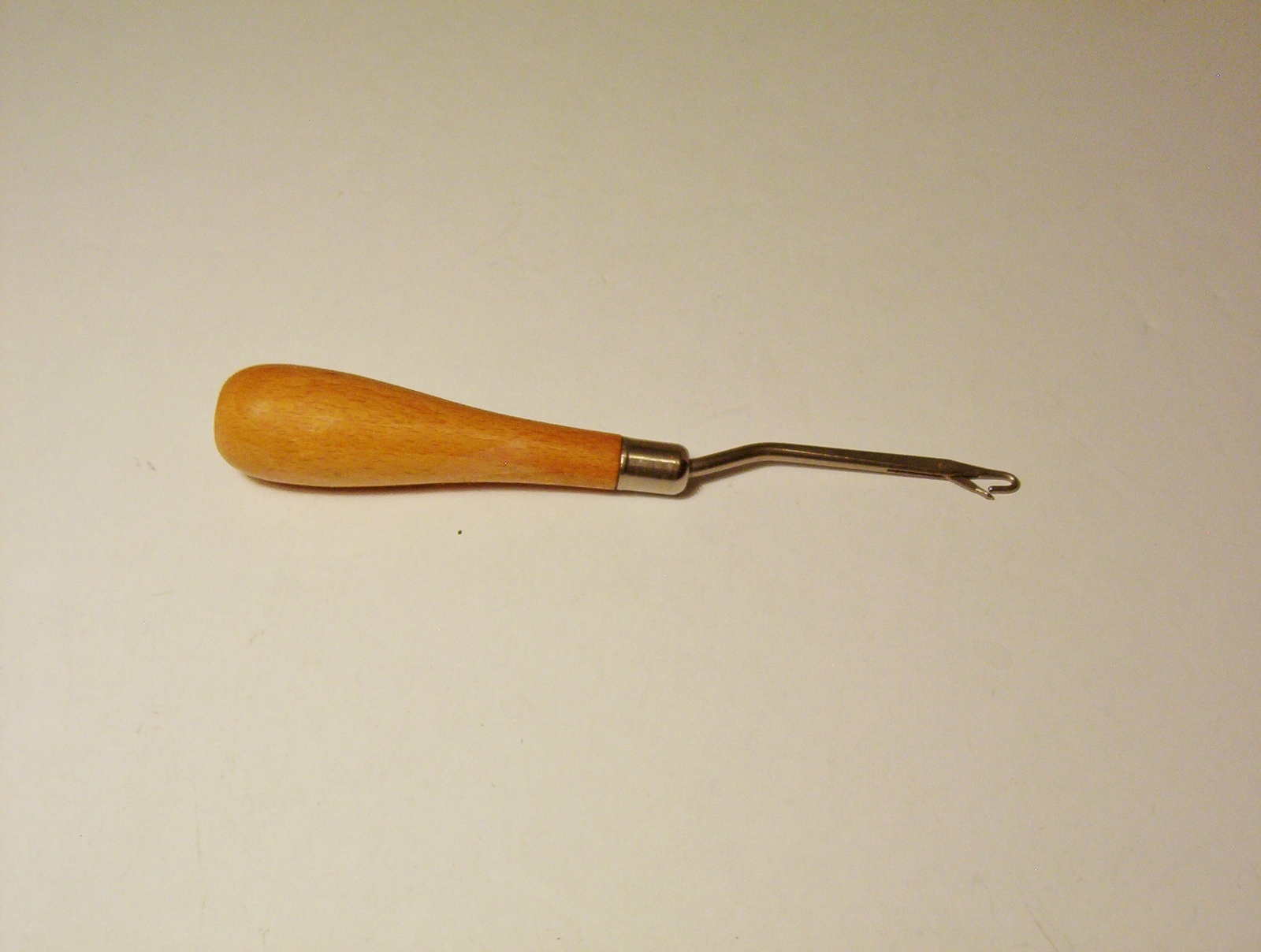 This is a latch hook rug tool with a wooden handle used to make rugs. Would also be a great addition to display in your sewing collection.