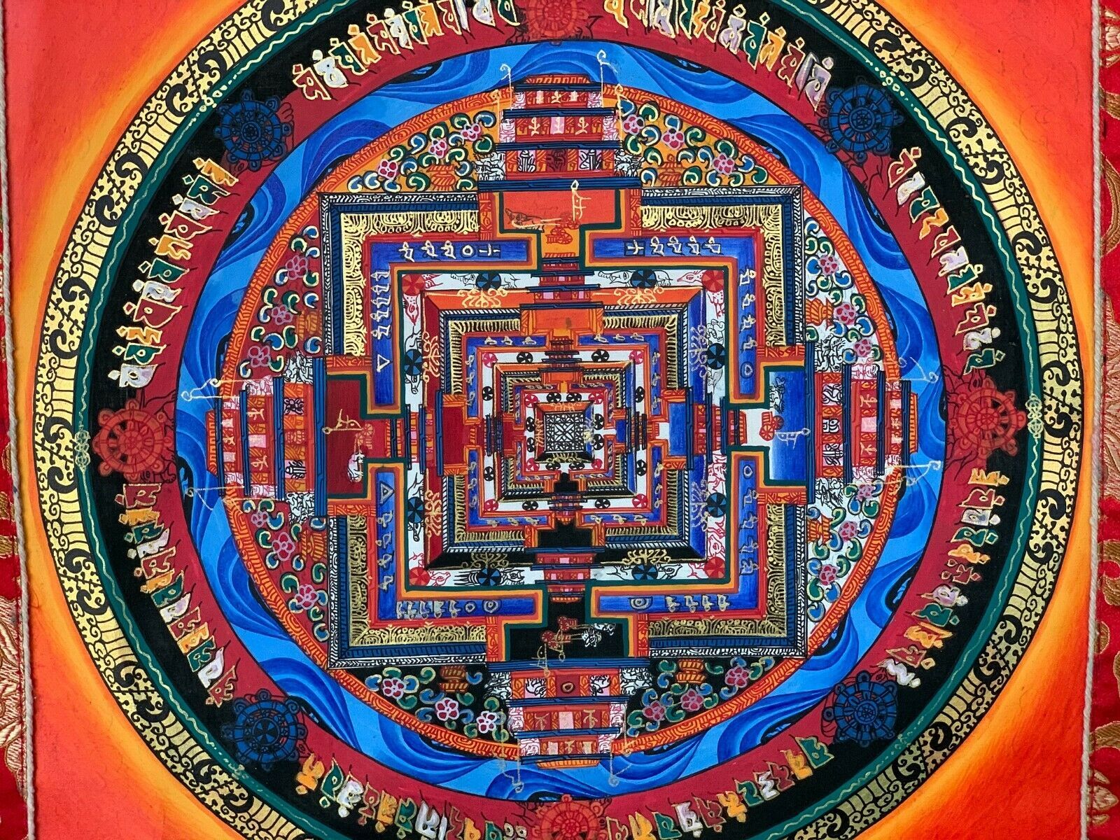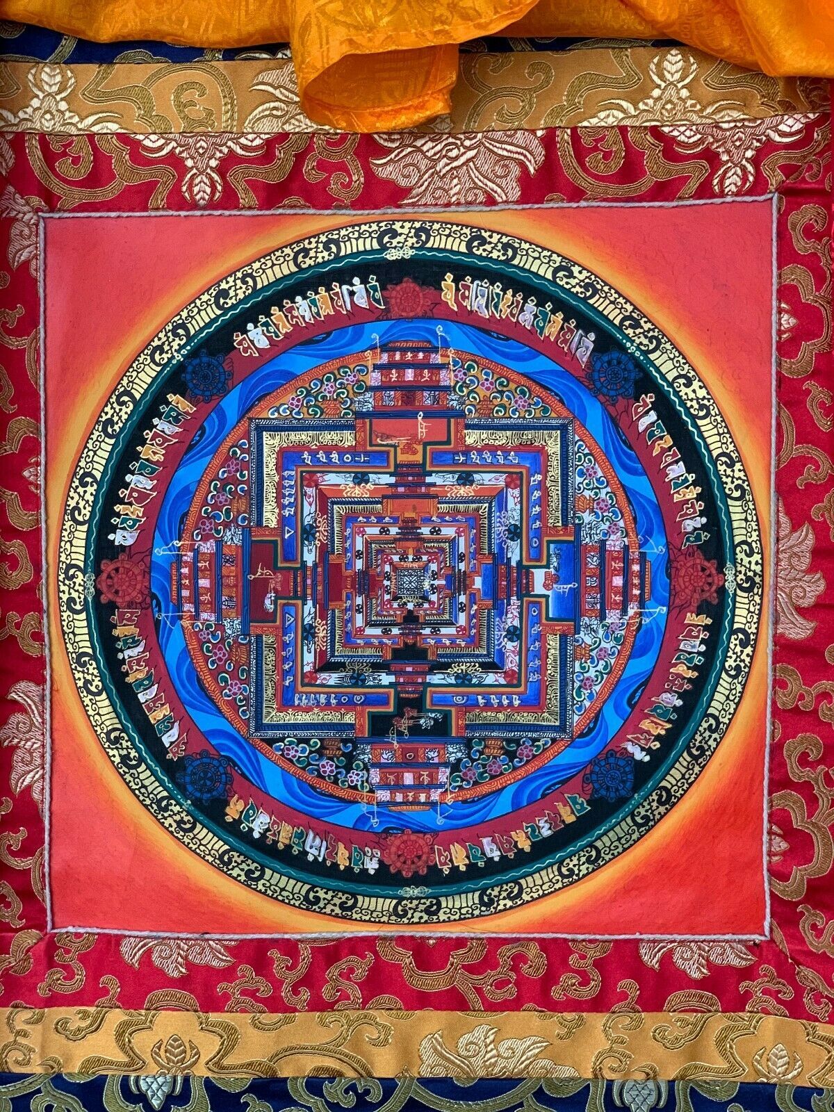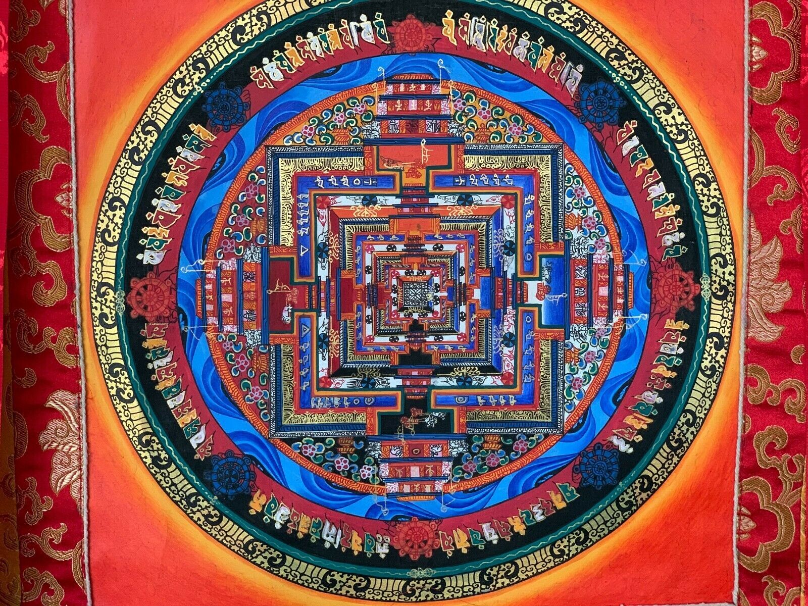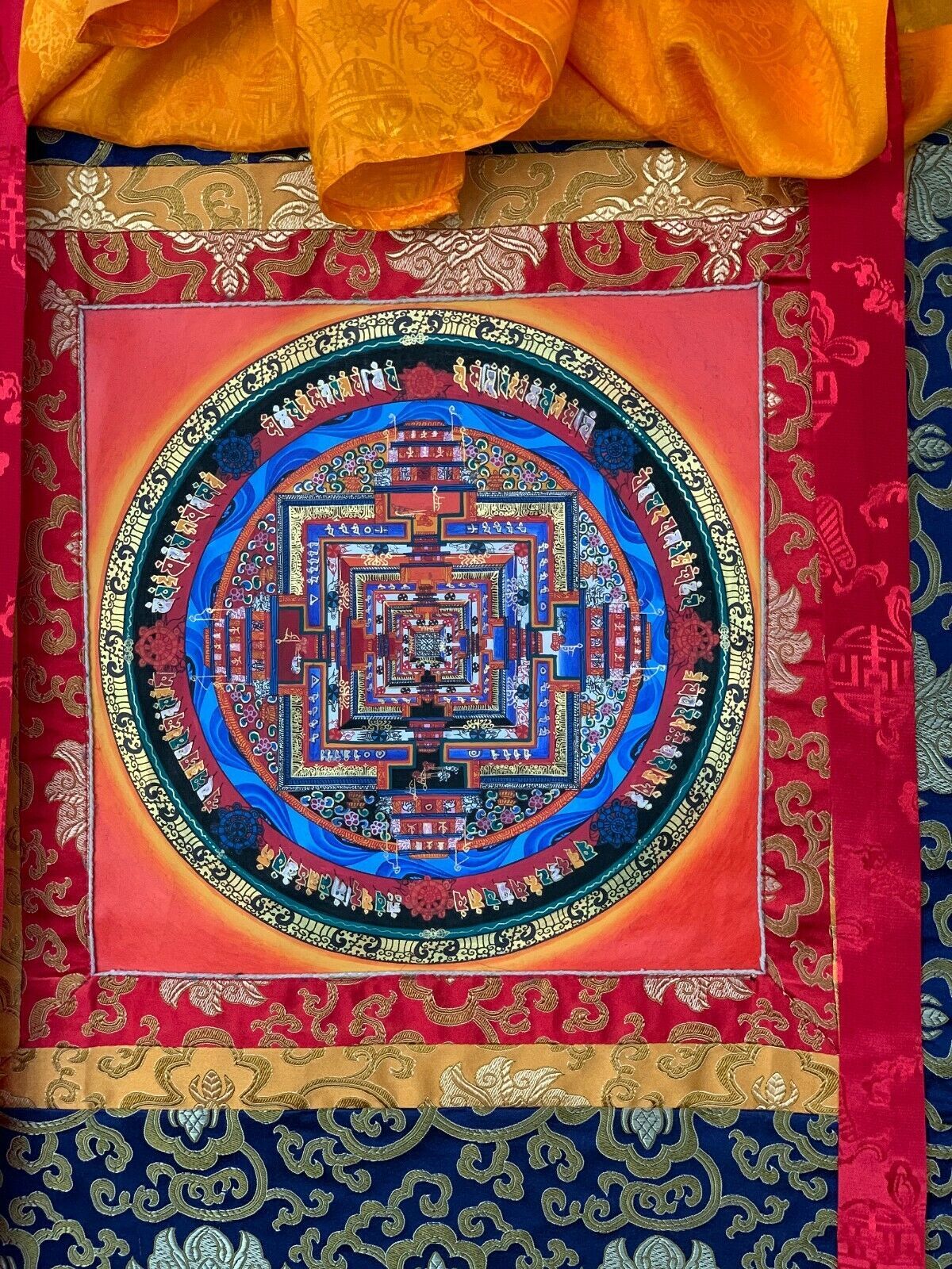 GENUINE HAND-PAINTED KALACHAKRA MANDALA -THE WHEEL OF LIFE CIRCLE ORIGINAL- UNIQUE TIBETAN THANGKA PAINTING, BUDDHIST ART WITH SILK BORDER/BROCADE
