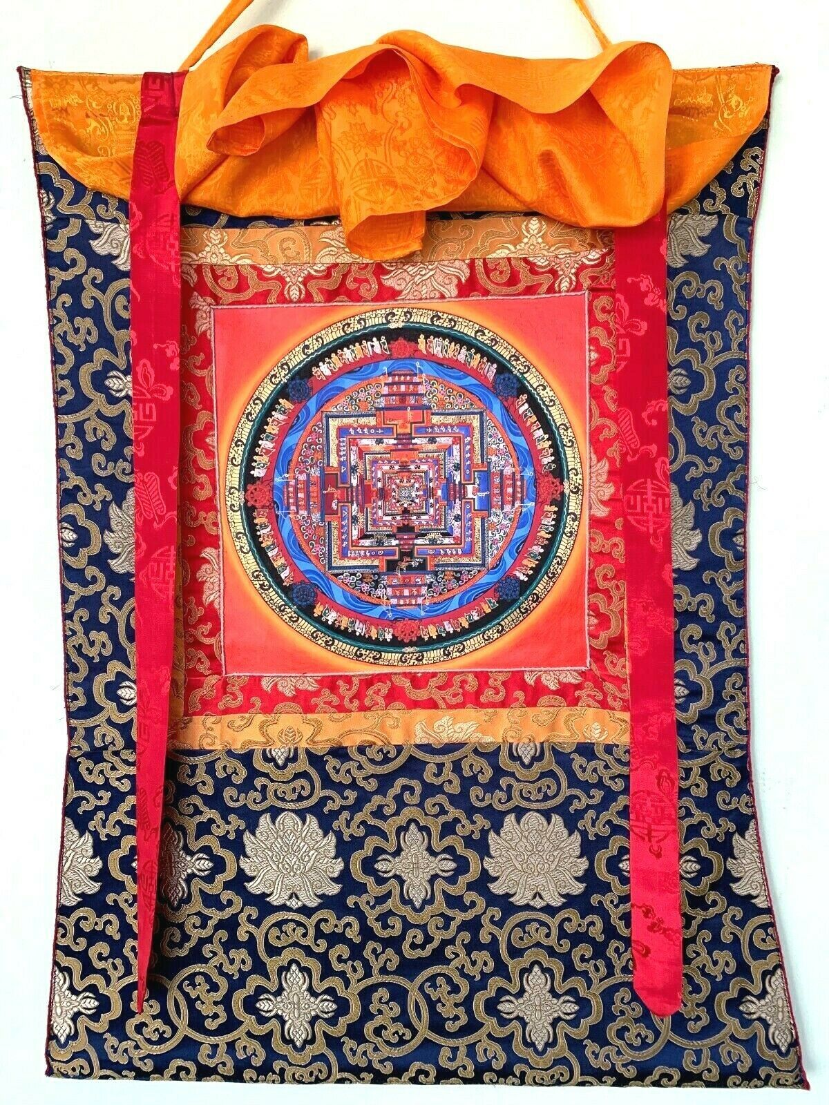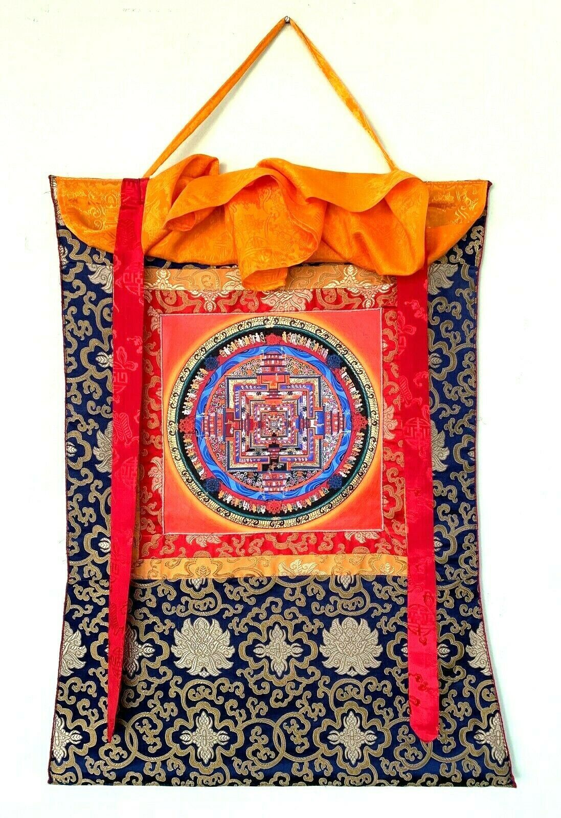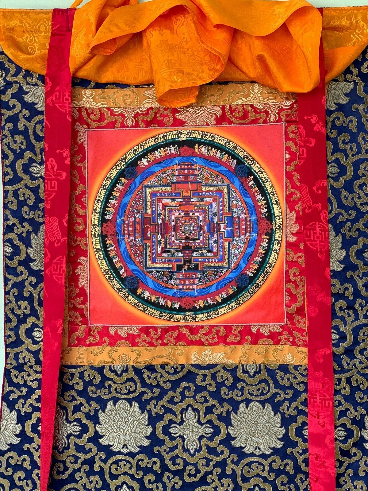 HAND-PAINTED, KALACHAKRA MANDALA, TIBETAN, THANGKA, THANKA WITH SILK BROCADE