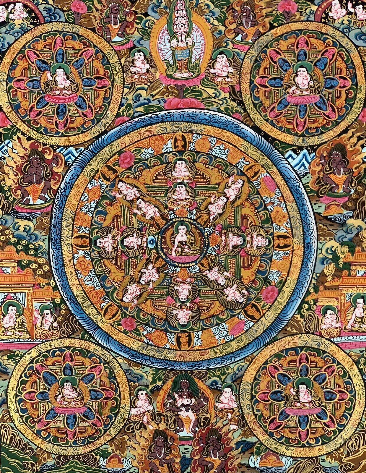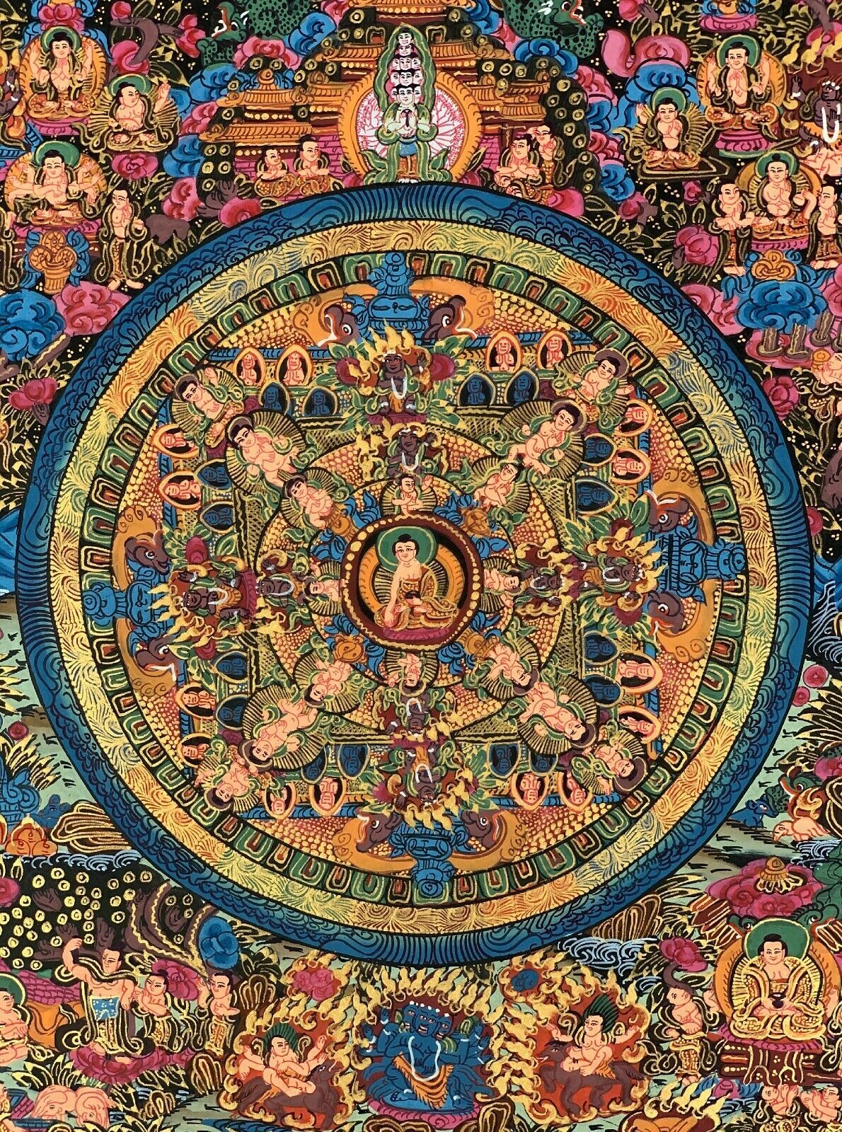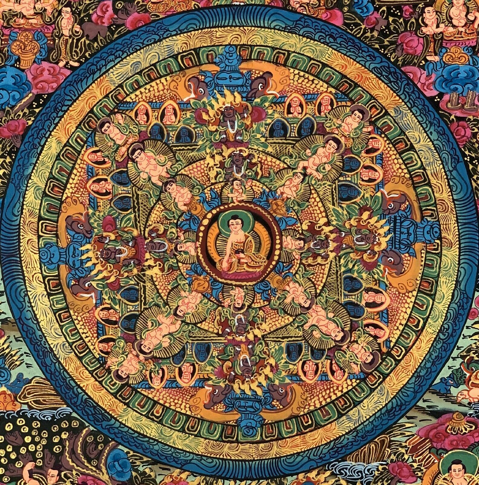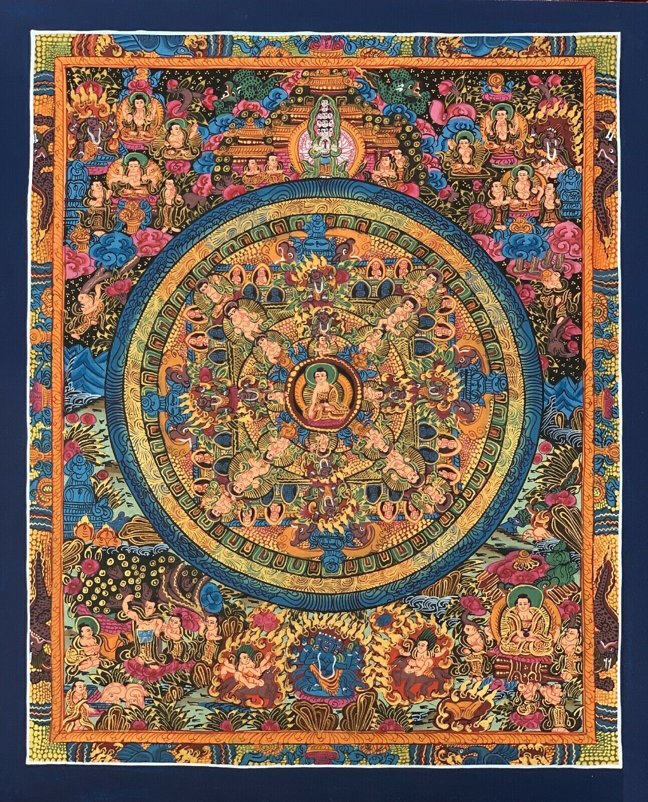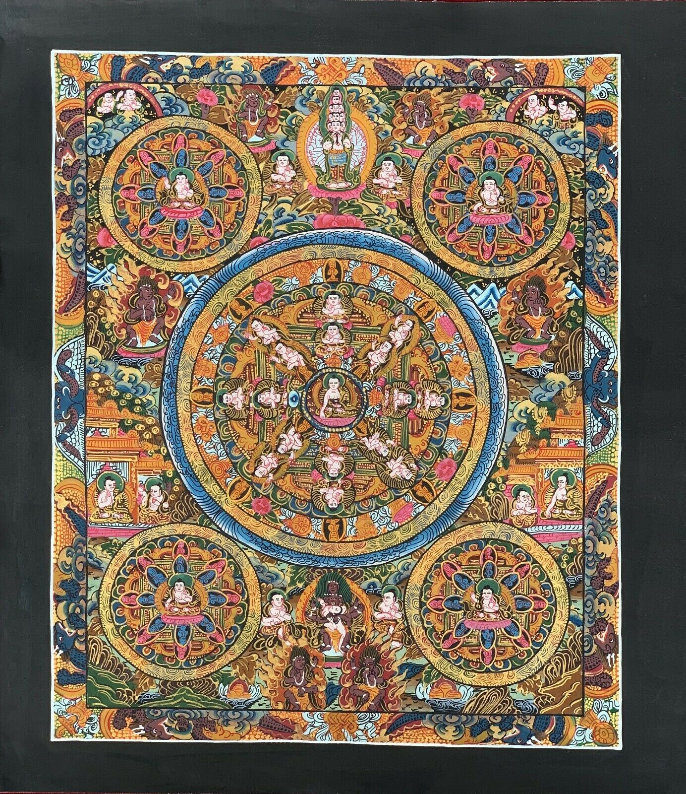 HAND-PAINTED BUDDHA MANDALA -THE WHEEL OF LIFE CIRCLE ORIGINAL THANGKA PAINTING