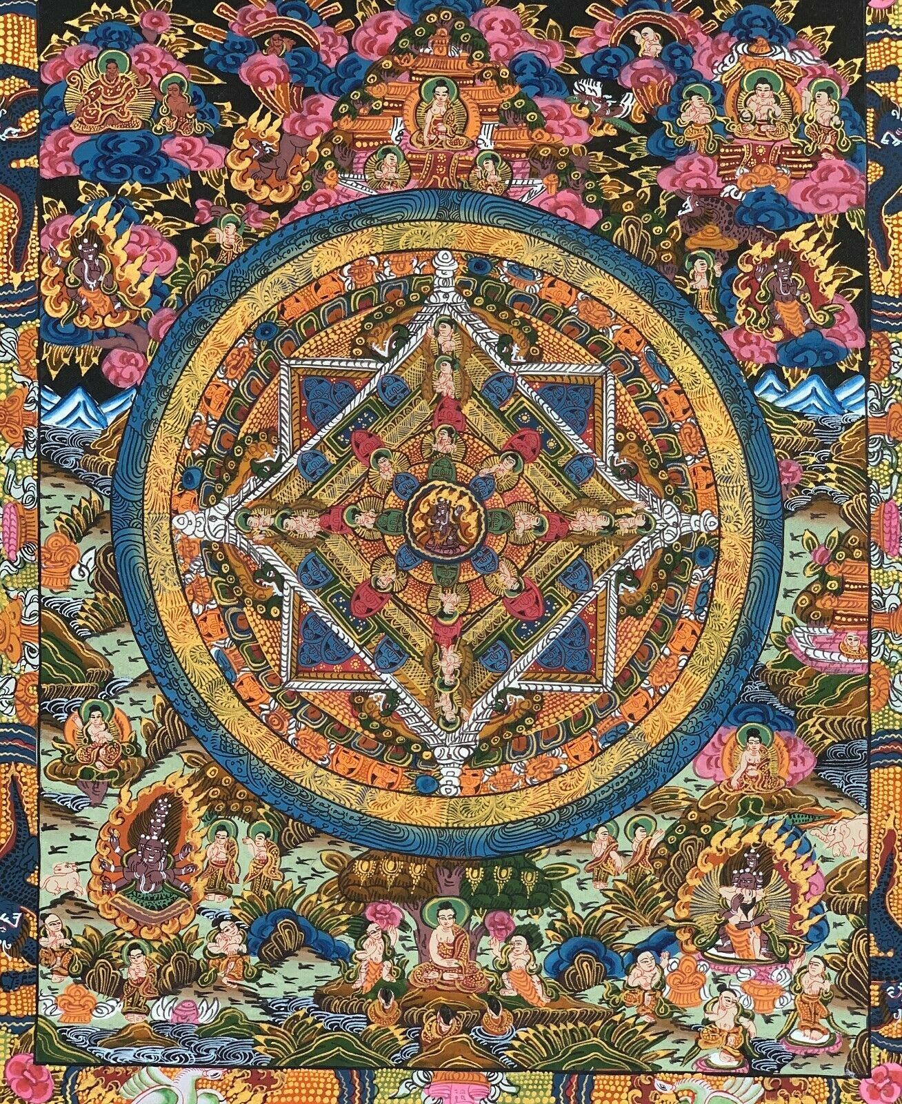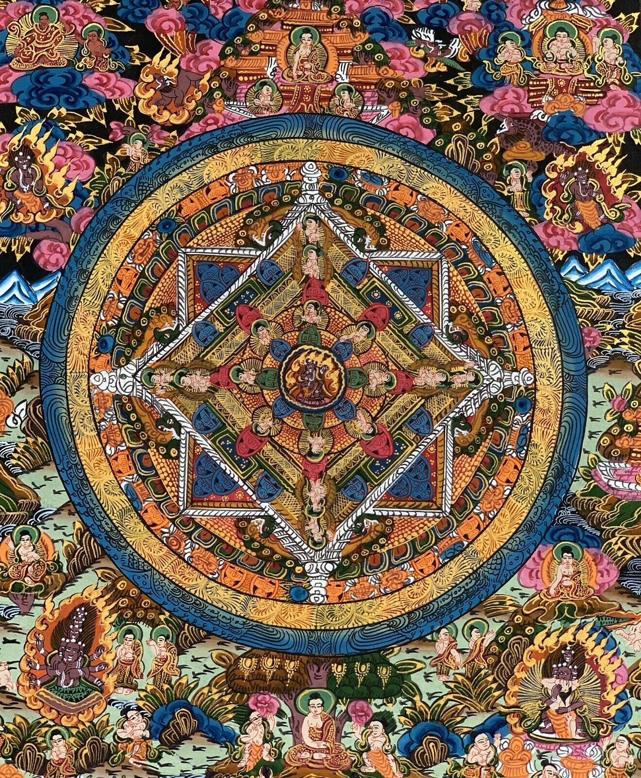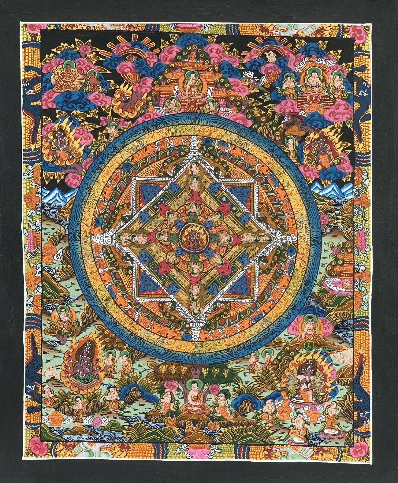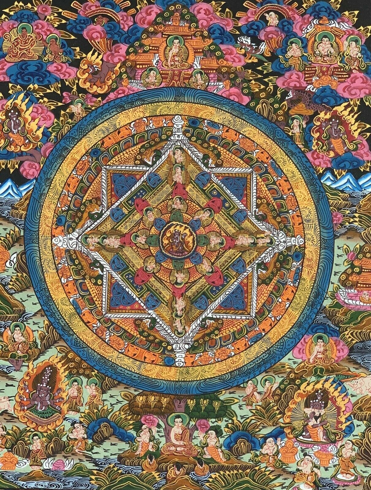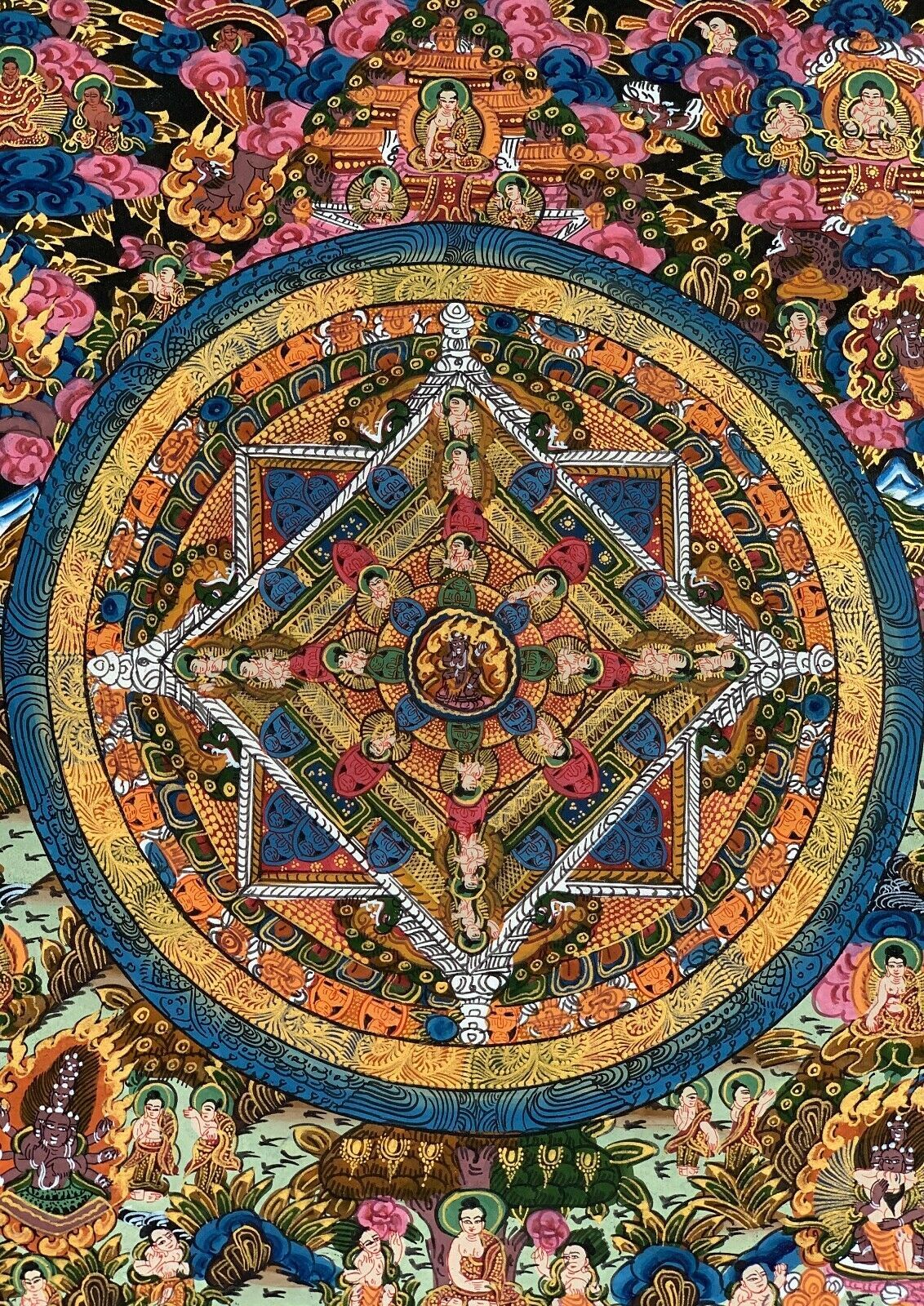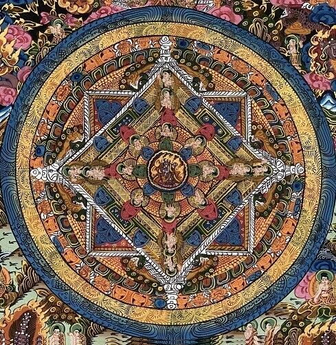 HAND-PAINTED BUDDHA MANDALA -THE WHEEL OF LIFE CIRCLE ORIGINAL THANGKA PAINTING