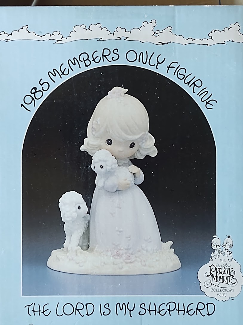 This wonderful Precious Moments figurine is titled, "LORD IS MY SHEPHERD" and features a young girl holding a small lamb in her arms, with another at her feet. Her dress and around her feet are delicate spring flowers. A reminder of everything becoming new in the spring, the promise of God's love, that he will care for us, and the lamb (His son), he gave to us.