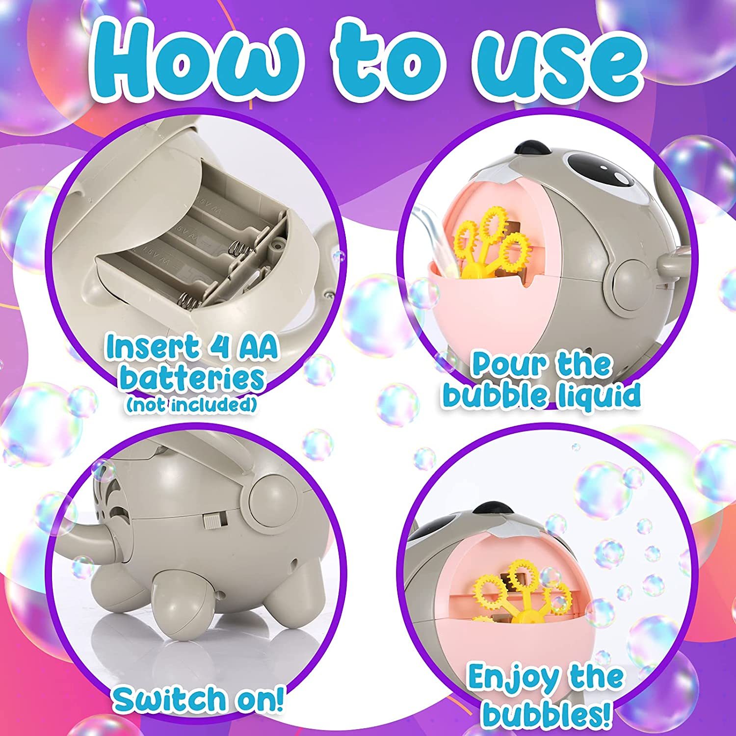 Install 4 AA batteries, pour some bubble solution into the bubble machine, finally press the ON/OFF button to start bubbling. Without complicated steps, kids can easily operate this bubble maker toy. The easiest bubble machine for kids. Small screwdriver is included for batteries installation. (Battery NOT INCLUDED)