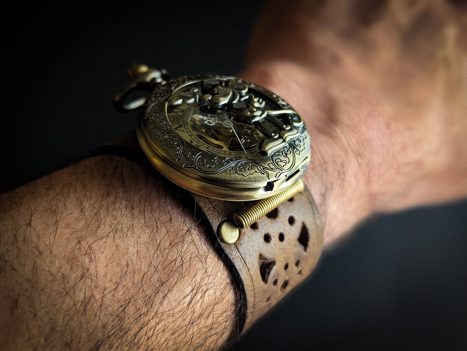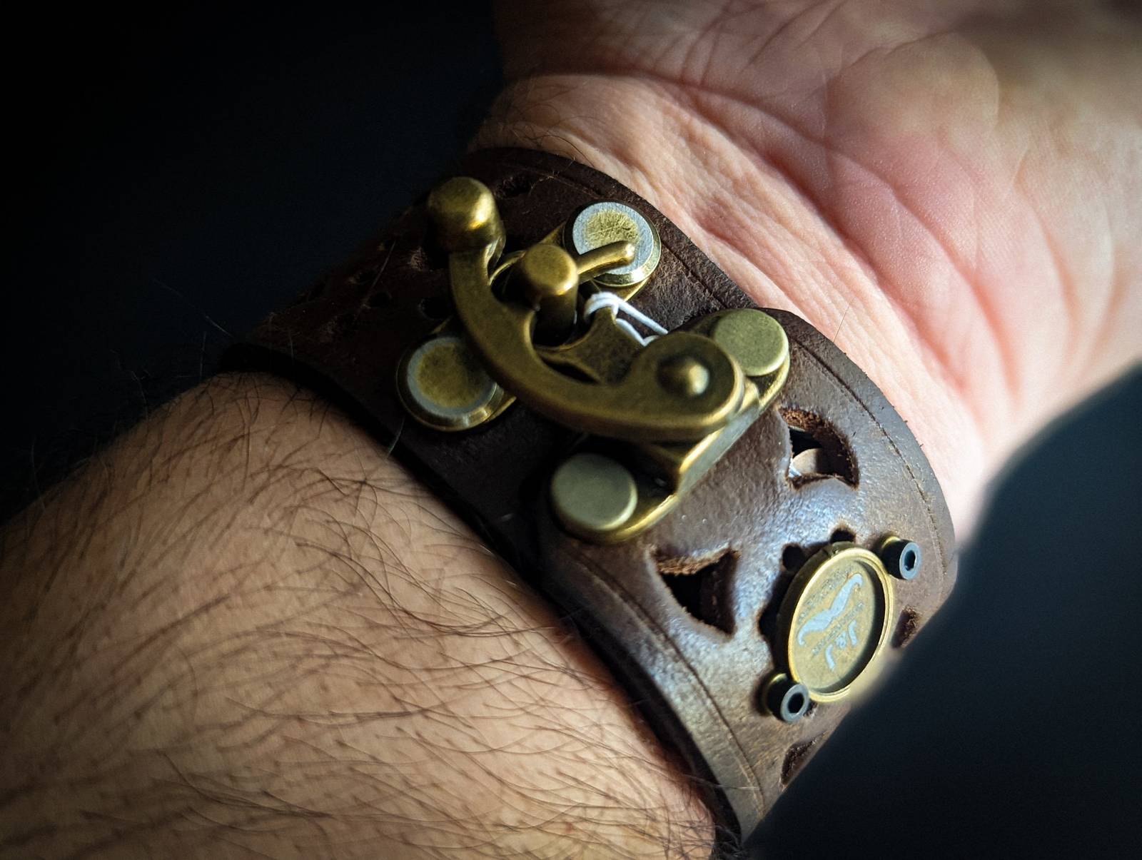 - Unique / one-of-a-kind steampunk wristwatch leather cuff