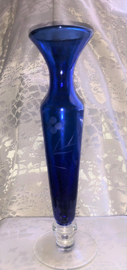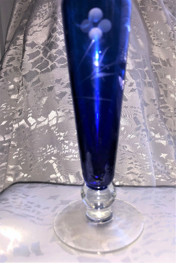 What a gorgeous cobalt vase with a clear foot. This one features a polished little accent flower in the middle that you can barely make out because it's so subtle. We like that, subtle, understated yet so pretty! If you are a collector of cobalt or just love beautiful vases, this might be the purchase for you.