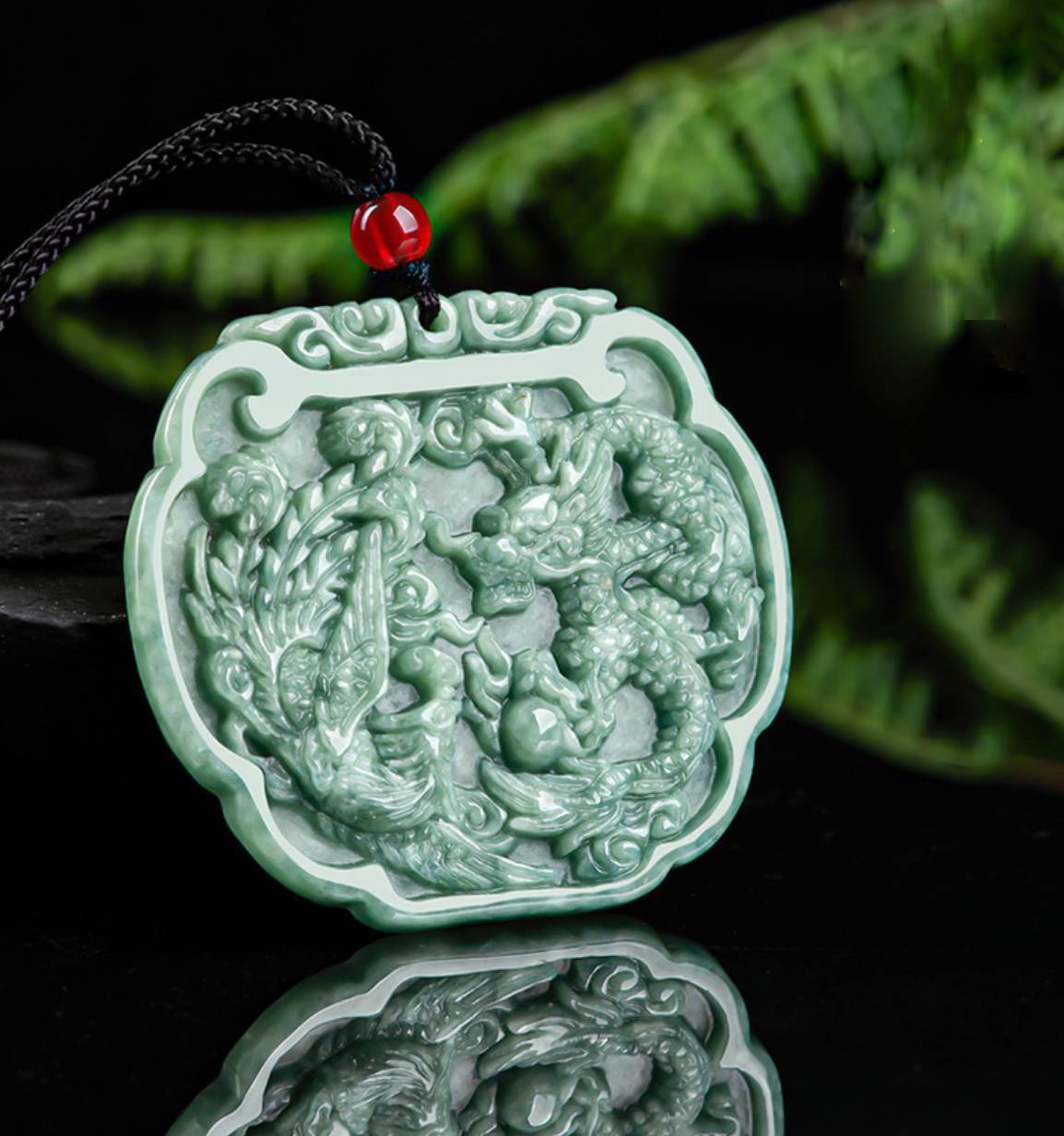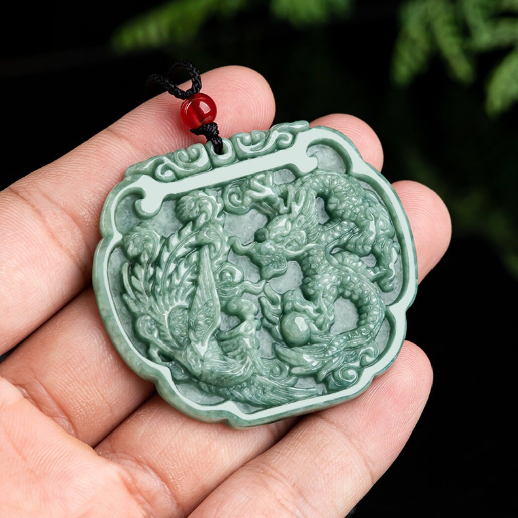 Natural Myanmar Jade Dragon and Phoenix Pendant Necklace, Gift for Woman