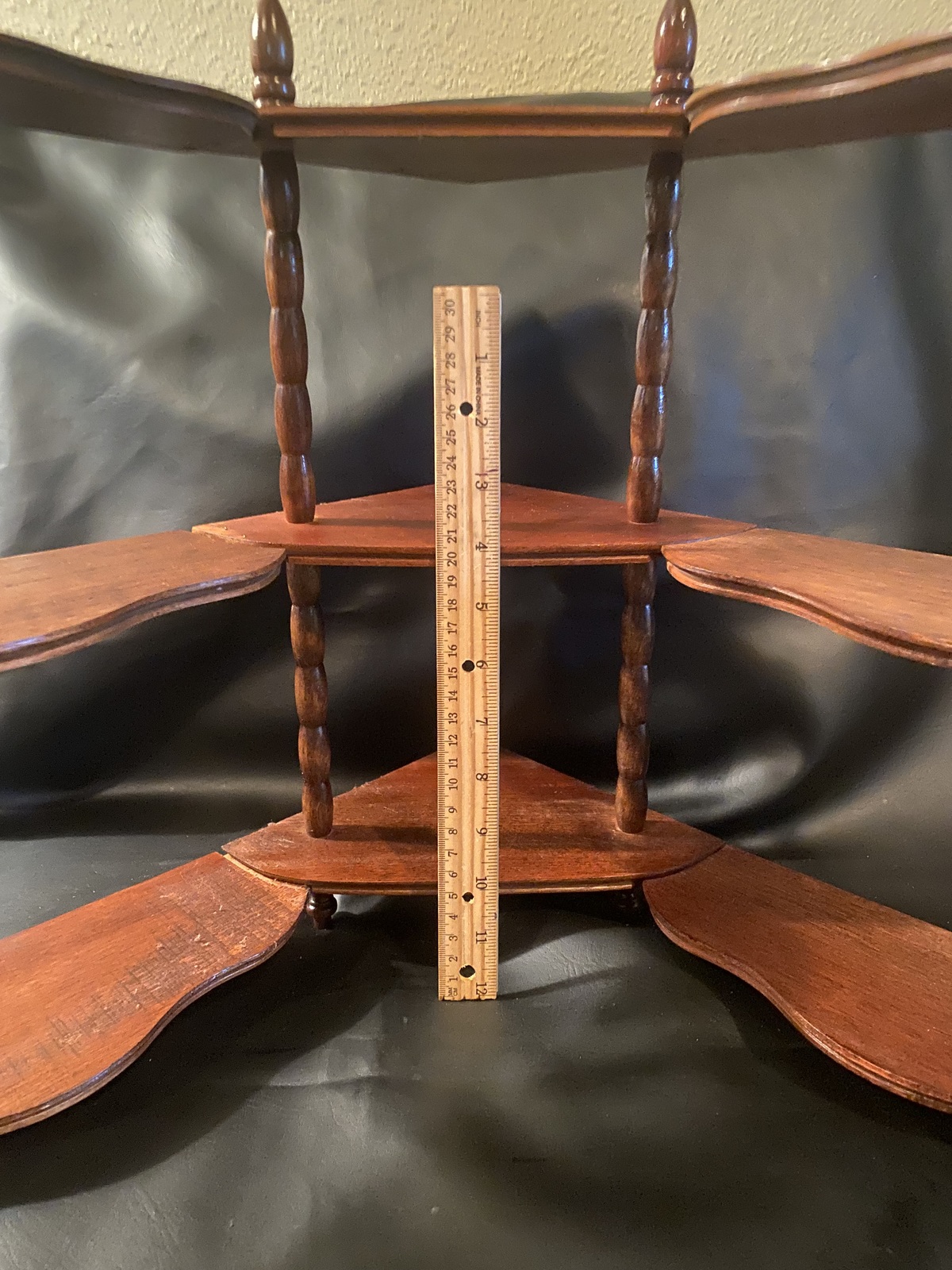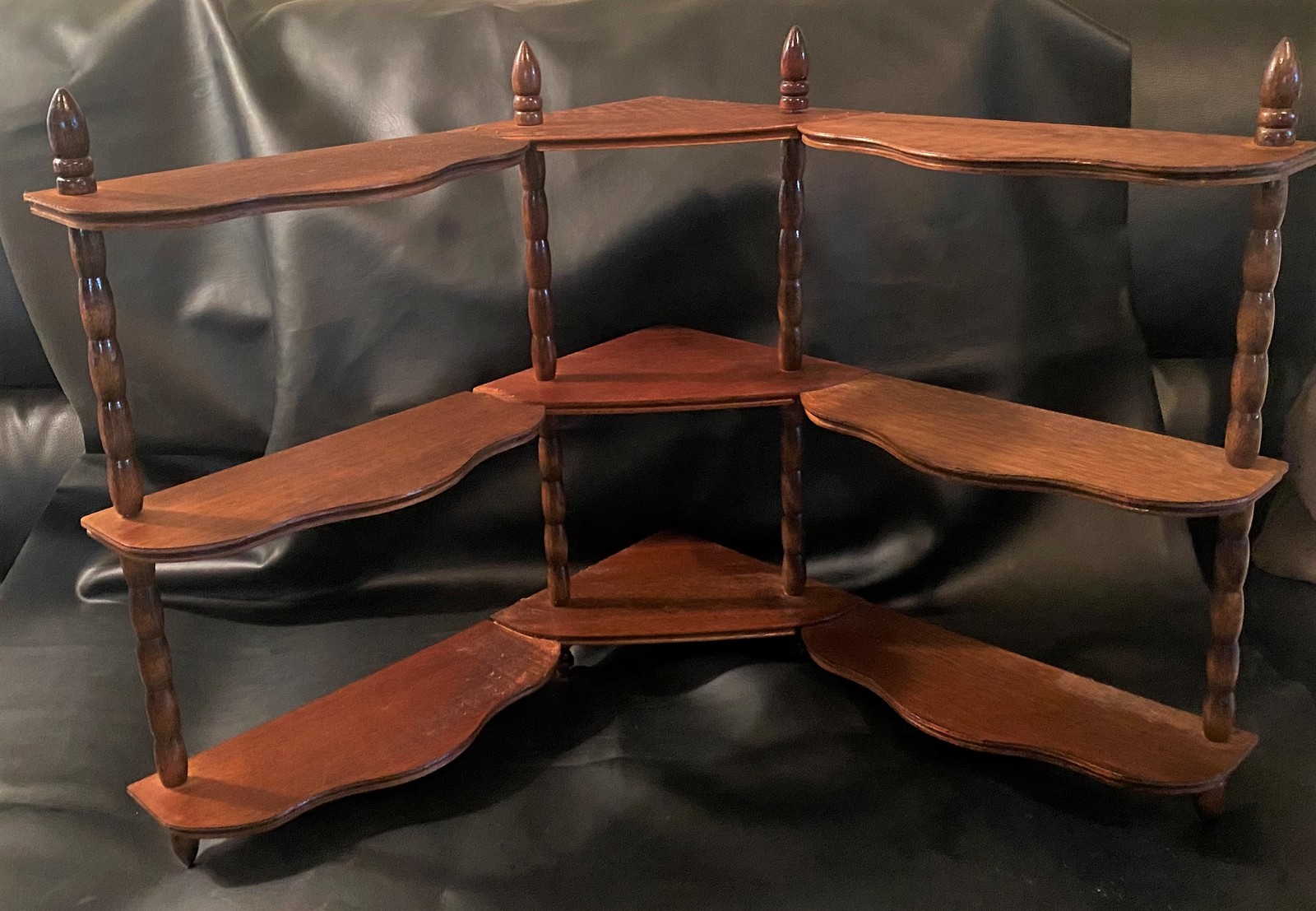 This three shelf corner display is truly a lovely survivor as well as a reminder of a simpler time when even simpler things were very well made. It's all wood and quite sturdy. A quick reminder that to keep shipping costs low this unit will ship unassembled. But don't worry it has a very simple straightforward assembly.