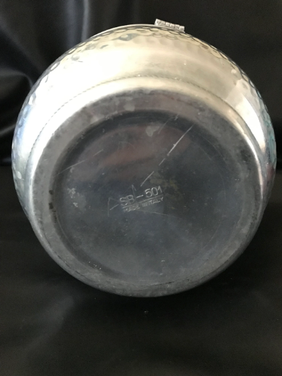 This 1960s Italian aluminum ice bucket is a classic example of mid century design. It's a light weight and very functional design. It works quite well for keeping a couple of ice trays of ice cubes frosty cold. Imagine that! Please see our pictures.