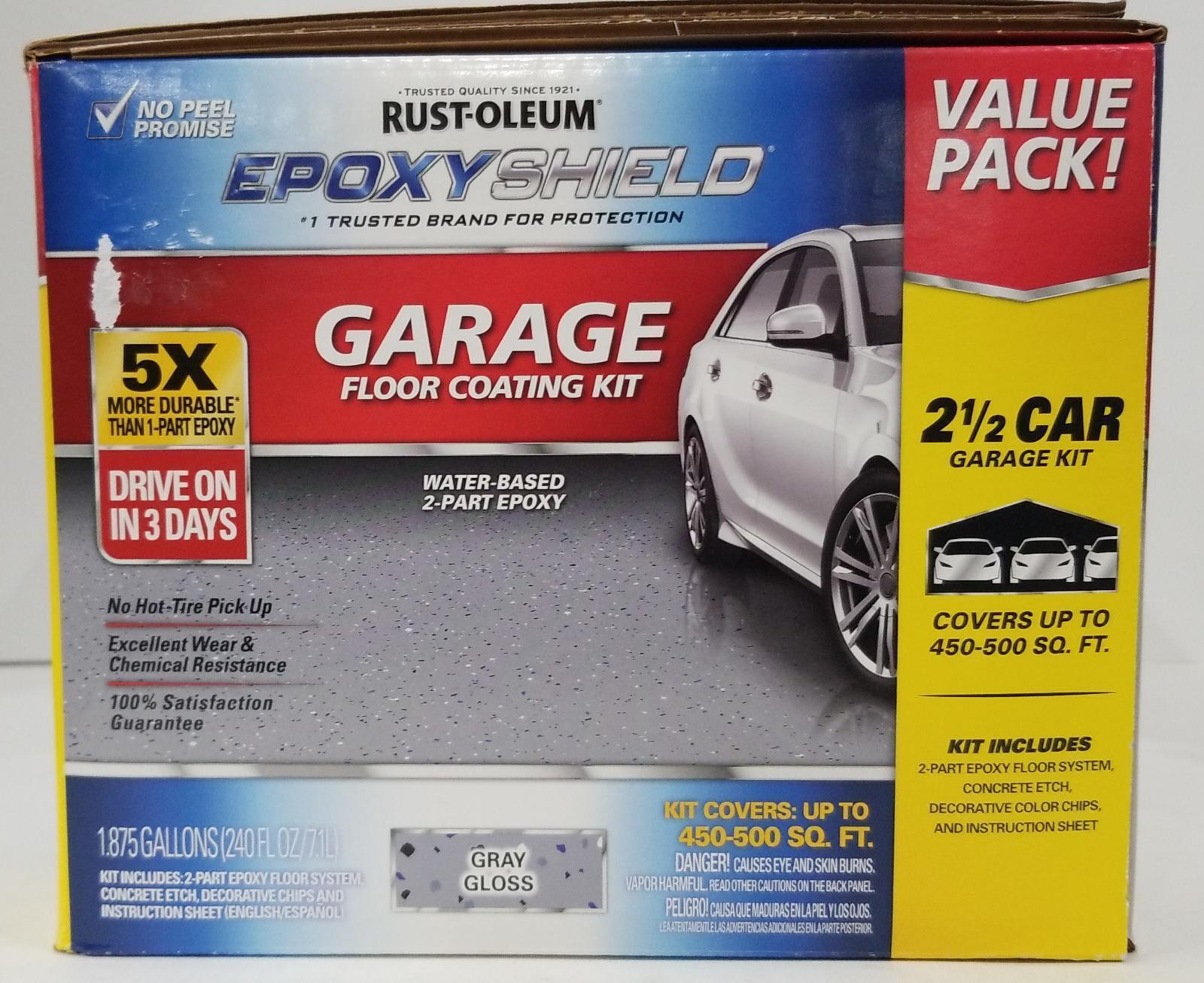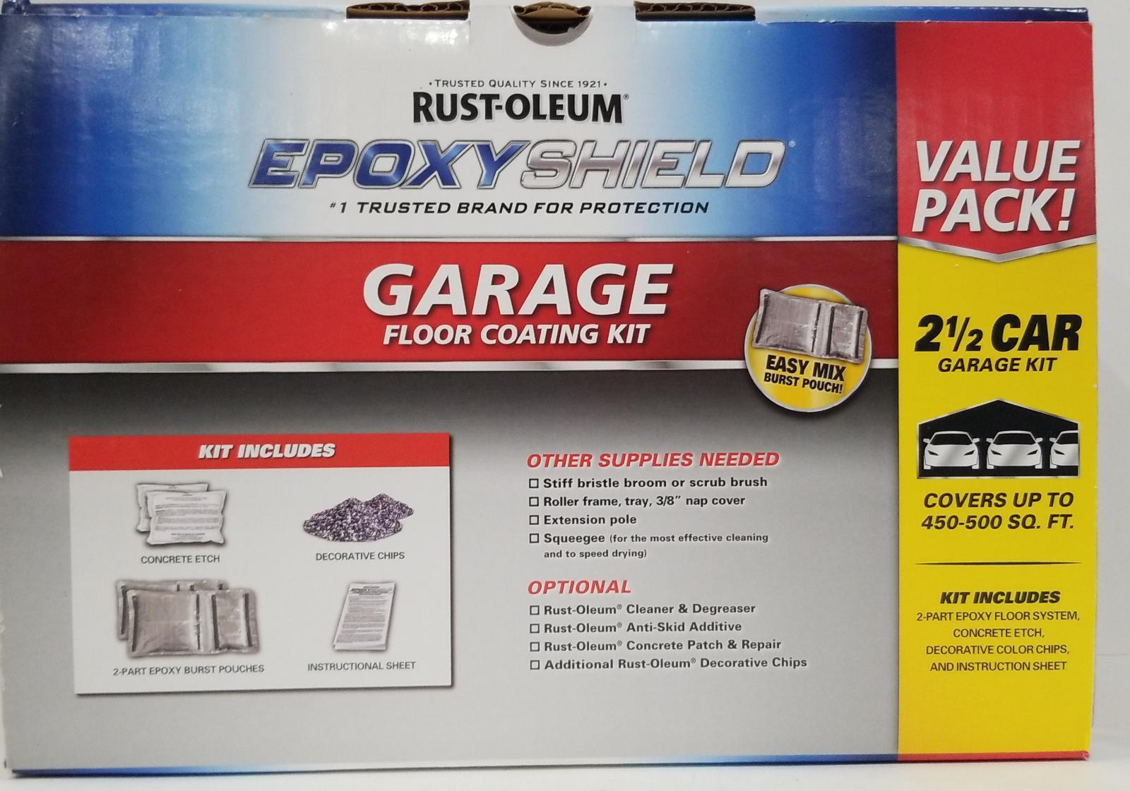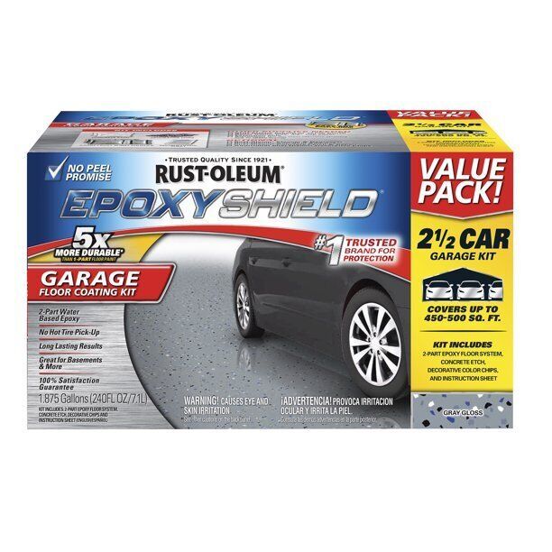 Rust-Oleum EpoxyShield Garage Floor Coating Kits brighten up your garage space with a clean, glossy, showroom quality floor. Kit includes 2-part epoxy burst pouch, concrete etch, decorative chips and detailed instructions. Waterproofing sealer is 5X more durable than standard 1-part epoxy coatings on interior concrete floors. Achieve professional looking results and long lasting protection with EpoxyShield garage floor coatings.