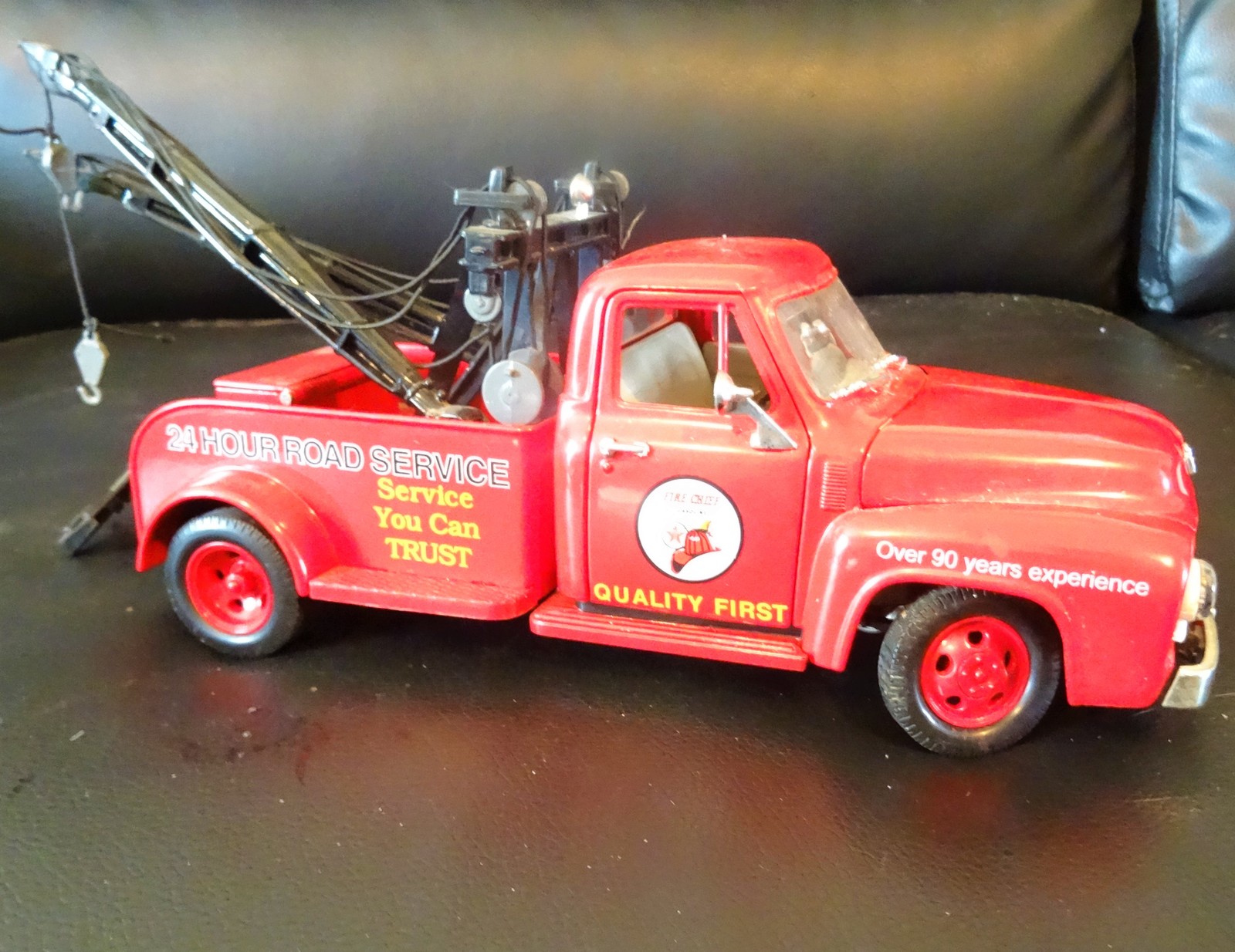 This listing features a Gearbox 1953 Ford F-150 Tow Truck 1:24 Scale Diecast Coin Bank. The item is in very good condition. There is no box.