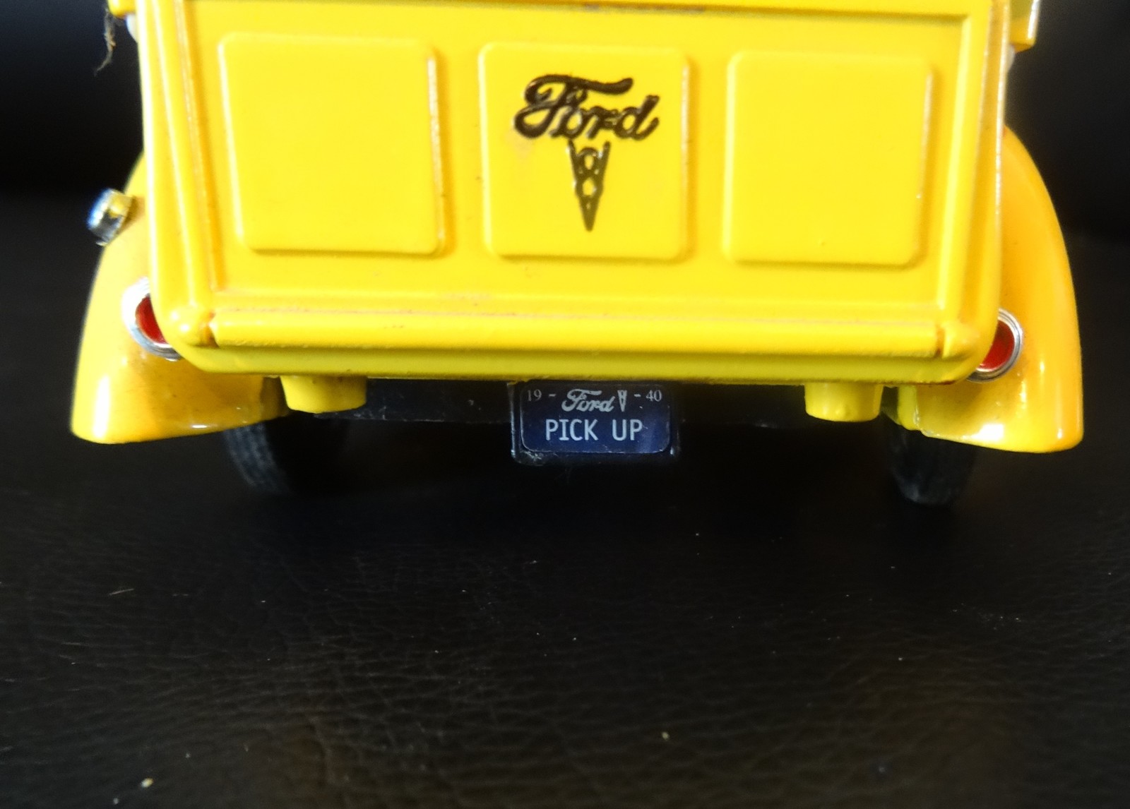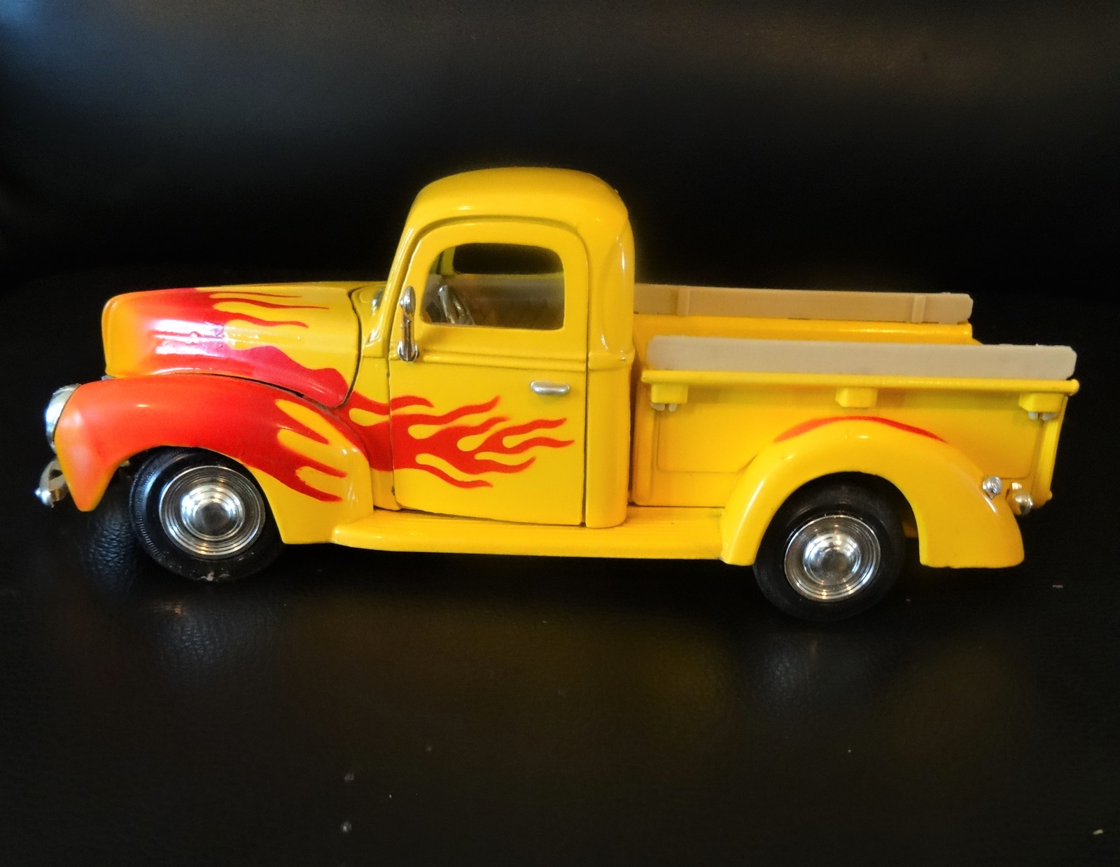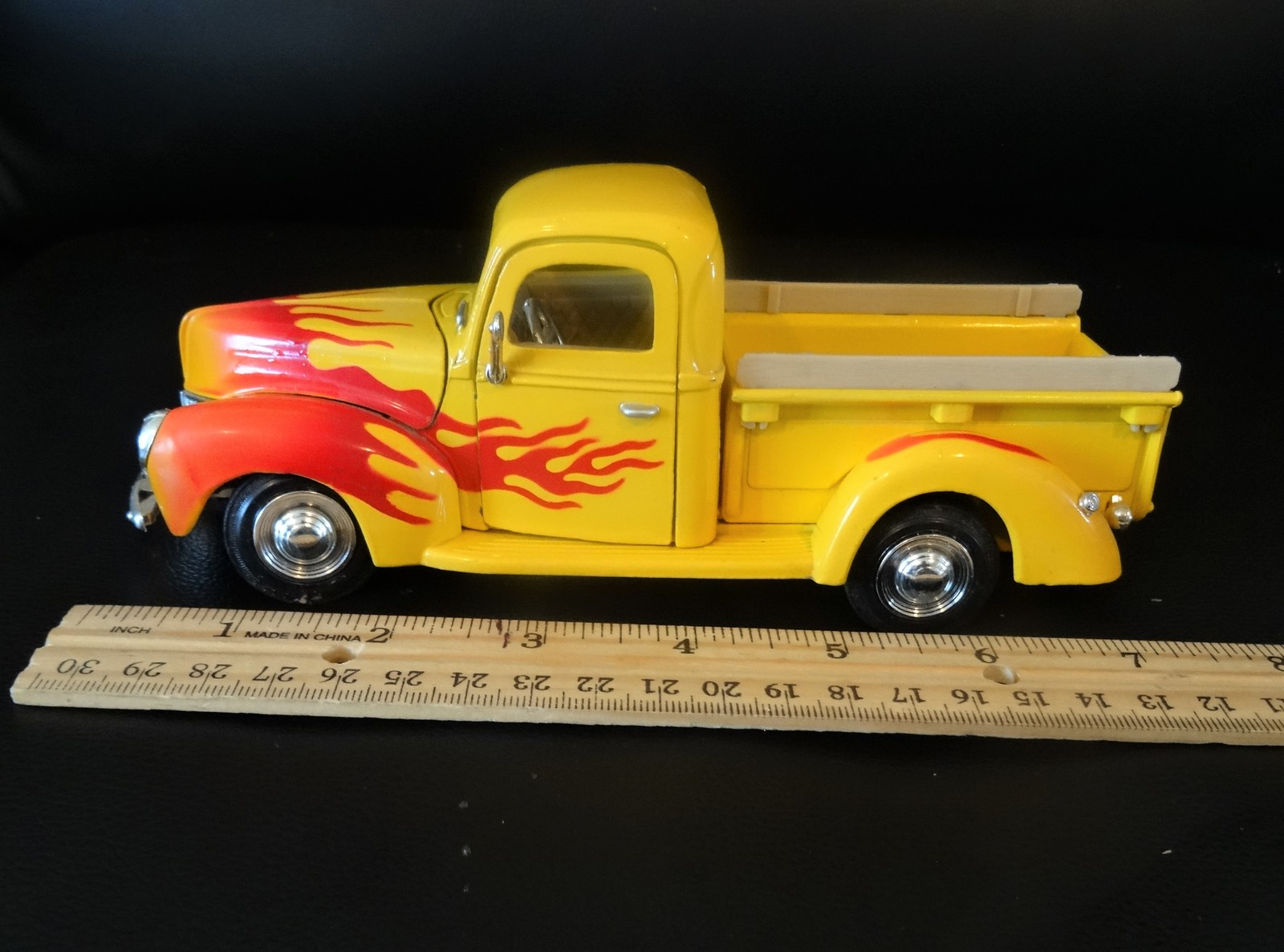 Details, details, and more details, this beautiful Red flames on yellow body Diecast 1:24 Scale Model of a 1940 Ford Pickup Truck has a lot of details and great looks to boot~! The doors open, the hood opens and she rolls well. We love her, what do you think? We're fairly sure this was from the 1990's, it does not have a maker's name but it does say made in China. Hey, in this instance we're sort of amazed it was made there because the quality is pretty amazing.