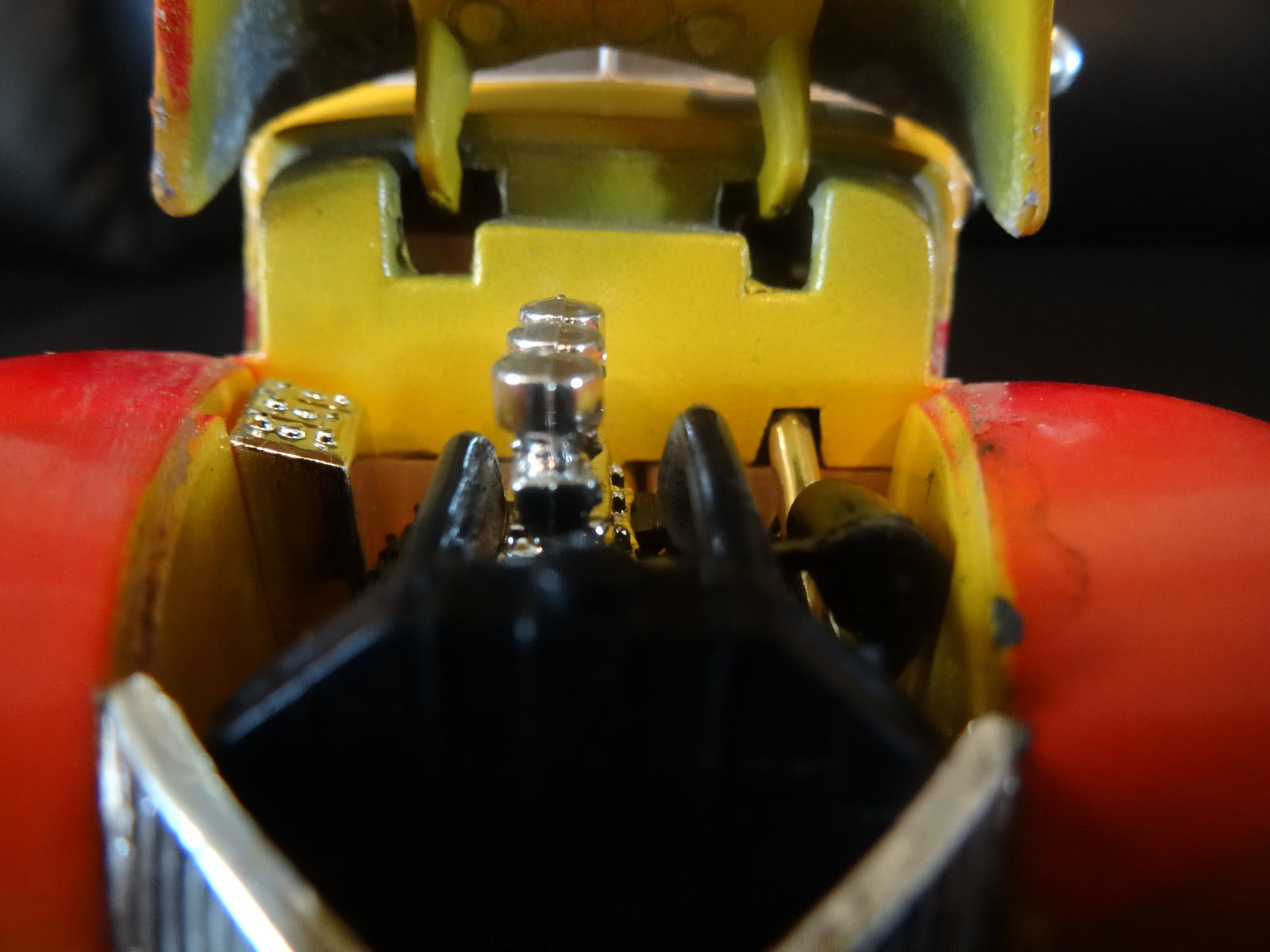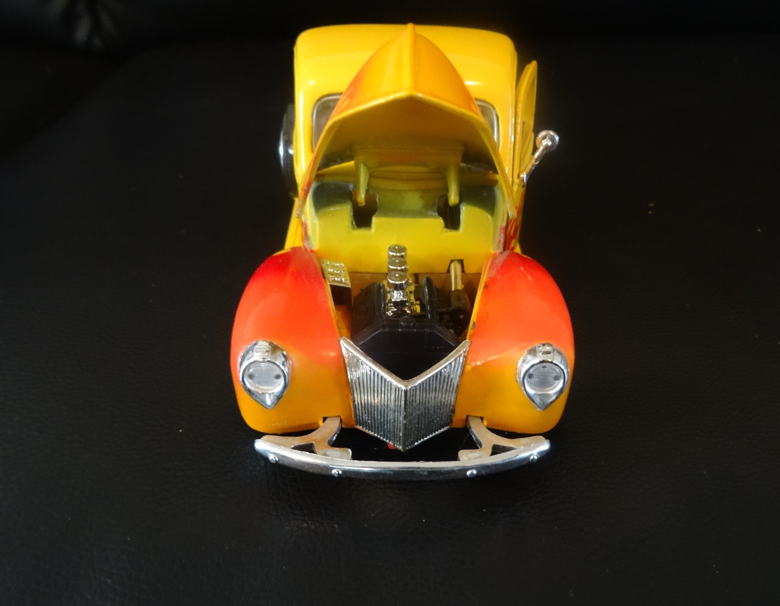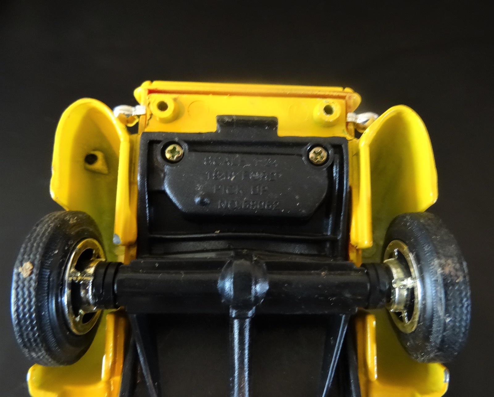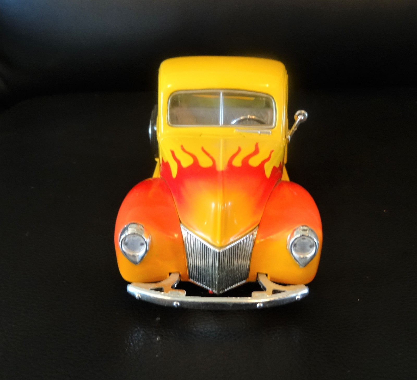 Details, details, and more details, this beautiful Red flames on yellow body Diecast 1:24 Scale Model of a 1940 Ford Pickup Truck has a lot of details and great looks to boot~! The doors open, the hood opens and she rolls well. We love her, what do you think? We're fairly sure this was from the 1990's, it does not have a maker's name but it does say made in China. Hey, in this instance we're sort of amazed it was made there because the quality is pretty amazing.