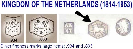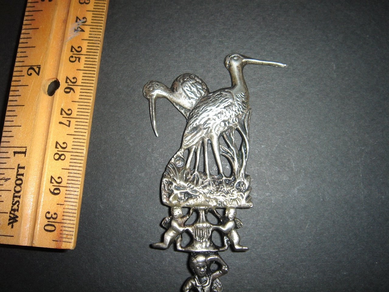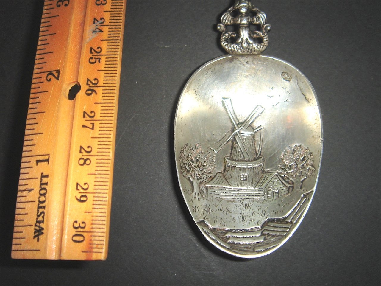 Weighing in st 2.61 ounces of pure, hallmarked, Sterling Silver this amazing and peculiar Dutch fertility spoon has a whole lot going on. Not only do you have one stork on the top but two and they are both being held up by two adorable cherub angels. Underneath them you have a young lad looking out to the future with one hand and with the other hand he's clutching a sword. Next, all of that is followed by four double twists on the handle and then at the bottom another cherub. In the spoon bowl itself we have a classic scene of a Dutch windmill surrounded by trees. Also in the bowl of the spoon there are little tiny birds next to its hallmarked silver mark which we have pictured in a close up for you.