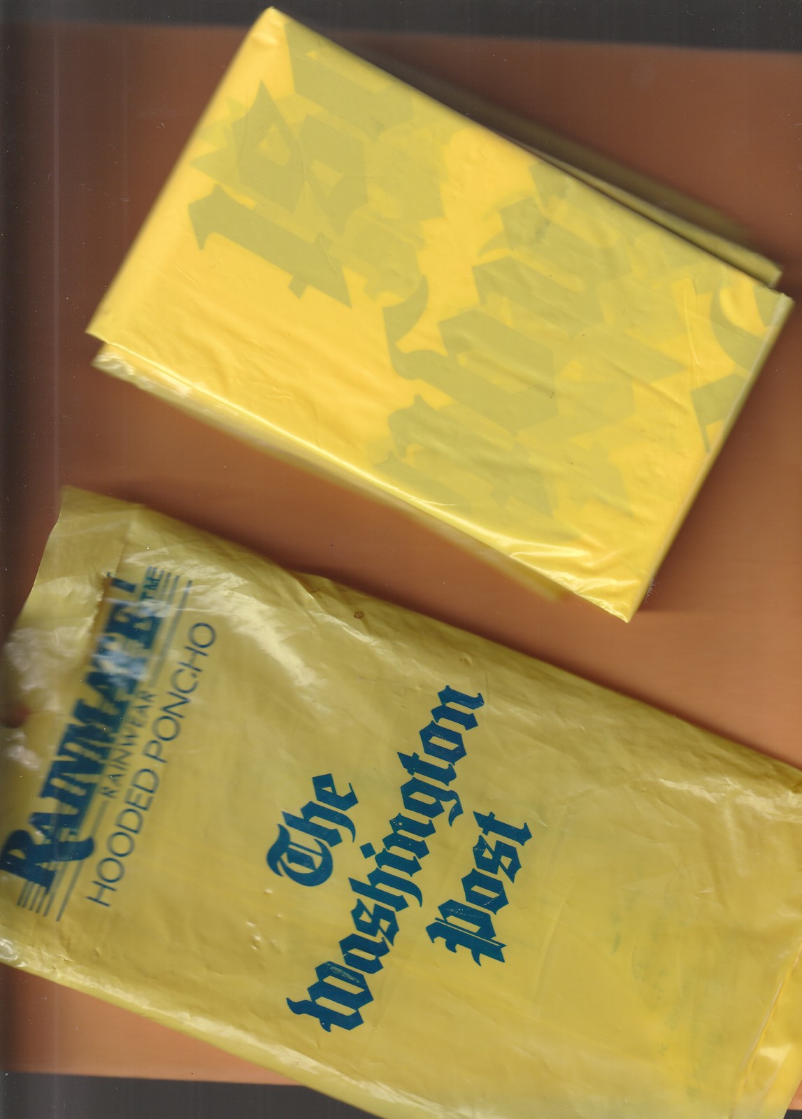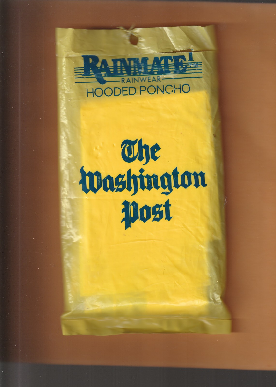 This is a New in open pack, Collectible yellow Hooded Poncho from the 1990's design with logo The Washington Post in large dark Letters. This Promotional piece design with neck drawstring, made by Rainmate Rainwear Seven Sons in Taiwan. As you can see the outside of pack has faded letters due to storing long term. But the inside Rare 1990's Poncho is New, Mint Unused Condition. It is made for Male or Female. Any questions, contact.