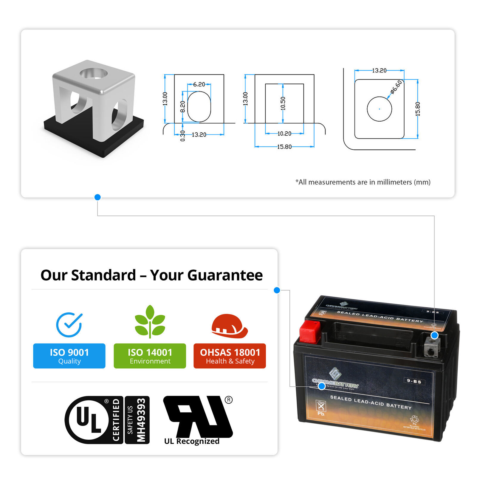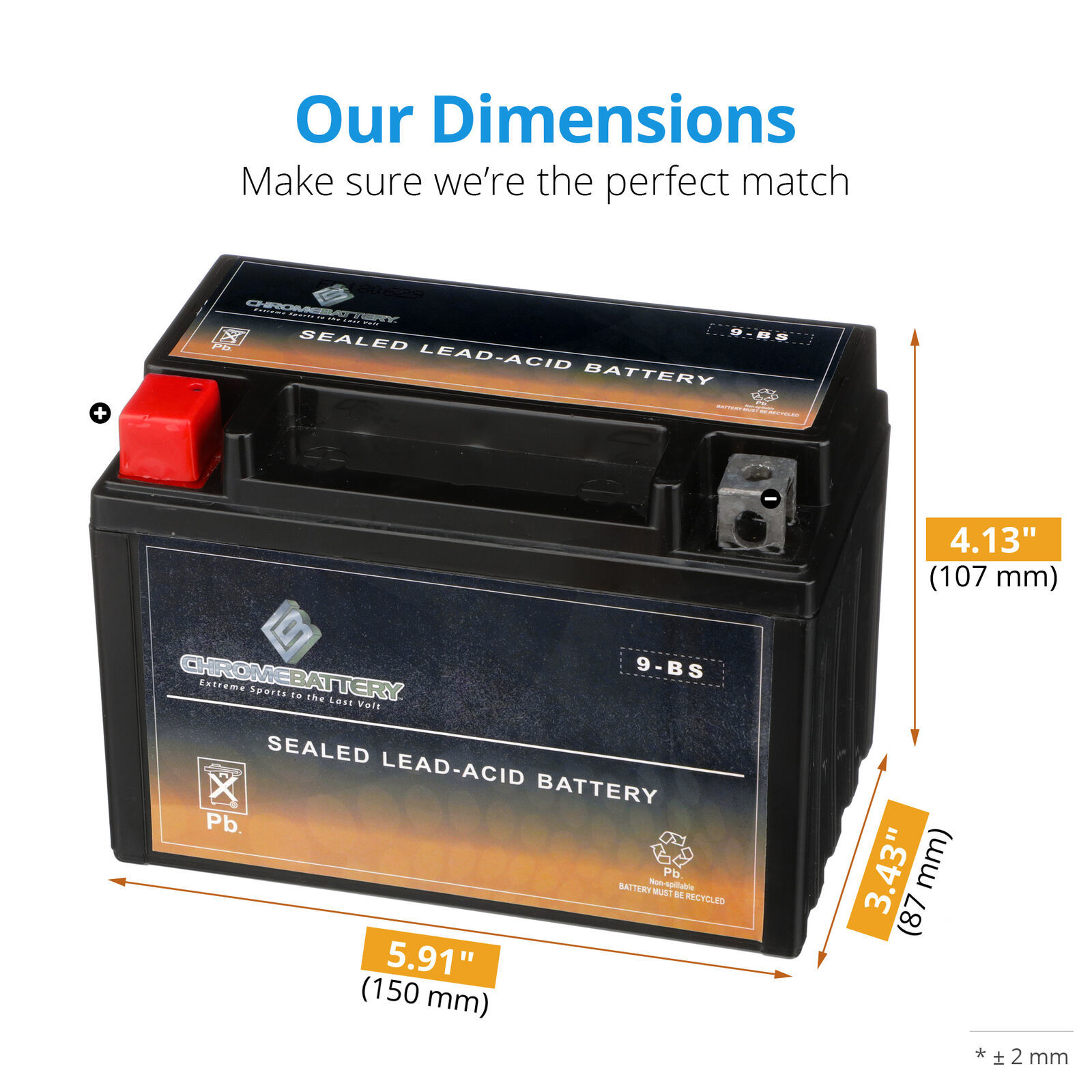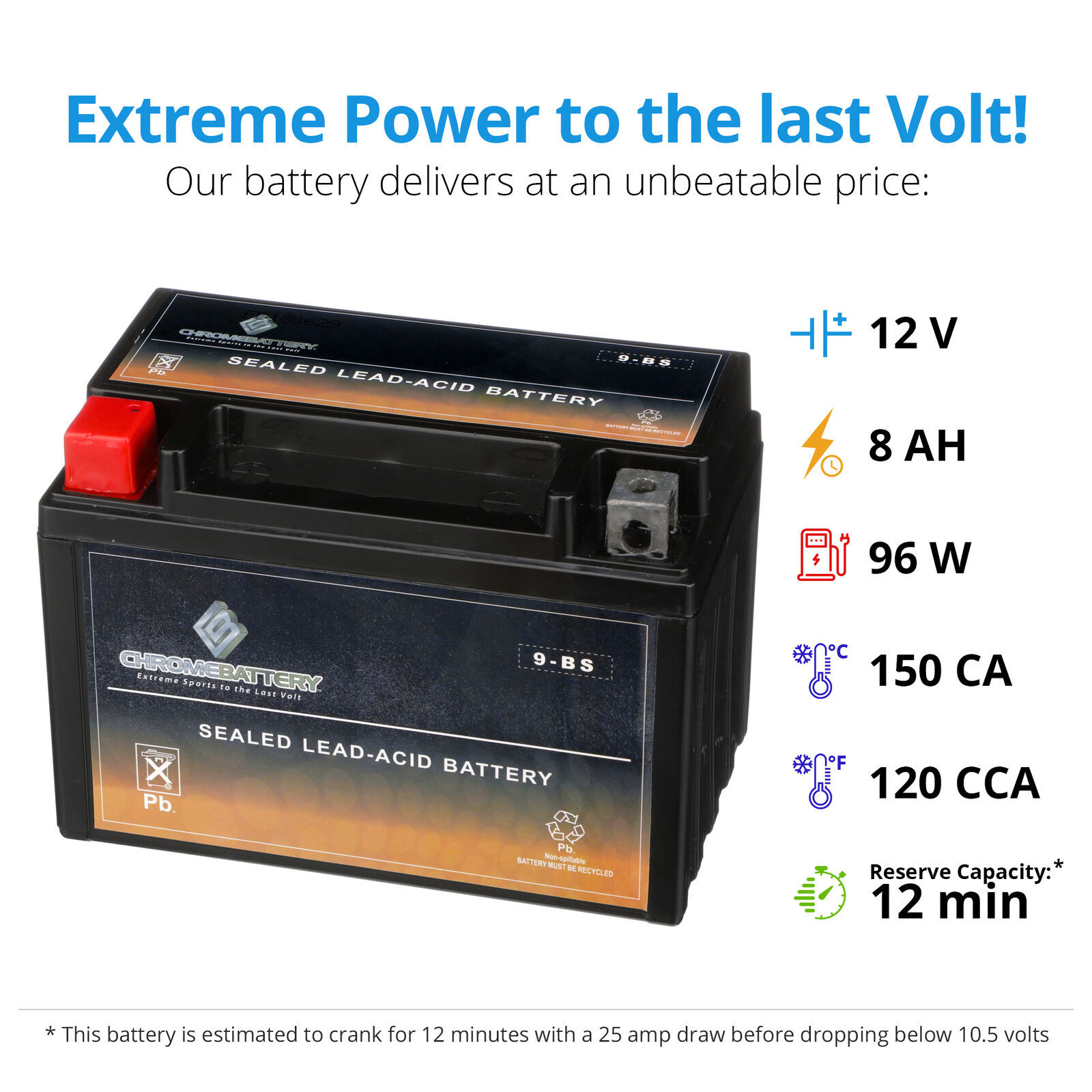 YTX9-BS sealed AGM batteries by Chrome Battery Battery are constructed with lead calcium alloy and absorbed glass mat technology that allows for a completely maintenance-free and high-performance operation. All YTX9-BS Chrome Battery Battery brand AGM batteries are manufactured with the highest quality materials and rigorously tested to ensure safety, OEM compatibility, effectiveness and optimal performance. Extremely Fast Free Shipping. 60-day no questions asked money-back guarantee. 24-Month warranty.