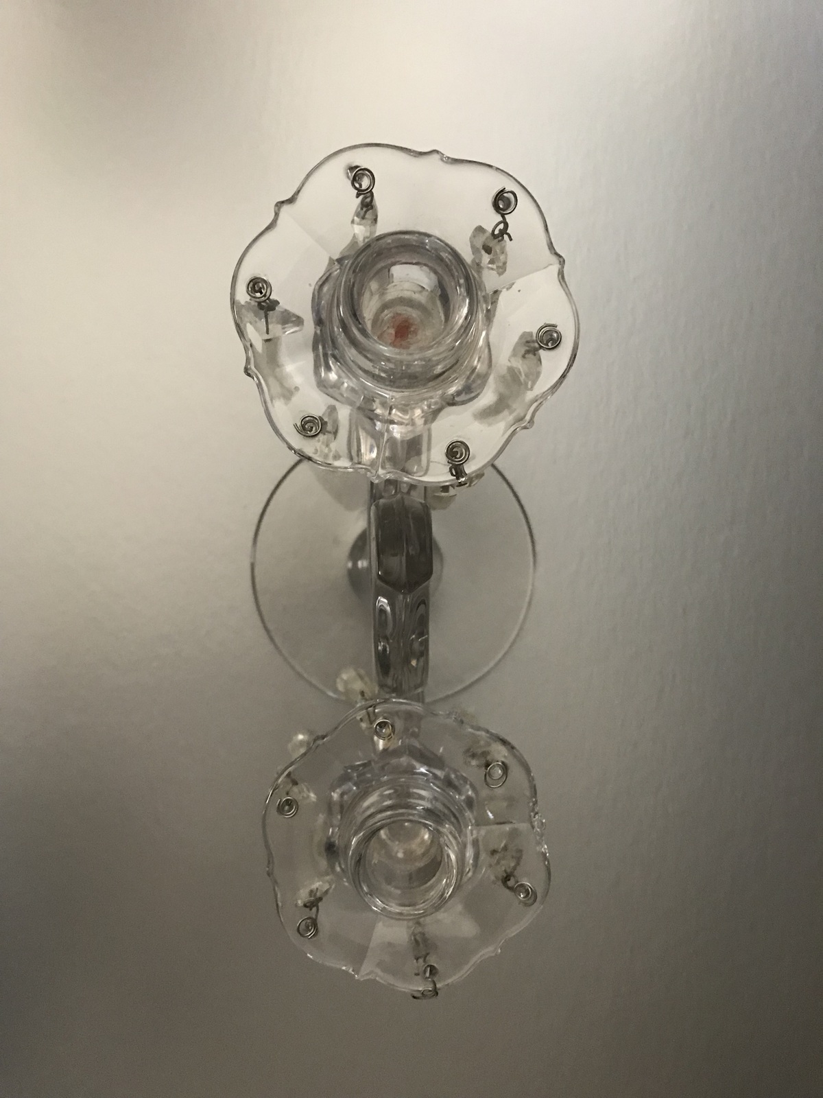 This Fleur Di Lis candelabra is a beautiful Art Deco piece that somehow survived perfectly intact to live on all these many years later. We think that it's beautiful and it's got a whole lot of sparkle with all its lovely crystals hanging from it's Fleur-de-lis center piece, although this Fleur-de-lis has been highly stylized. You may ask; What in the world is a Fleur-de-lis? Answer; The Fleur-de-lis is a lily that is used as a decorative design or symbol. The Fleur-de-lis has been used as a symbol of hierarchy in numerous European nations throughout history, but it has been most particularly associated with France.