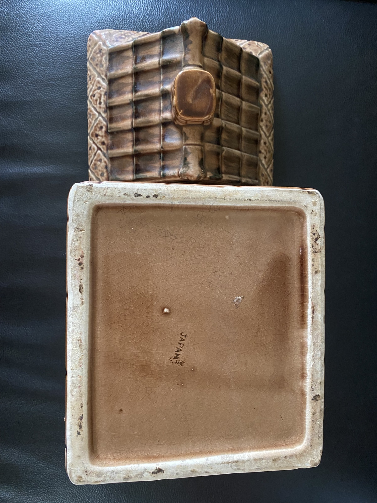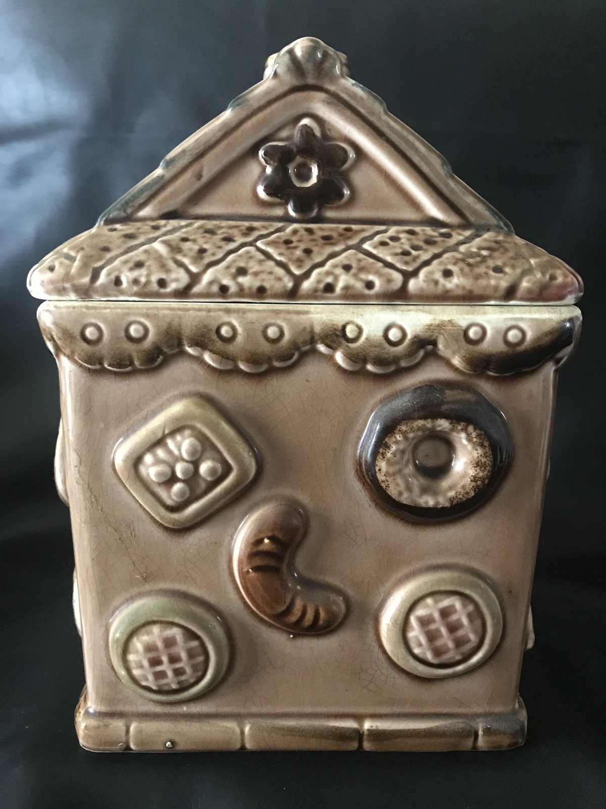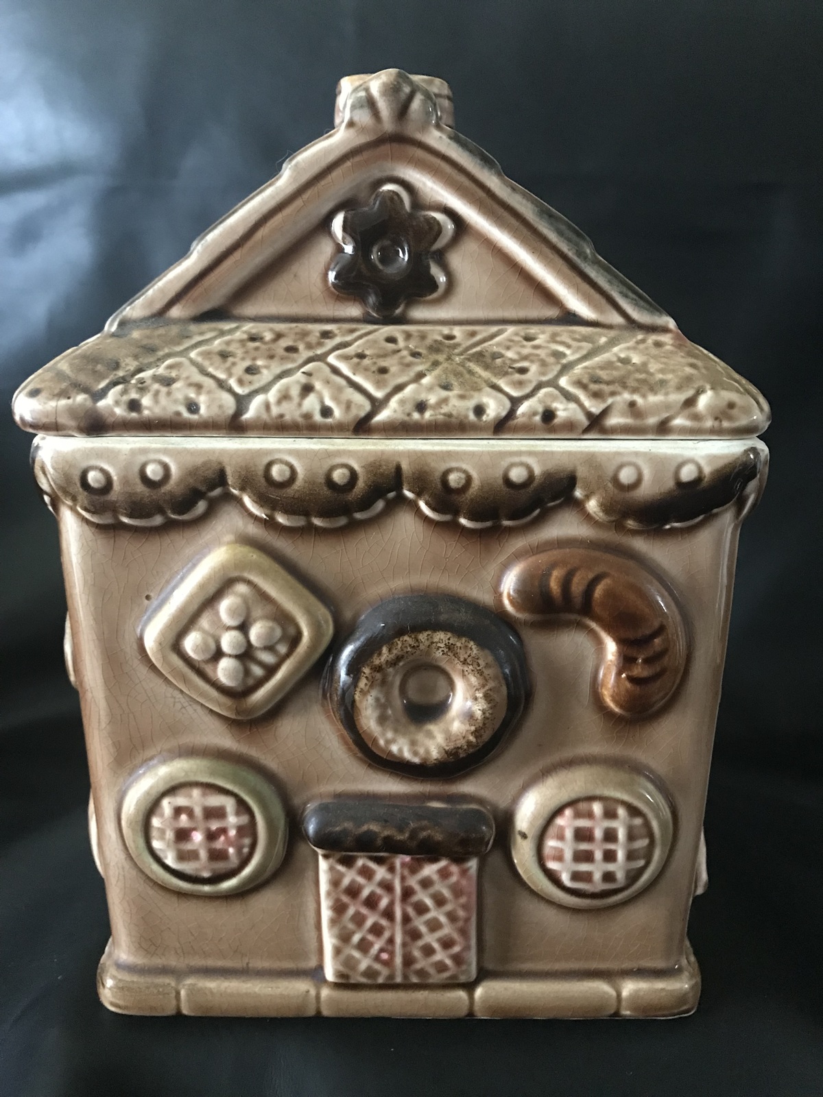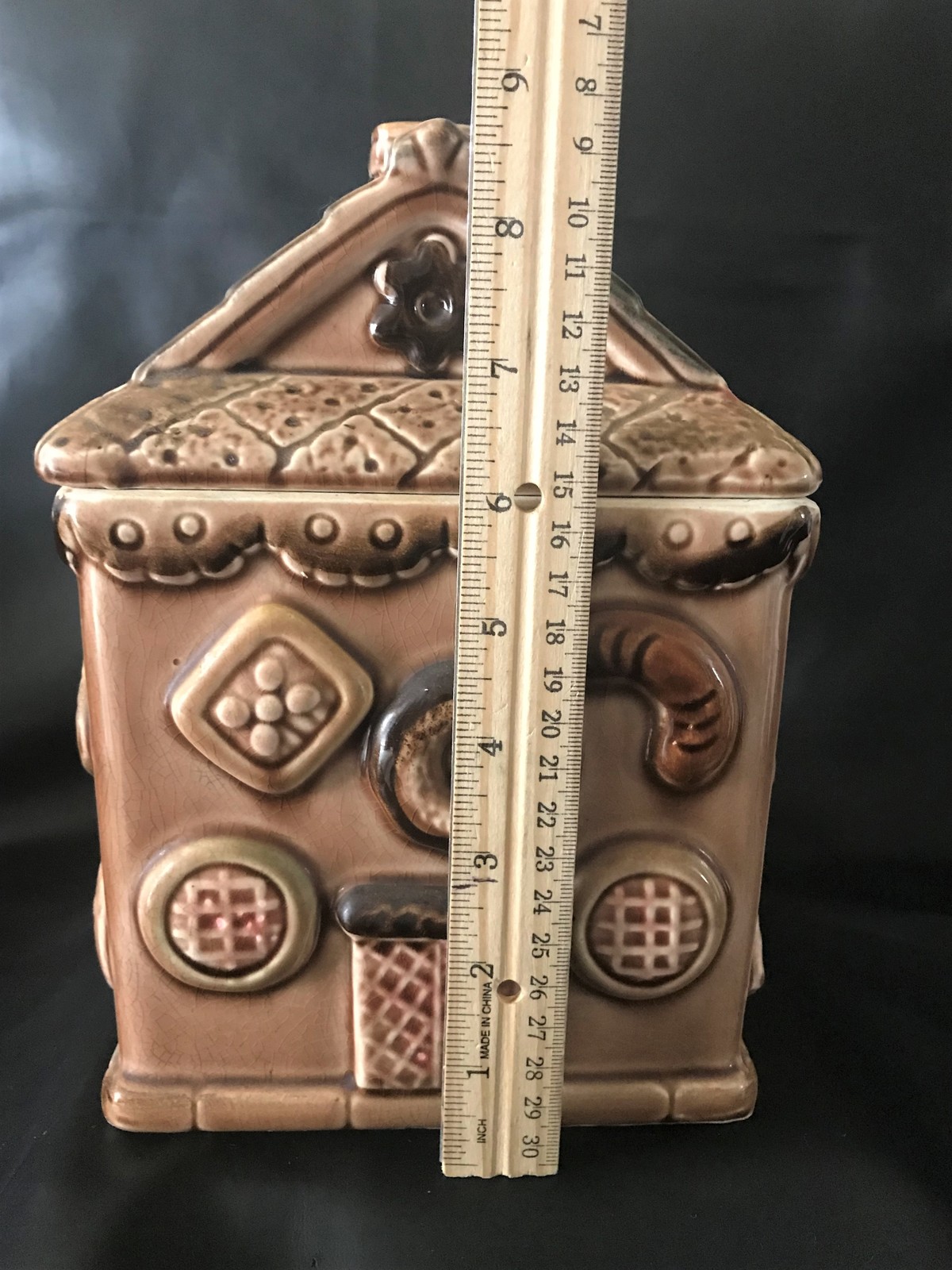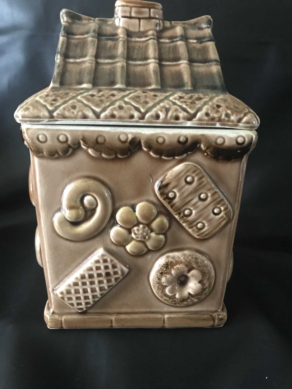 This listing features a classic, from the 1970's, Made in Japan, Ceramic Gingerbread House with cookies all over. It is in excellent non chipped, non cracked condition. We think that it's adorable.