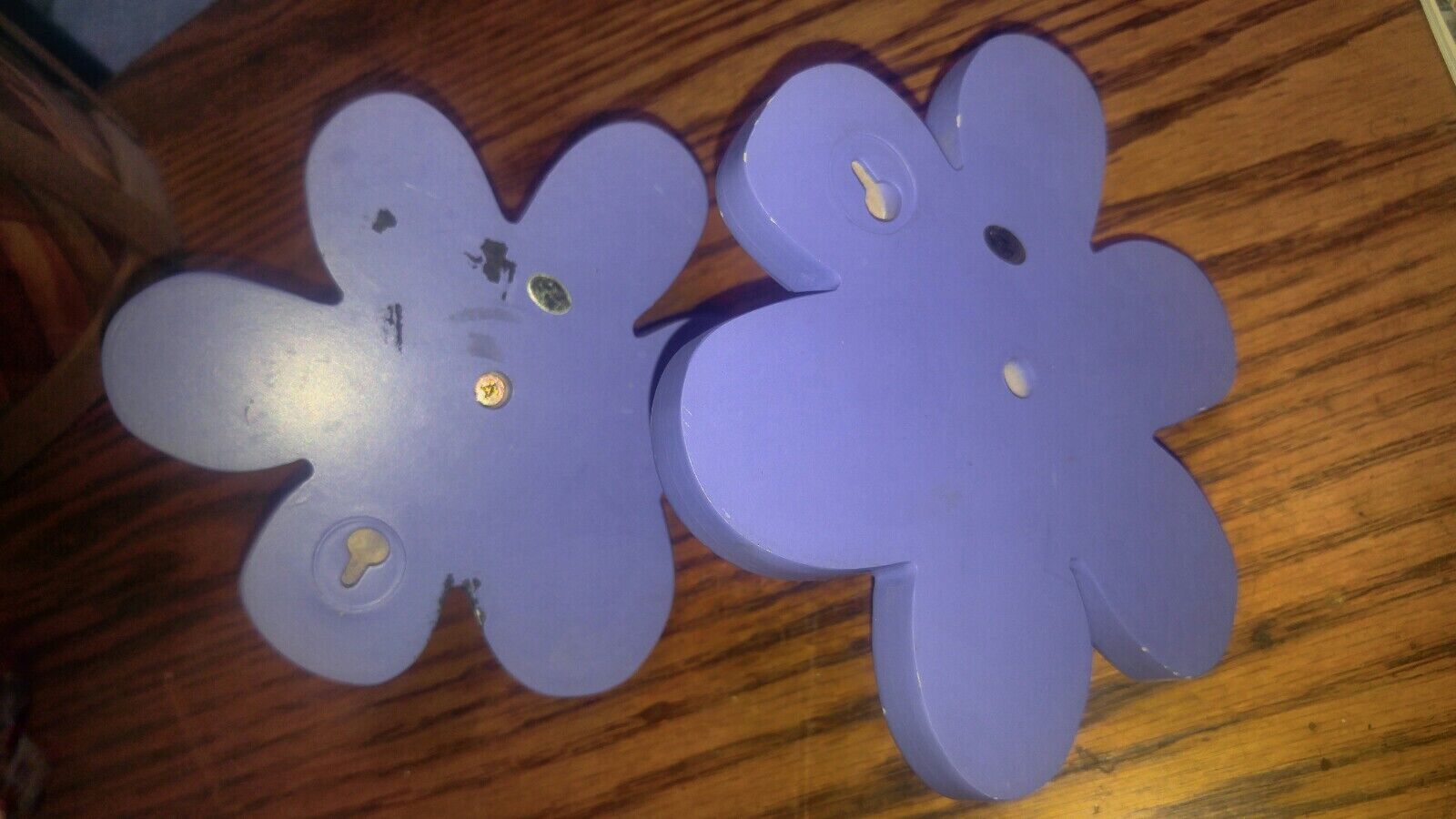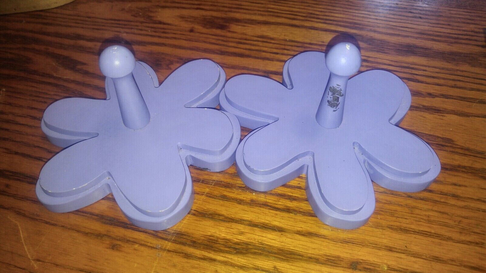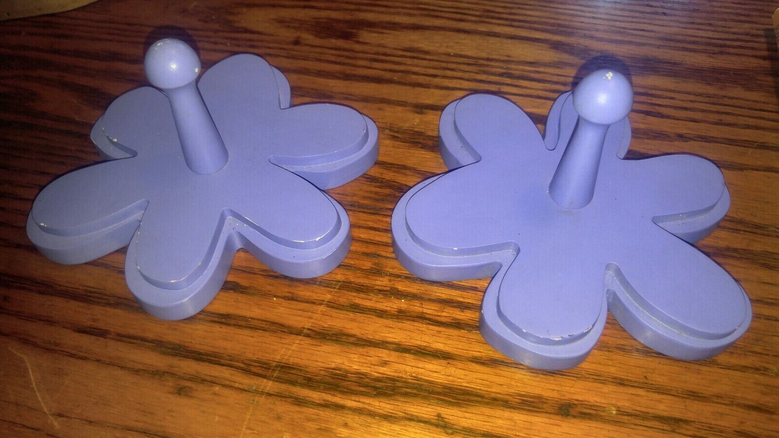 Pair of purple wall pegs. Flower shape. 5.5 inches across. 3 inches out from wall.