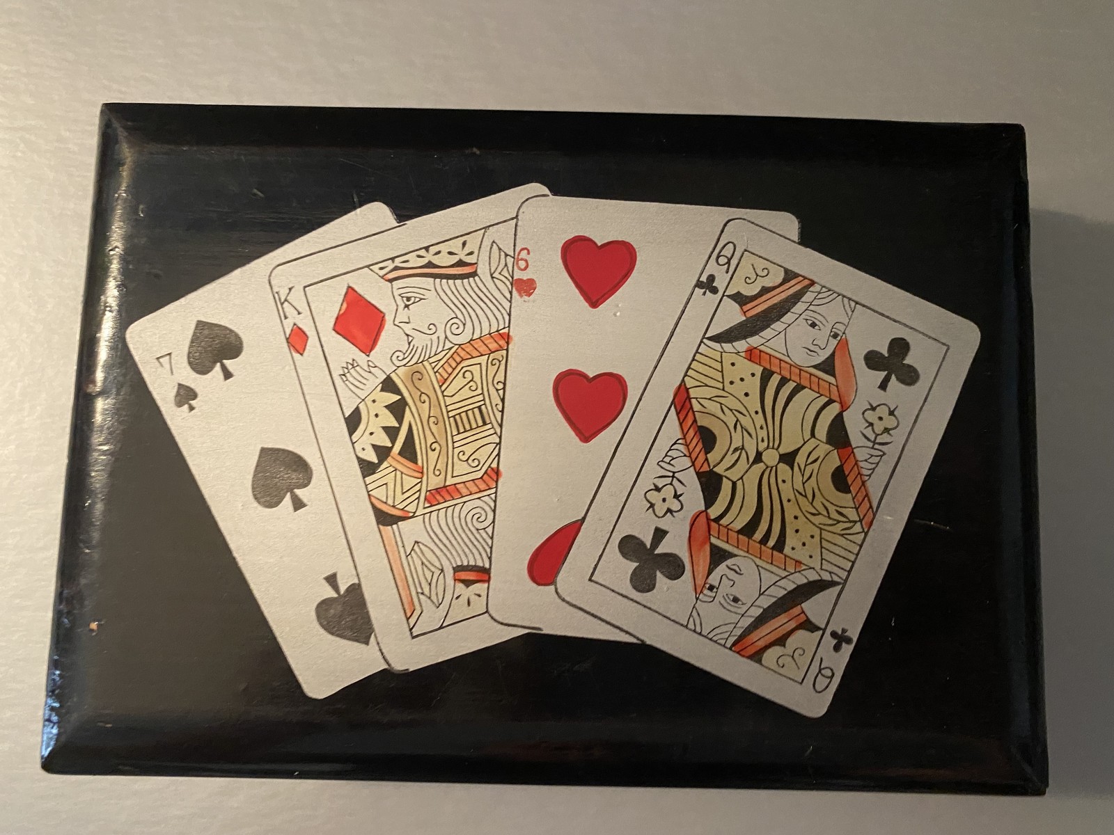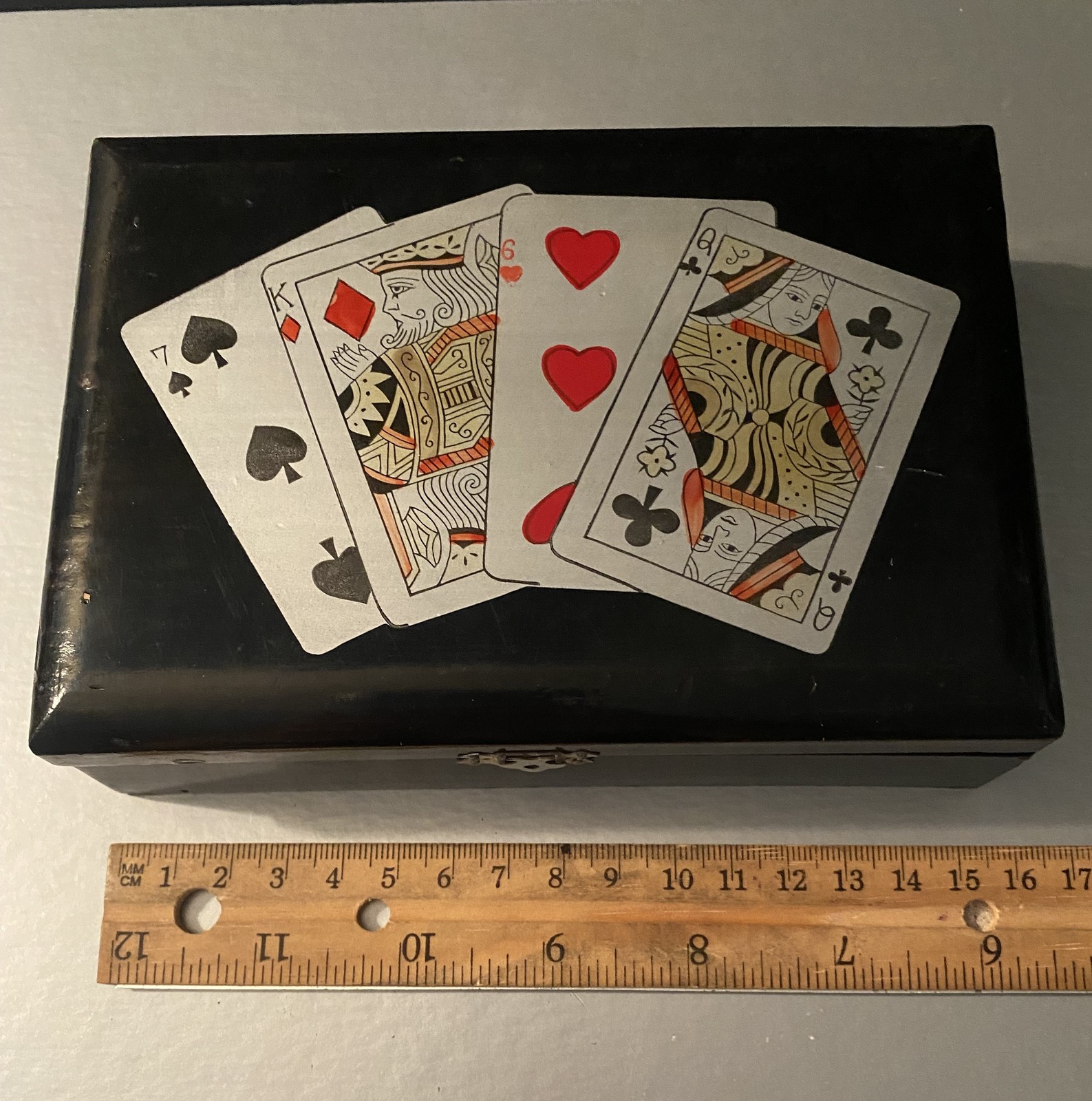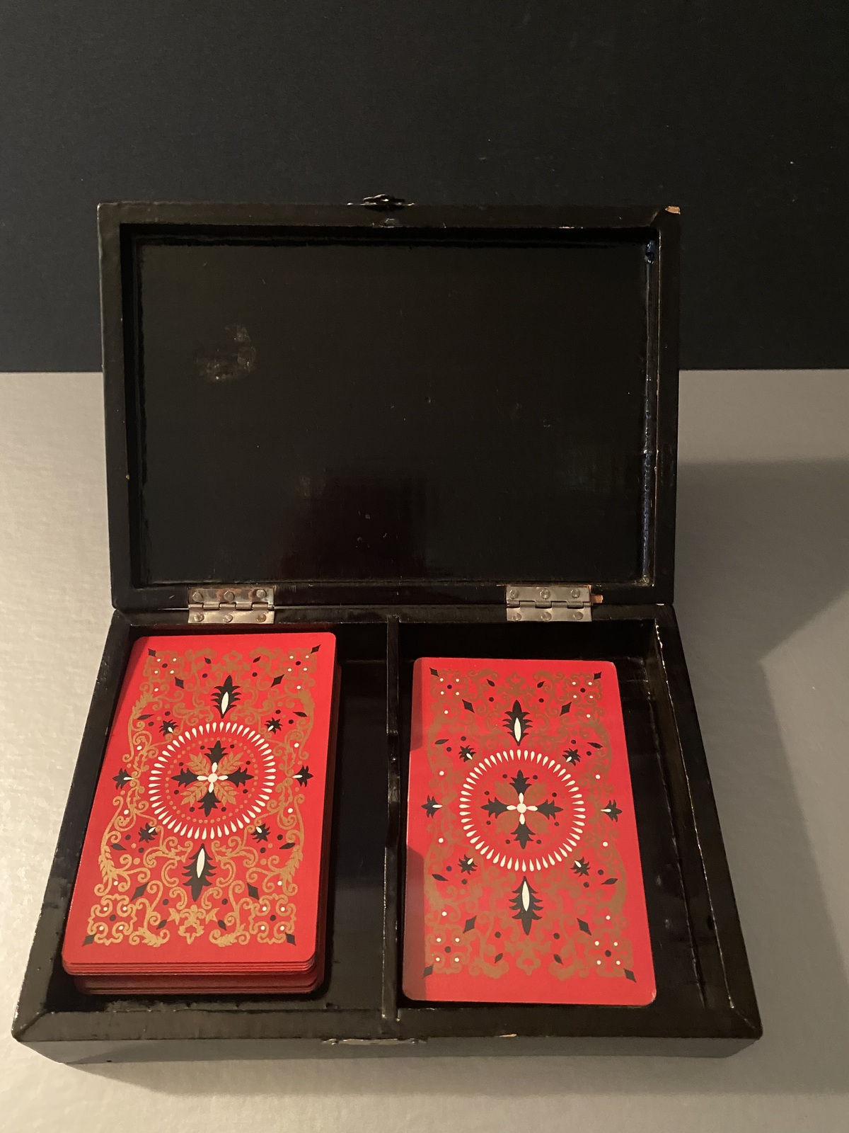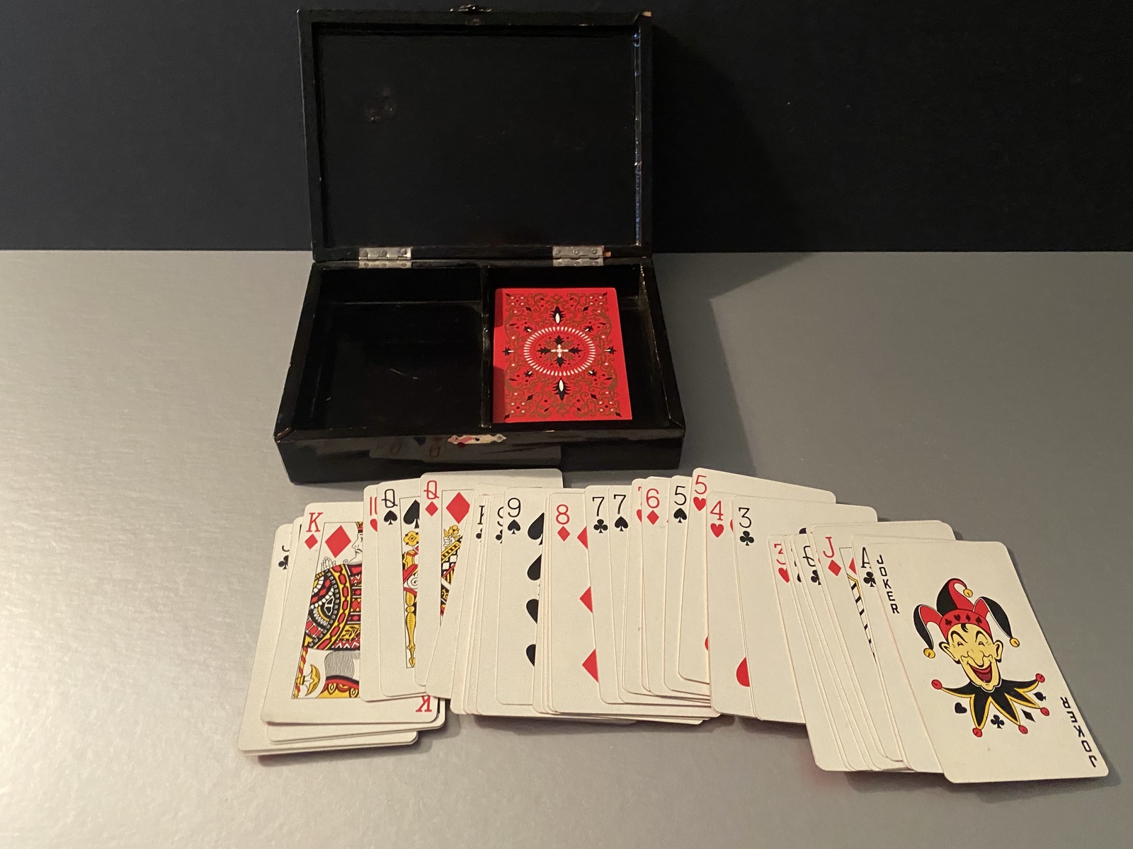 While there isn't a date on this box or playing cards we do believe that these are quite old. The cards are non-typical to modern cards. Our best guess is pre 1960's. The box and cards are in very good condition. Please see our pictures.