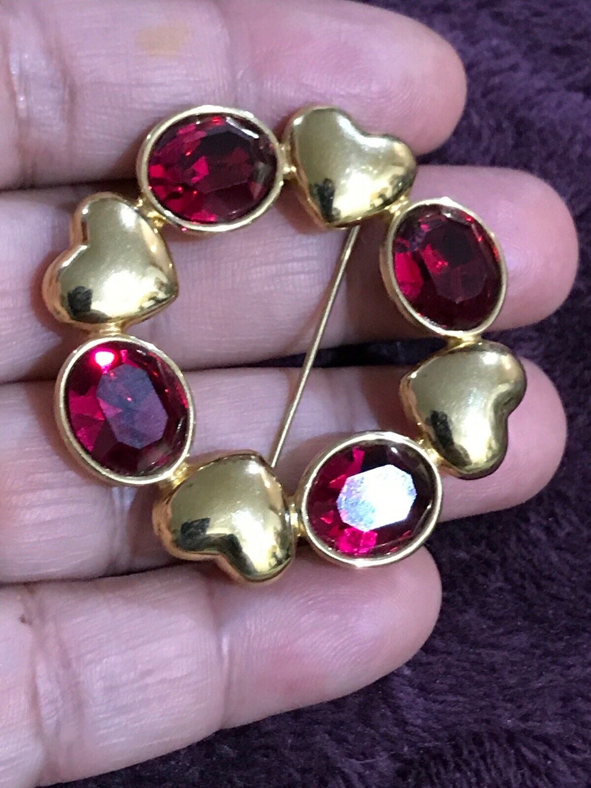 MONET Gold Tone Round Red Stones Hearts Brooch. Condition is Pre-owned. Shipped with USPS First Class Package.
