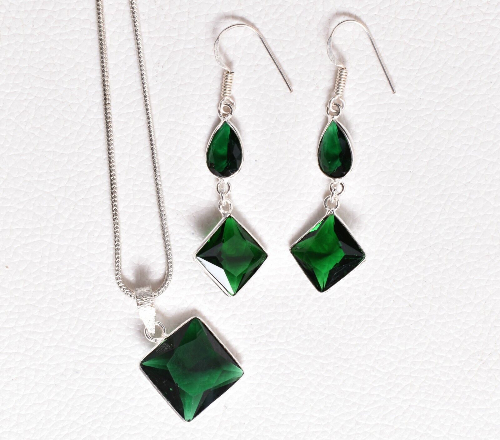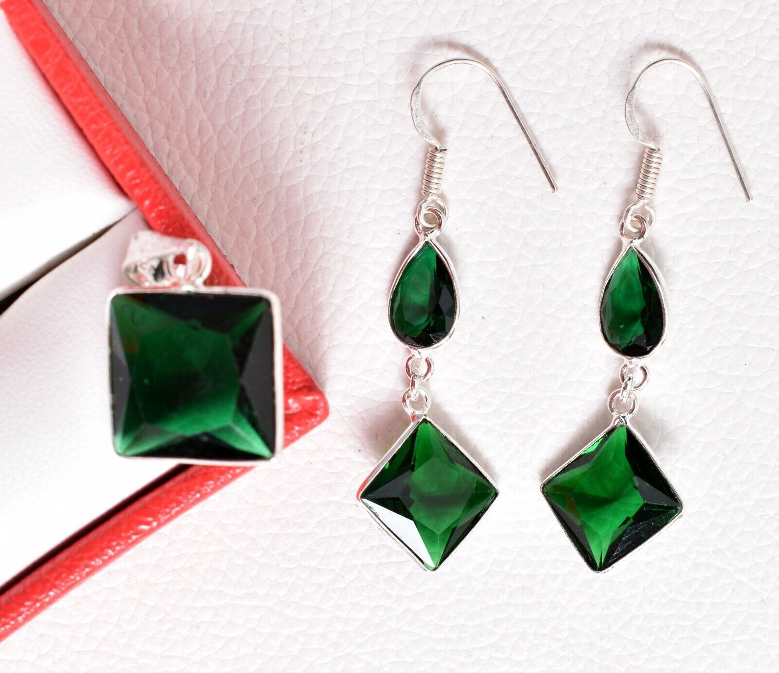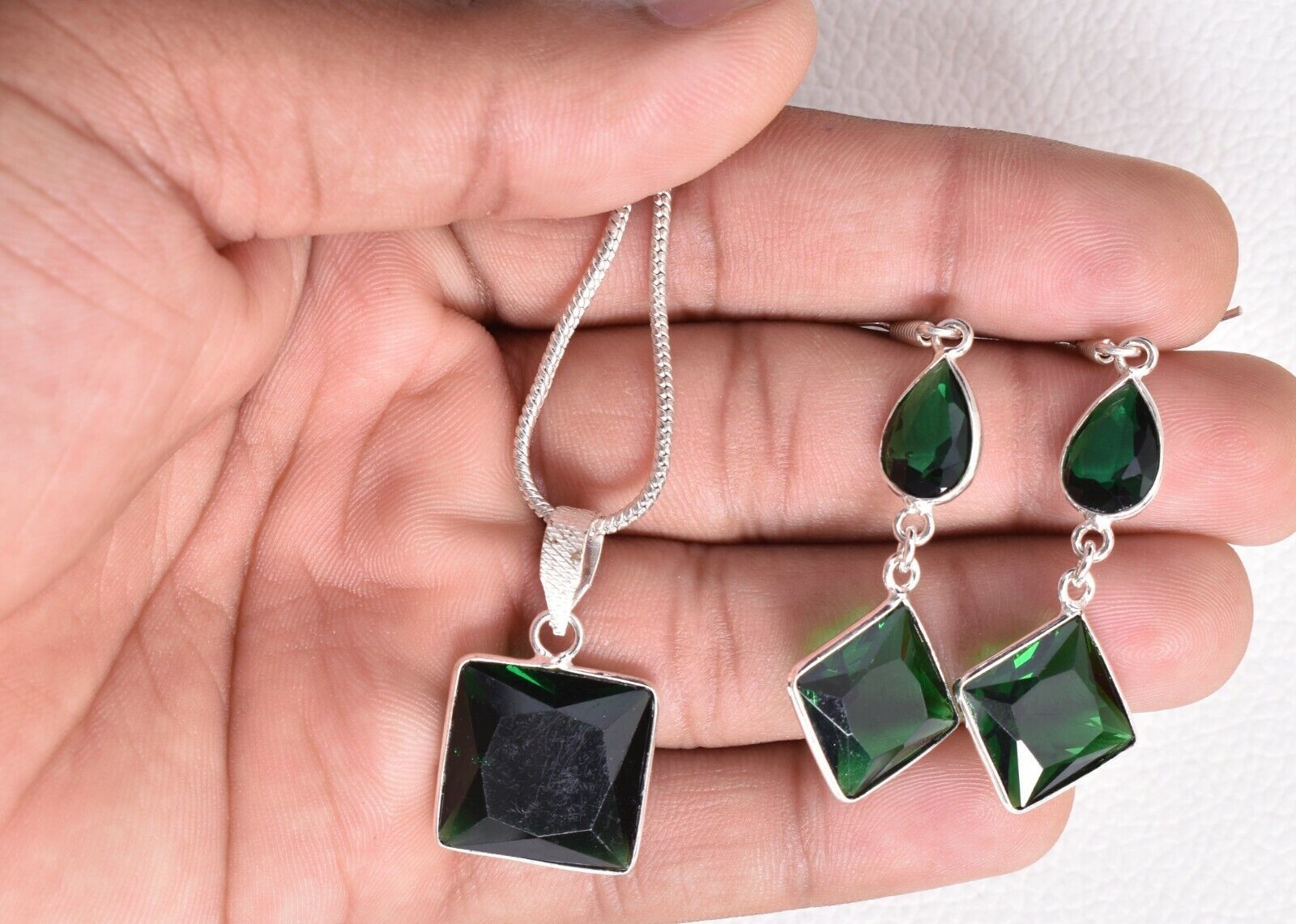 925 Sterling Silver Emerald Quartz Gems Handmade Necklace Earrings Gift SET-1064