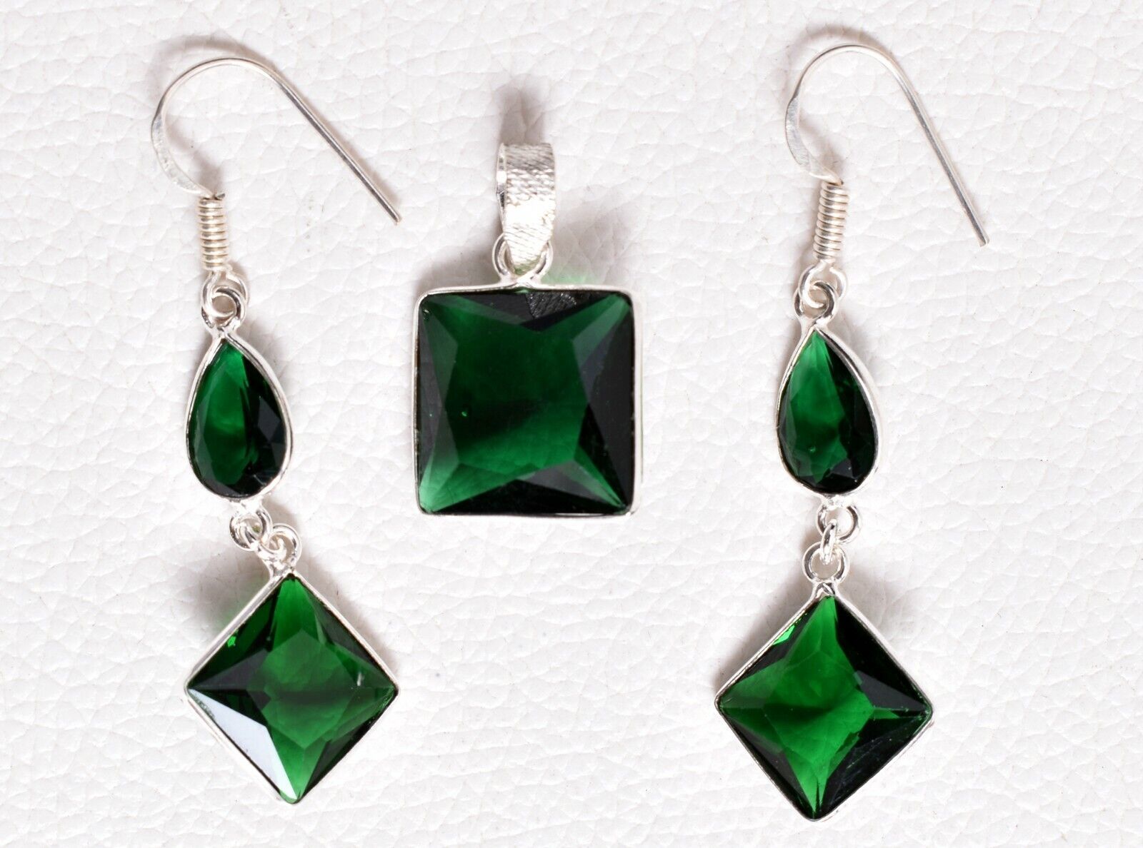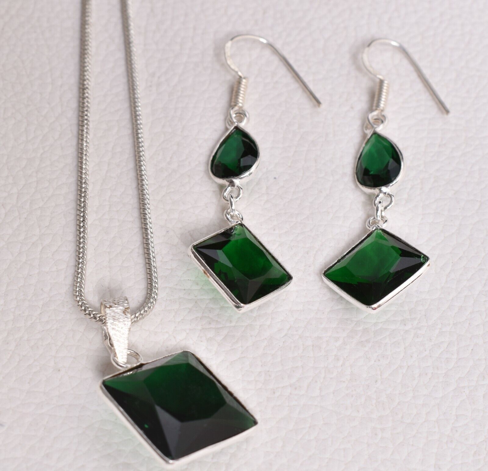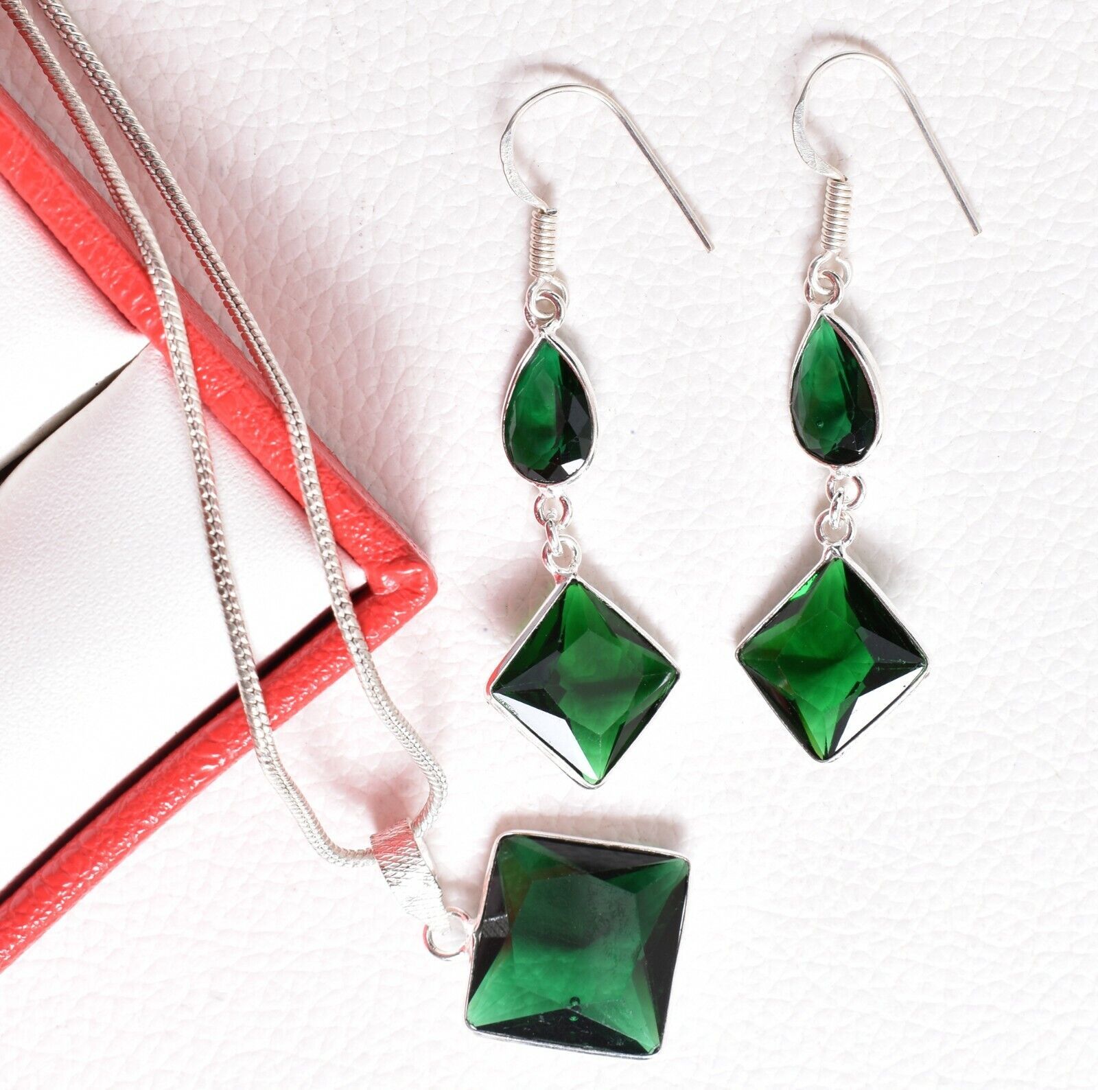 925 Sterling Silver Emerald Quartz Gems Handmade Necklace Earrings Gift SET-1064