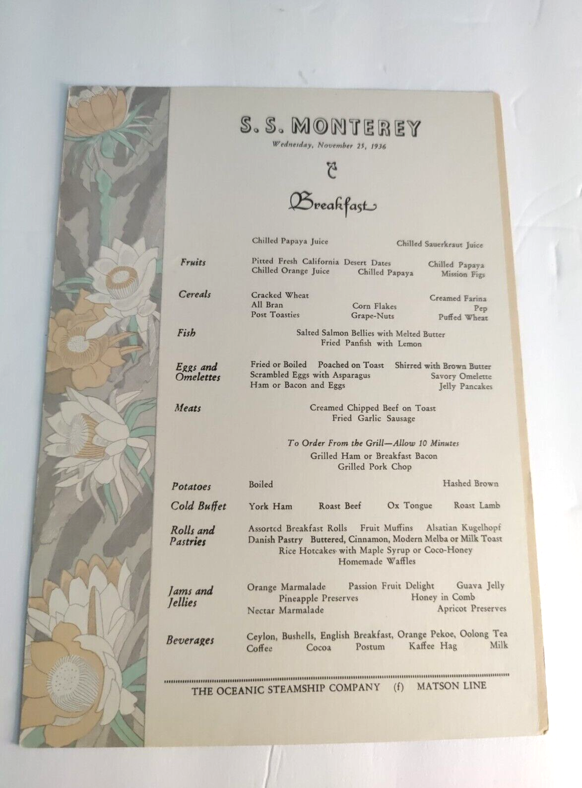 S.S. Monterey Breakfast Menu. Vintage Nov. 25 1936 Oceanic Steamship.