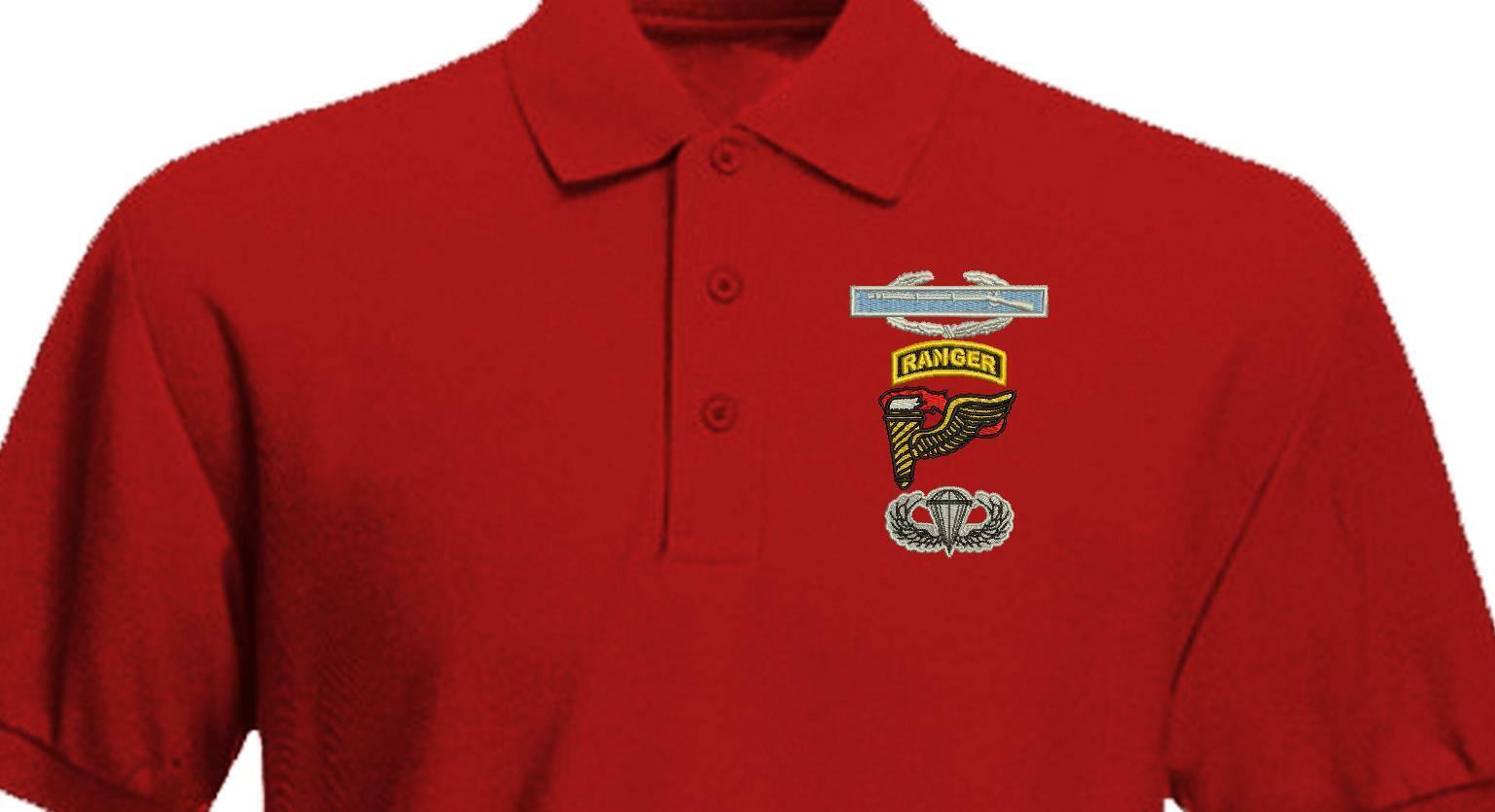 One Men's Polo Shirt with embroidered CIB Ranger Pathfinder and Basic Wings design as pictured