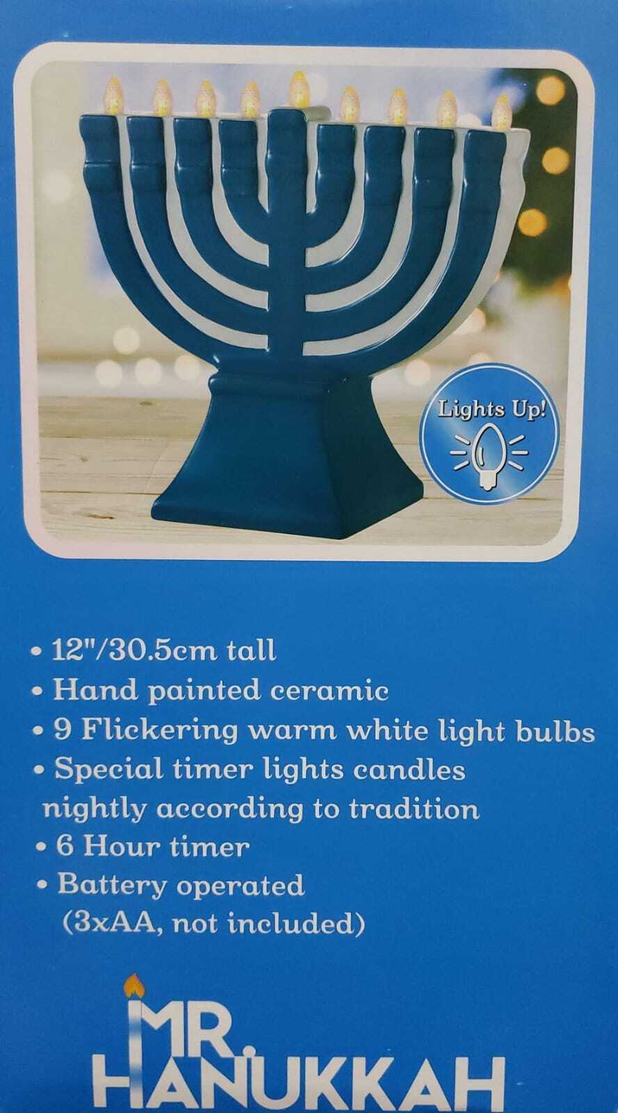 Celebrate the Festival of Lights with this unique Ceramic Menorah by Mr. Hanukkah. This 12" tall decoration is hand-painted a glossy bright blue. The nine faceted white LED bulbs flicker, creating a life-like candle glow. Battery-operated for easy display anywhere in your home, complete with a built-in timer that illuminates candles according to tradition. The Ceramic Hanukkah Menorah is ready for an evening or eight of family celebrations.
