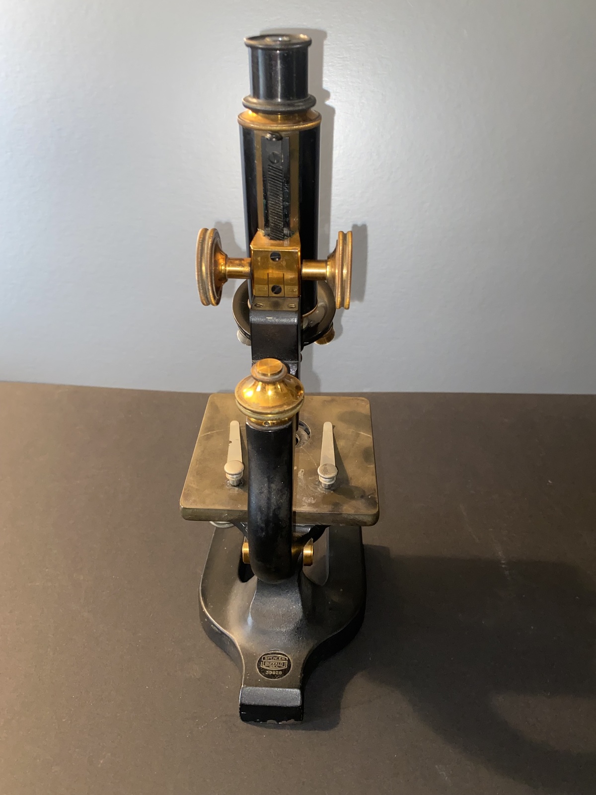 This listing features a beautiful example of a Spencer Lens Company Monocular Microscope made in Buffalo, New York, 1920. It's serial number is 39828 and features a super durable cast-iron and brass frame with a marble examination table. This model became the gold standard of its day and was in widespread use from research laboratories to Universities. It stayed in use all the way until the 1950's.