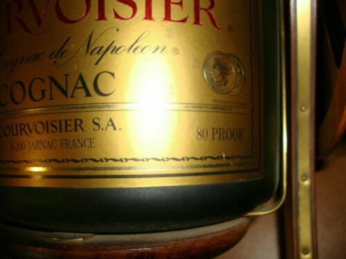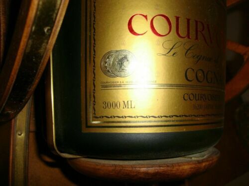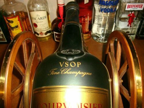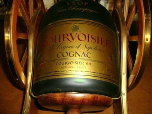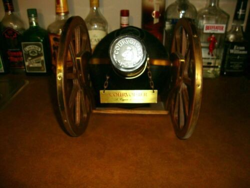 COURVOISIER BRASS WOOD CANNON LOADED WITH 3000 ML (3 LITER) VSOP COGNAC BOTTLE (empty of course). LIKE NEW CONDITION! Over 40 years old. Brass overlays to the wheels and frame. Measures 13" long X 9.5" high X 9" wide. Shipping is expensive because of the weight and the large size of box required. Four 750ml or 3 1 liter bottles will fill this unit up, and then you can just tip the bottle to serve the best with class! Shipping includes insurance.