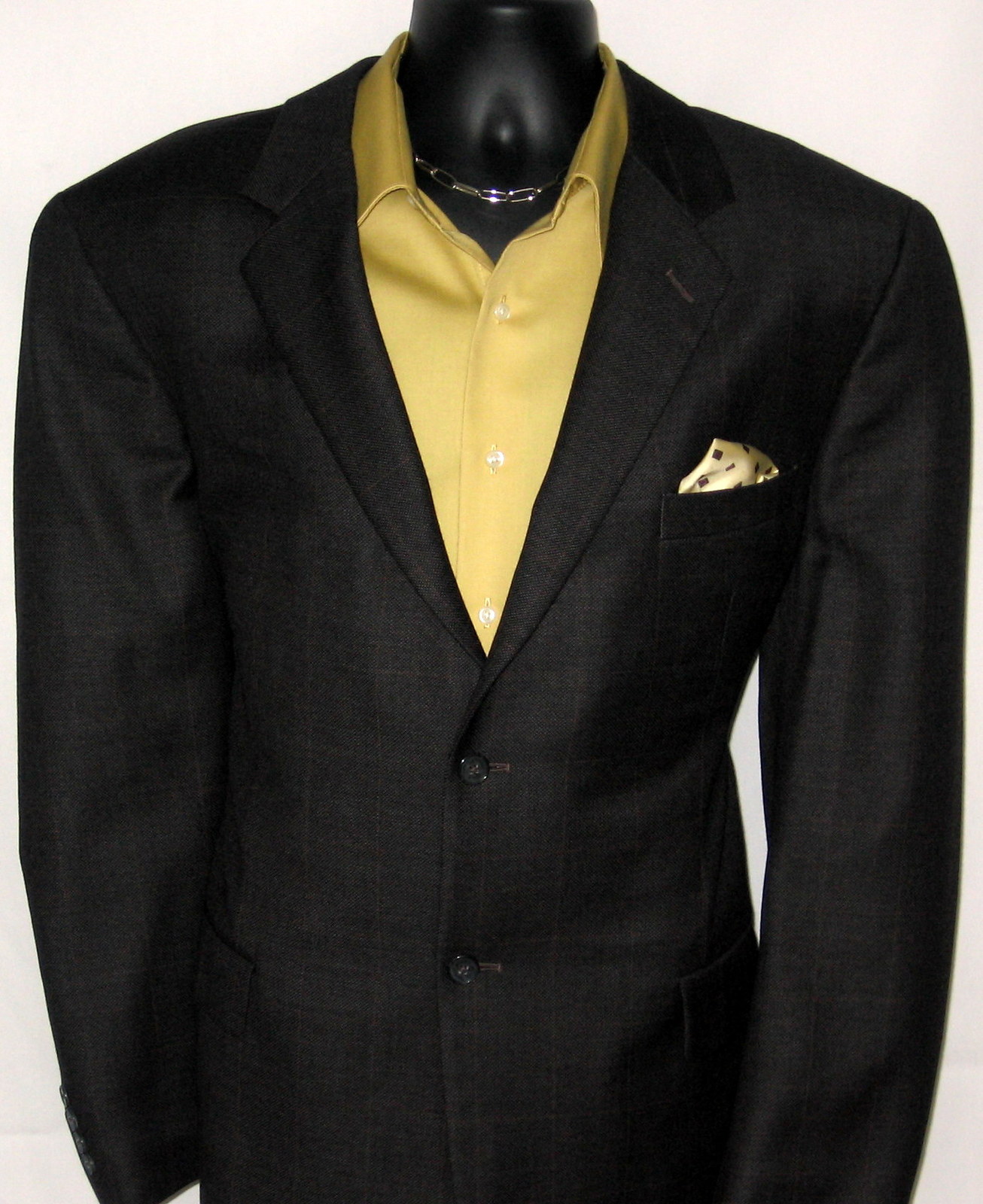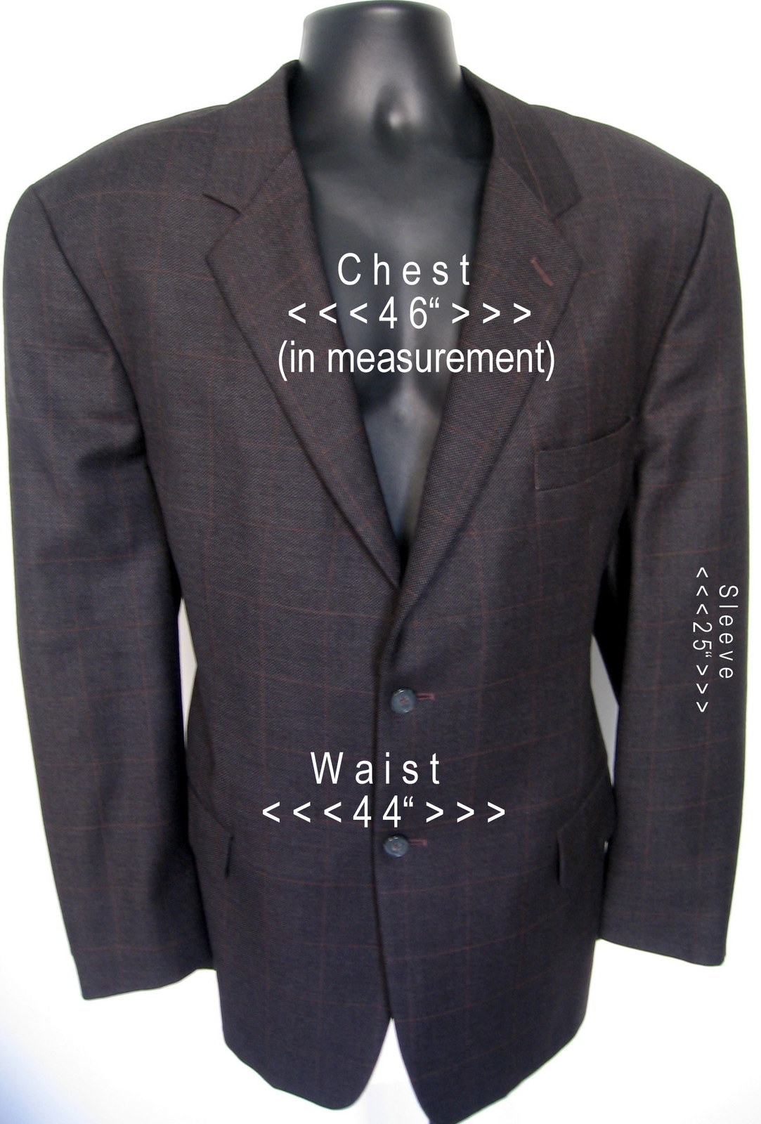Full lining throughout both the jacket and pants. Plaid patterned with a burgundy piped "window pane" styling set against the intensely rich charcoal grey base color. In pristine condition (suit was worn for just one occasion). This suit is truly an impressive garment that is certain to accentuate your professional wardrobe collection.