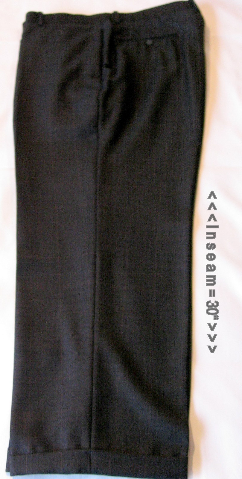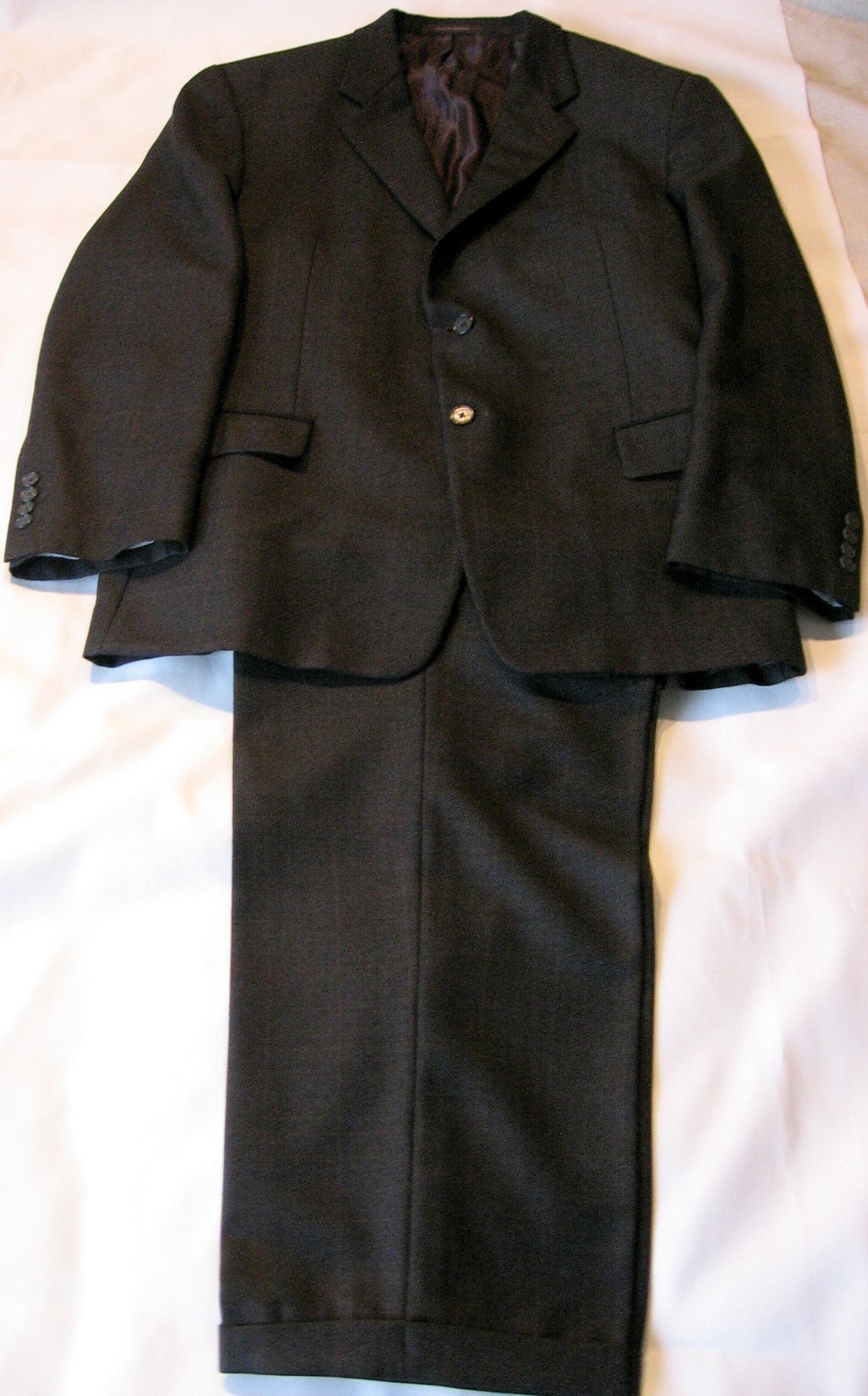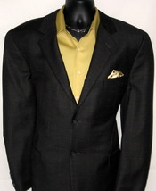 100% Wool, elegant, athletic/classic fit, single breasted, two button closure two piece suit. Jacket: features notched lapel with four cuff buttons on each sleeve. Two front flap pockets (pocket "flaps" can be tucked in to appear as "flat" pocket style. Right front pocket has a hidden "coin" pocket). Standard flat pocket(upper left chest side of jacket), for a pocket square. Jacket inside left has three slip pockets; Jacket inside right has one breast slip pocket. Back of jacket has duel side vents. Pants: two slanted slip pockets (right pocket has inside hidden "coin" pocket), two back pockets (with button closure), belt loops, zippered fly, hook bar fastening with button closure. cuff bottom (measurements are included in attached photos. All measurements are an, "Approximate". A local tailor can perform alterations to fit suit to your exact measurement specifications).