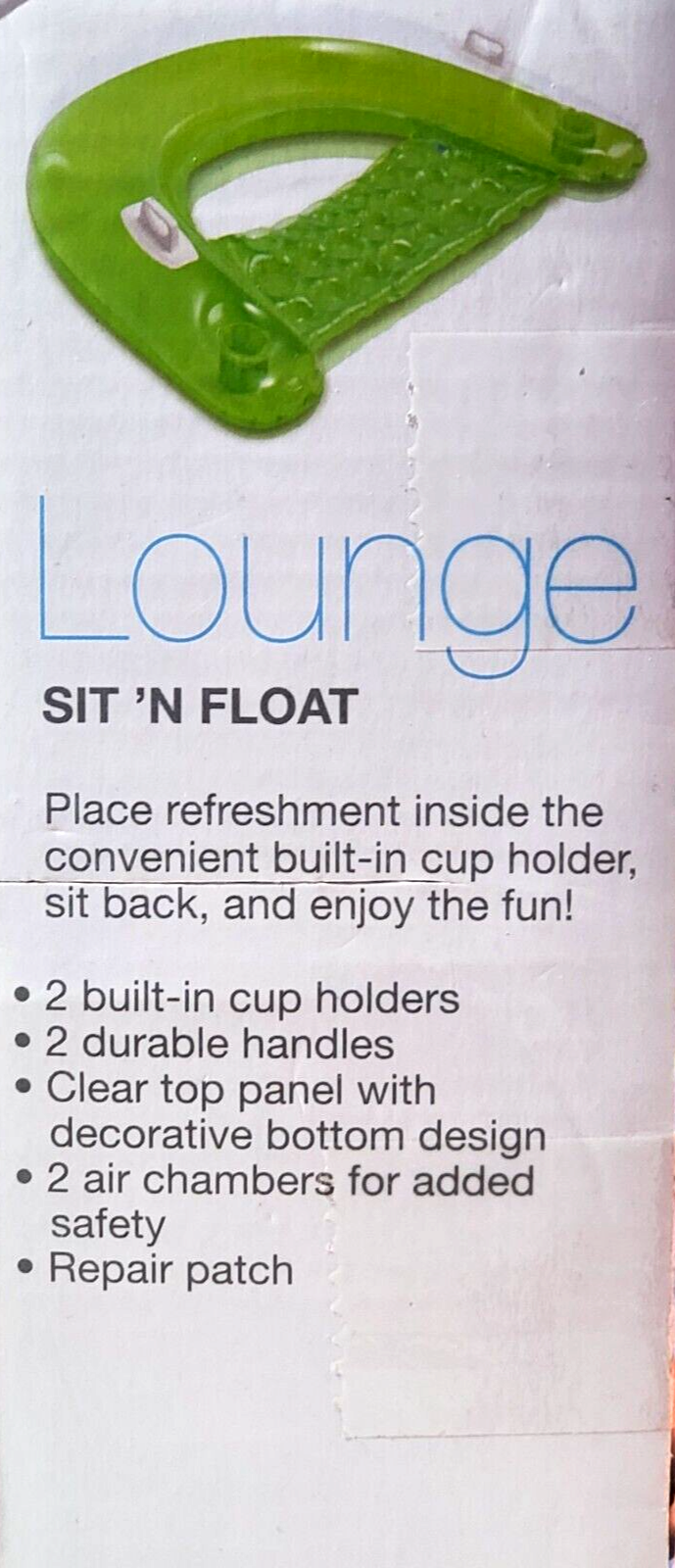 GREEN Sit N Float INFLATABLE Pool/Lake LOUNGE 60" X 39" 2 handles 2 cup holders