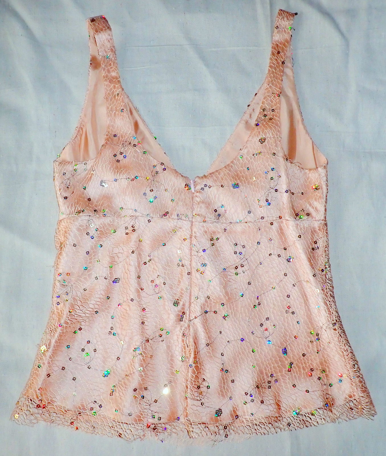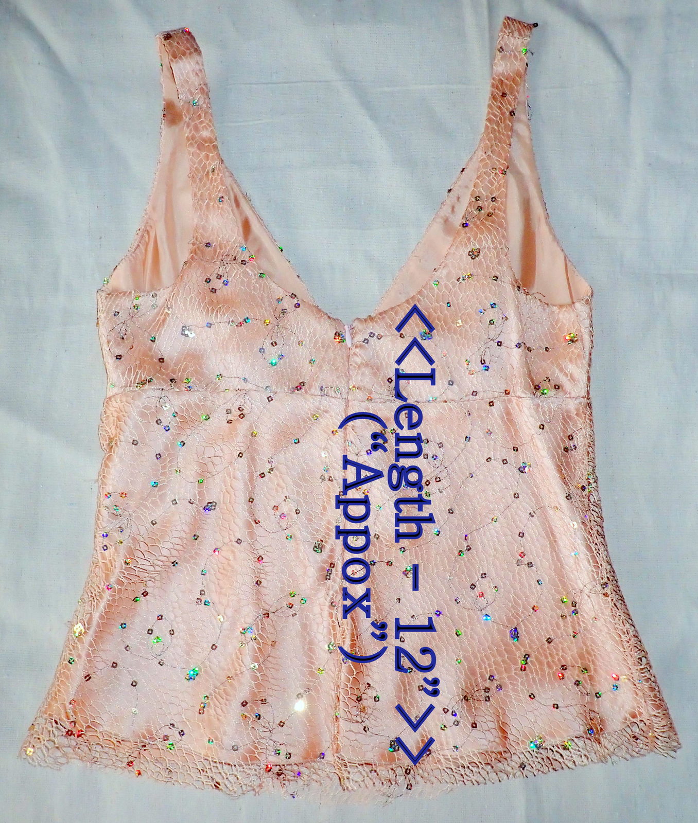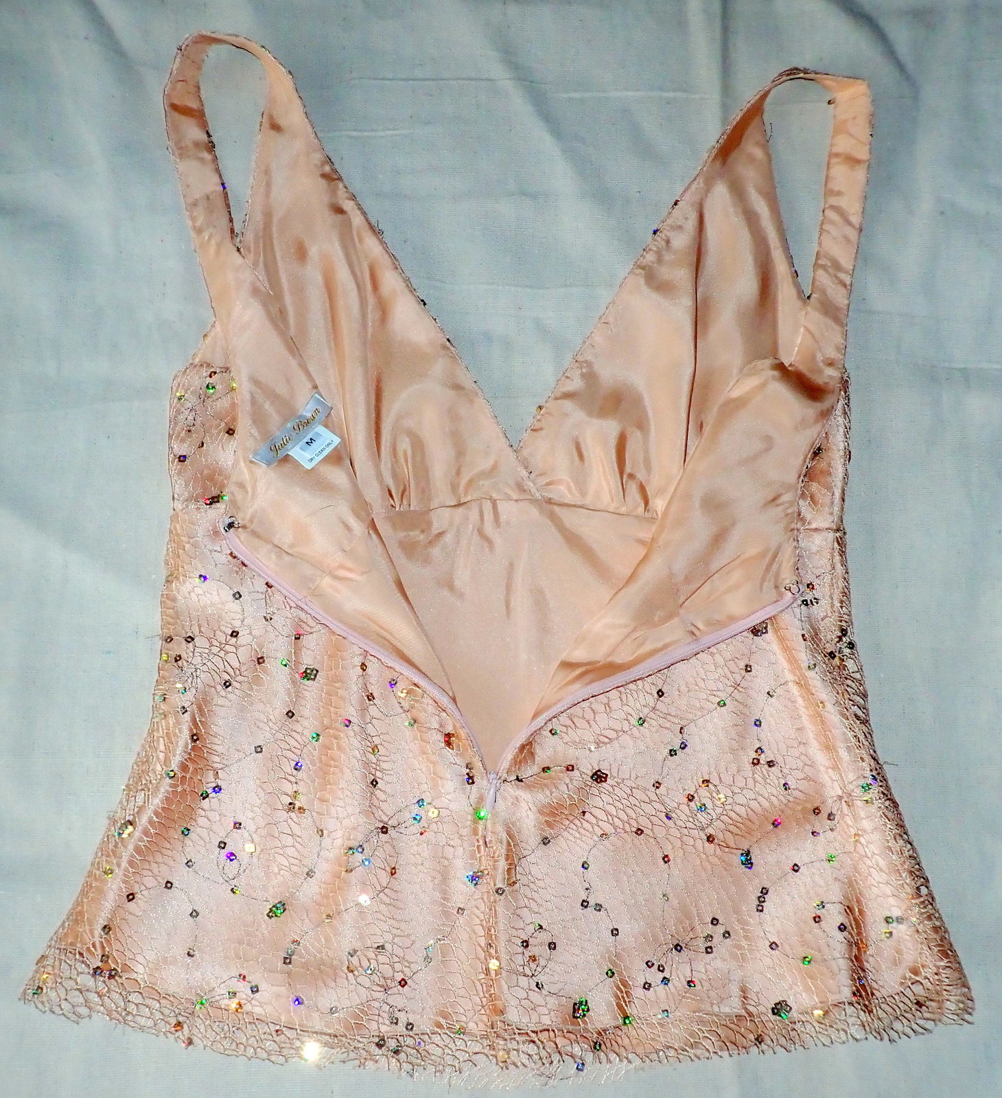 A glistening, exquisite camisole style fitted blouse by Julie Brown. 100% Silk with a "V-Neck" neckline. A solid "rose" color shell draped with a see through threading overlay of sequins jewelling that is elegantly coupled together by a decorative brooch centerpiece. Full lining, pullover styling with a hidden zipper (back center - see photo's). In excellent pre owned condition, this is a radiant ready to wear blouse for any of your social or cocktail hour events. (Note: in areas, the sequins can be flakey or a little loose fitting; all measurements are an, "Approximate" via a USA standard measuring tape).