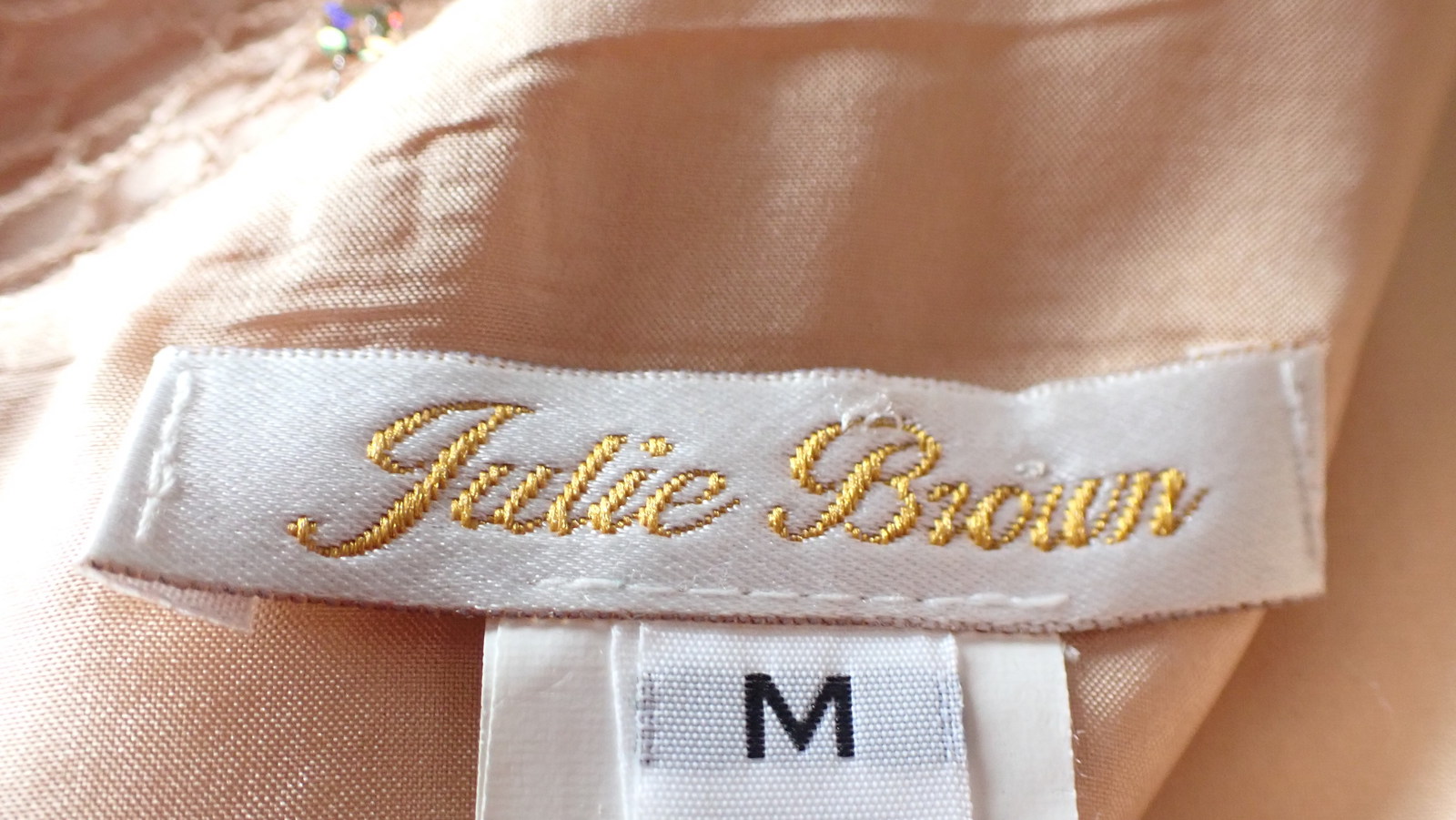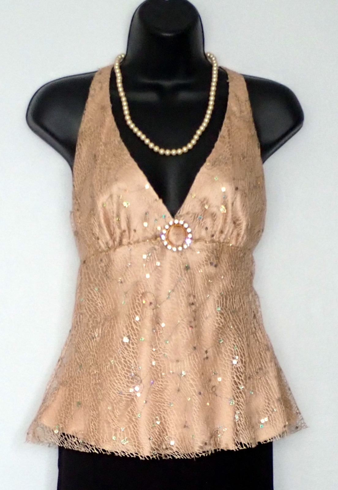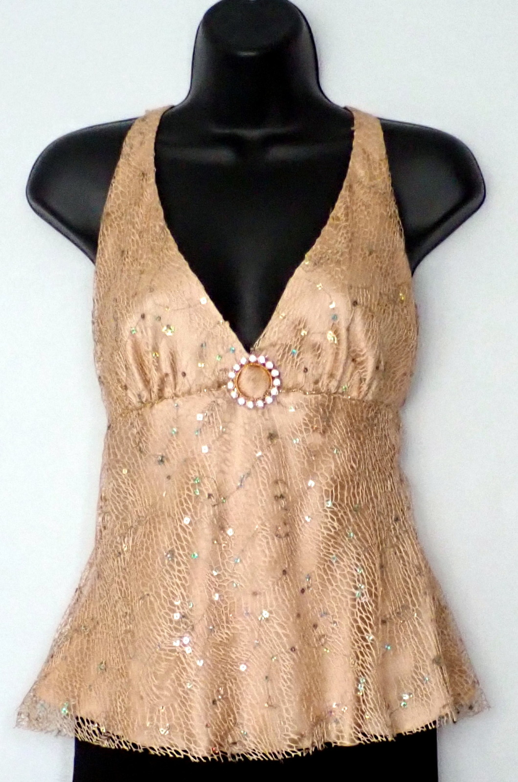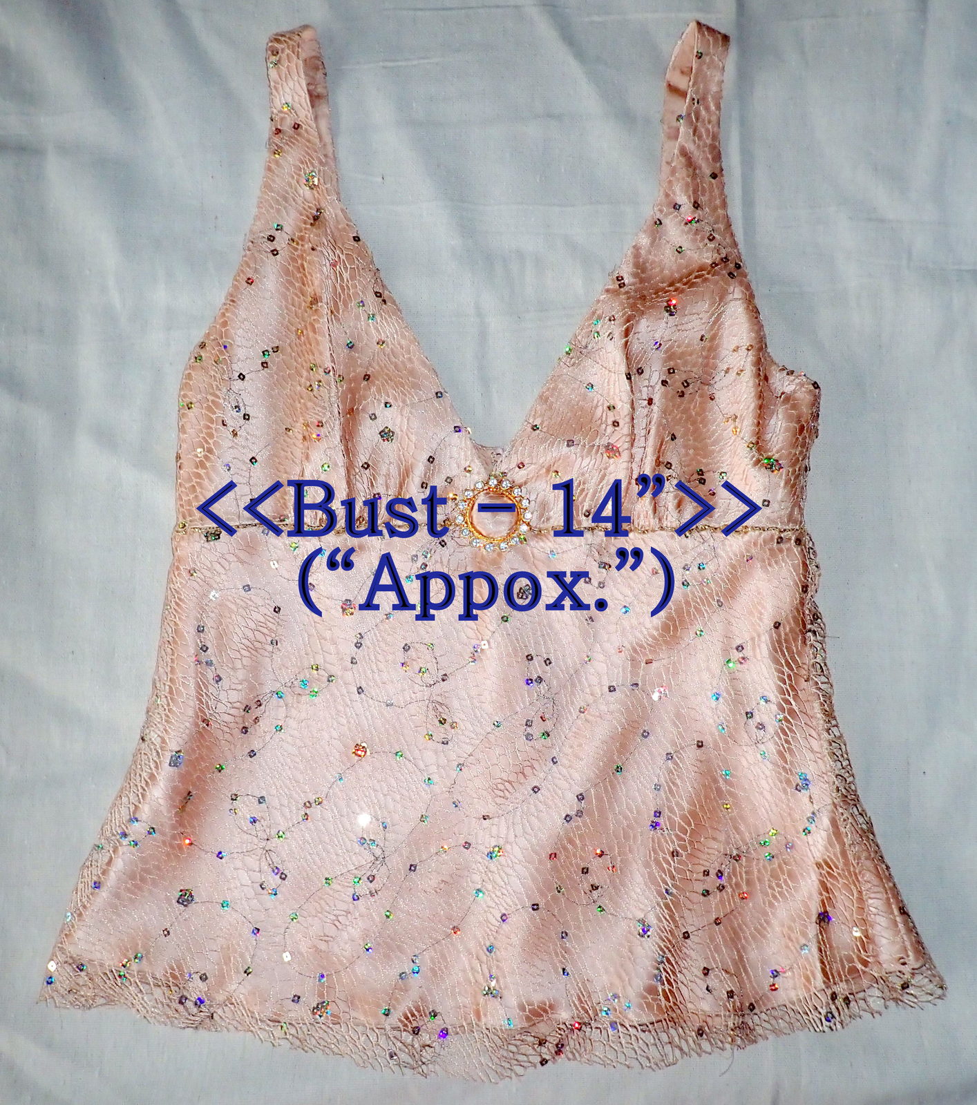 A glistening, exquisite camisole style fitted blouse by Julie Brown. 100% Silk with a "V-Neck" neckline. A solid "rose" color shell draped with a see through threading overlay of sequins jewelling that is elegantly coupled together by a decorative brooch centerpiece. Full lining, pullover styling with a hidden zipper (back center - see photo's). In excellent pre owned condition, this is a radiant ready to wear blouse for any of your social or cocktail hour events. (Note: in areas, the sequins can be flakey or a little loose fitting; all measurements are an, "Approximate" via a USA standard measuring tape).