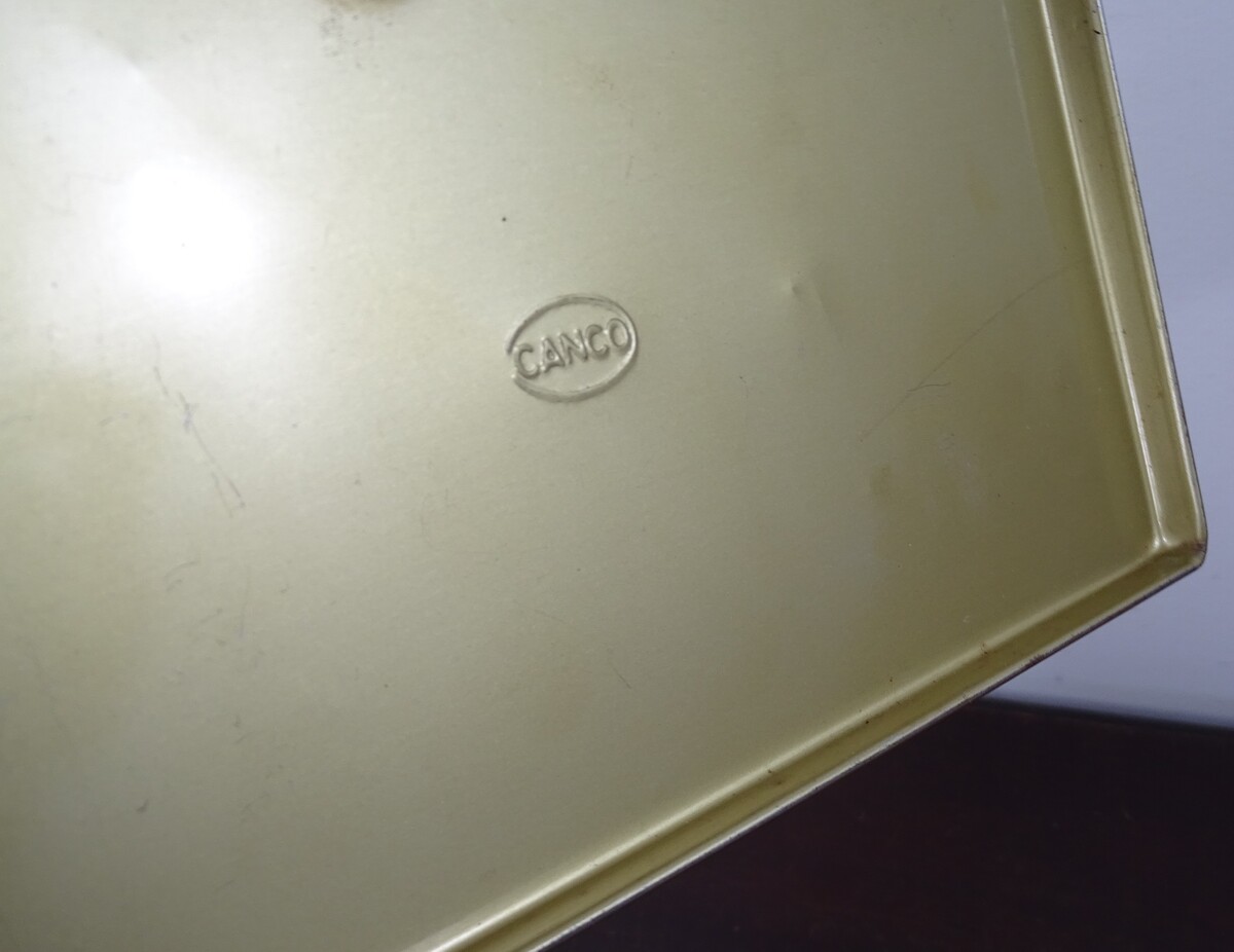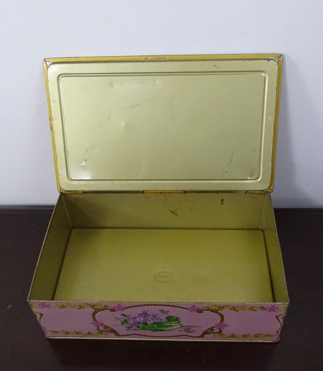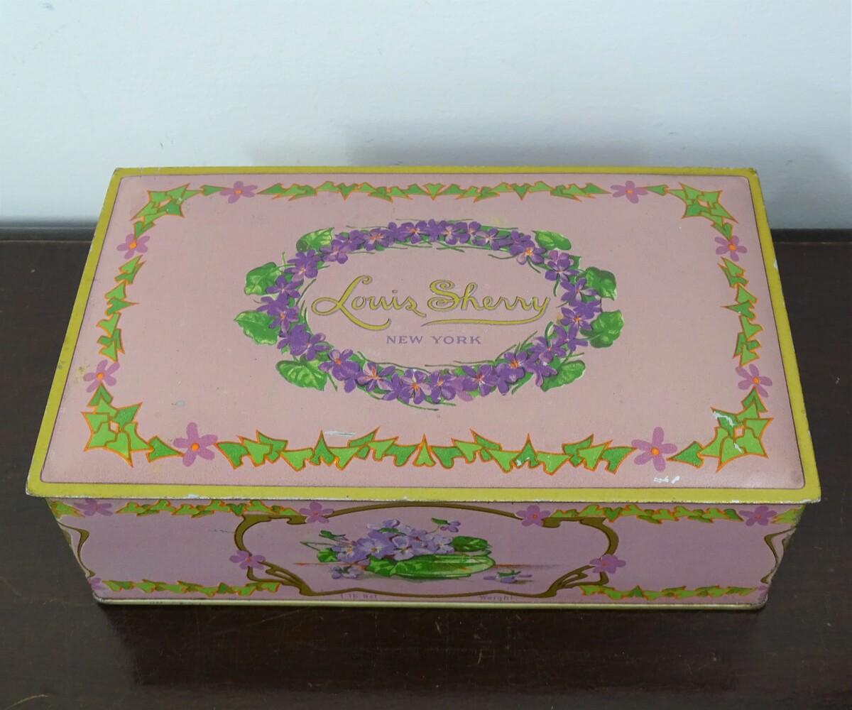 1920s Louis Sherry New York Canco Metal Tin Hinged Box Floral Pink / Lavender. Nice coloring, not dinged. Some scratches on the top - see photos - but overall a nice clean piece. Would be pretty on a vanity to store jewelry. Interior not rusted. 8" x 5" and 2 1/2" tall. Weight is 11 oz.