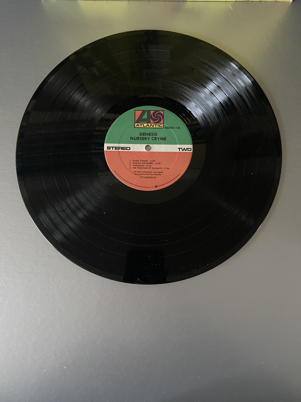 This listing features the Vintage Vinyl Album Nursery Cryme by Genesis produced in 1971 by Atlantic records numbered; 80030-1-B. This album is in near perfect condition. The band's third album was the first to feature drummer Phil Collins and guitarist Steve Hackett. It soars on the strength of Peter Gabriel's voice and the band's progressive blend of ornate musical arrangements and odd narratives. Chest-reverberating bass and swelling mellotrons go to great lengths to uphold the album's theme.
