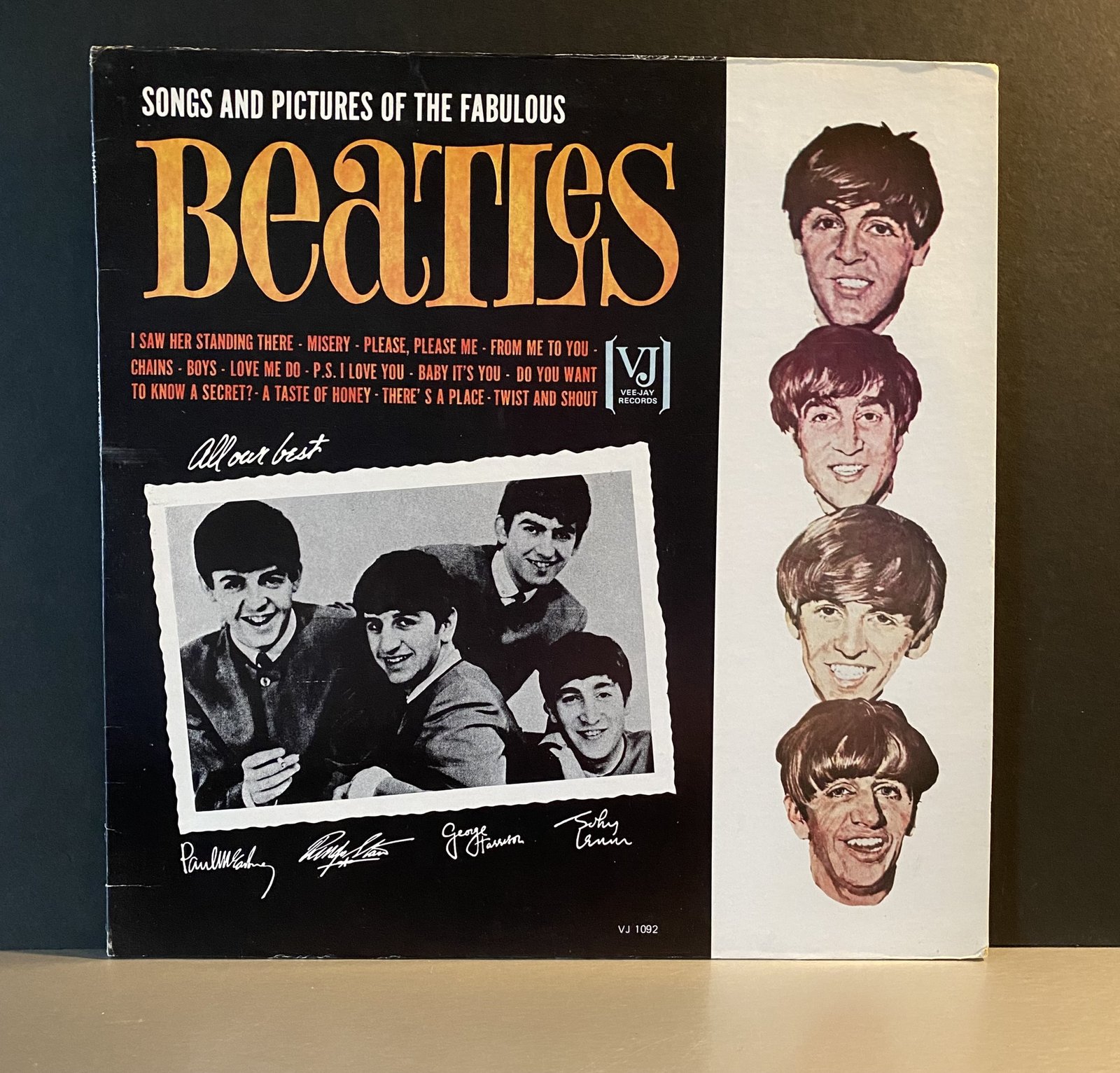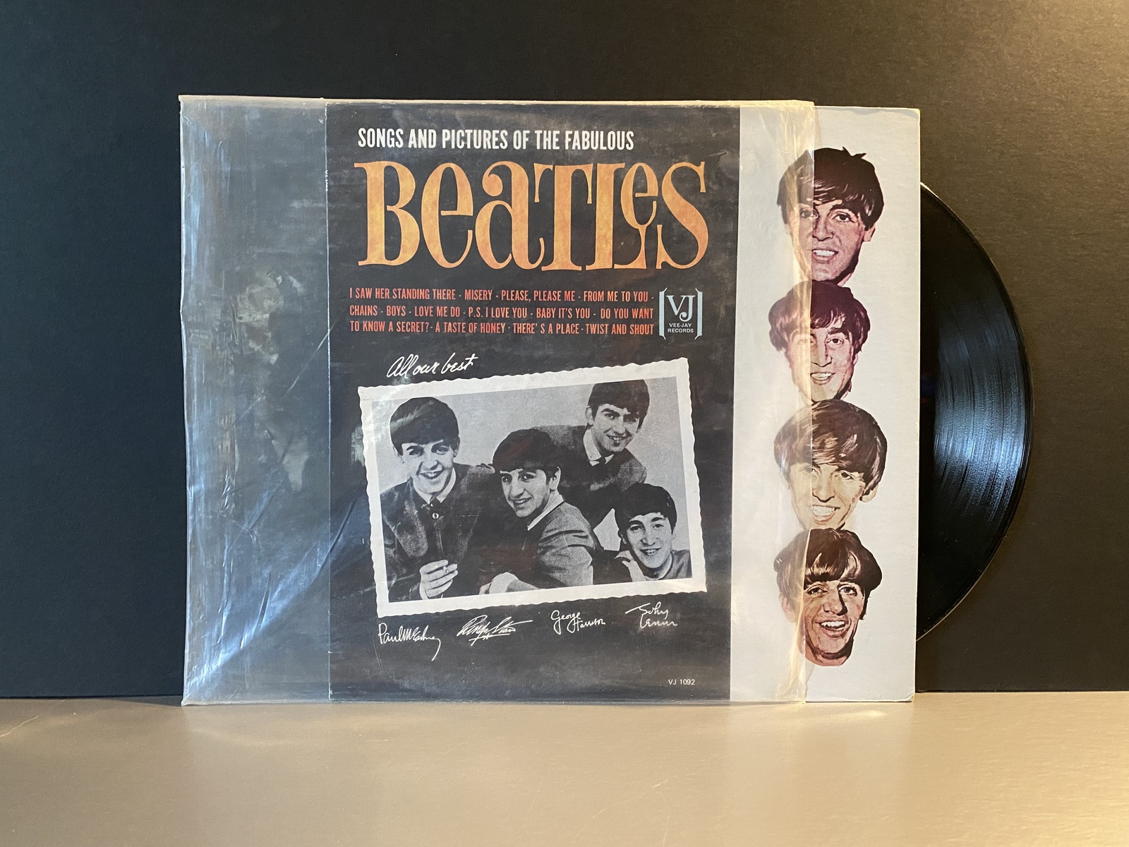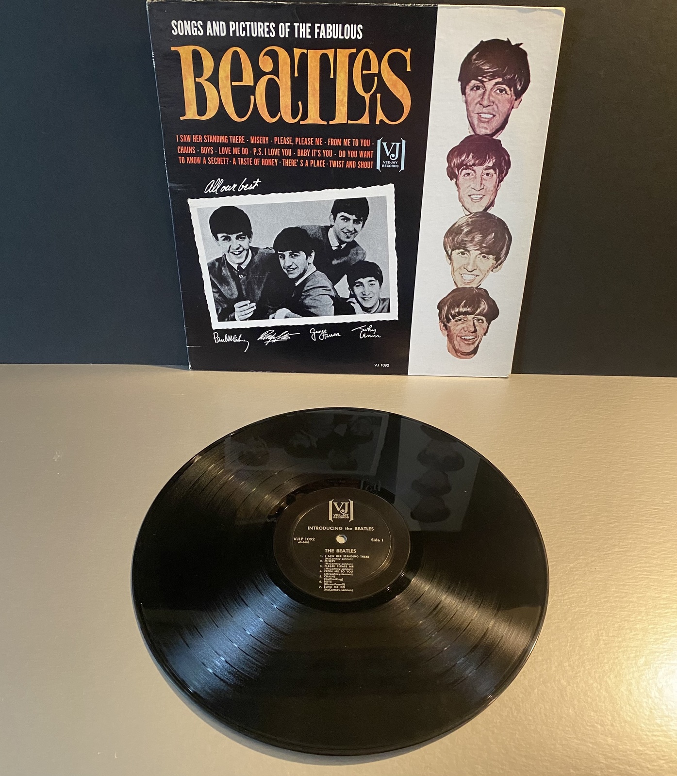 This listing features a vintage vinyl album titled; Songs, Pictures And Stories Of The Fabulous Beatles produced in 1964 by Vee-Jay records. Introducing... The Beatles is the first studio album released by the English rock band the Beatles in the United States. Originally scheduled for a July 1963 release, the LP came out on 10 January 1964, on Vee-Jay Records, ten days before Capitol's Meet the Beatles!. The latter album, however, entered the U.S. album chart one week before the former. Consequently, when Meet The Beatles! peaked at No. 1 for eleven consecutive weeks, Introducing...The Beatles stalled at No. 2 where it remained for nine consecutive weeks. It was the subject of much legal wrangling, but ultimately, Vee-Jay was permitted to sell the album until late 1964, by which time it had sold more than 1.3 million copies.[3] On 24 July 2014 the album was certified gold and platinum by the RIAA.
