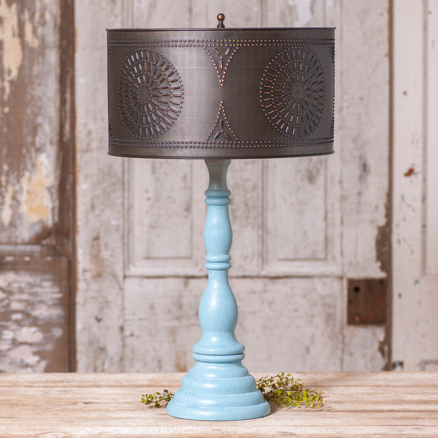 A medium sized lamp base that will work well in your office, family room, or entryway. A neat looking lamp base with an up to date rustic chic finish. Included shade has a Kettle Black finish.