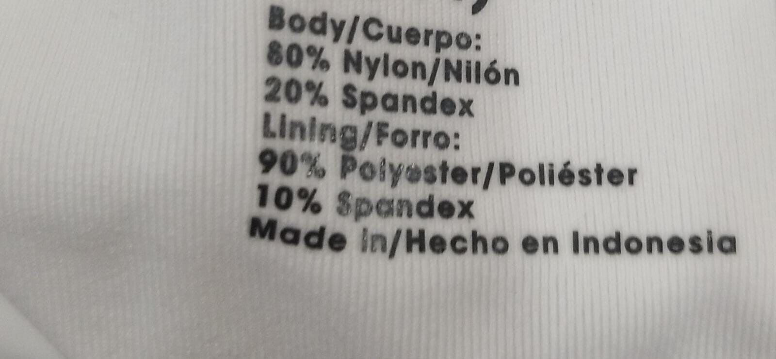 Material: 80% Nylon/20% Spandex; Lining: 90% Polyester/10% Spandex