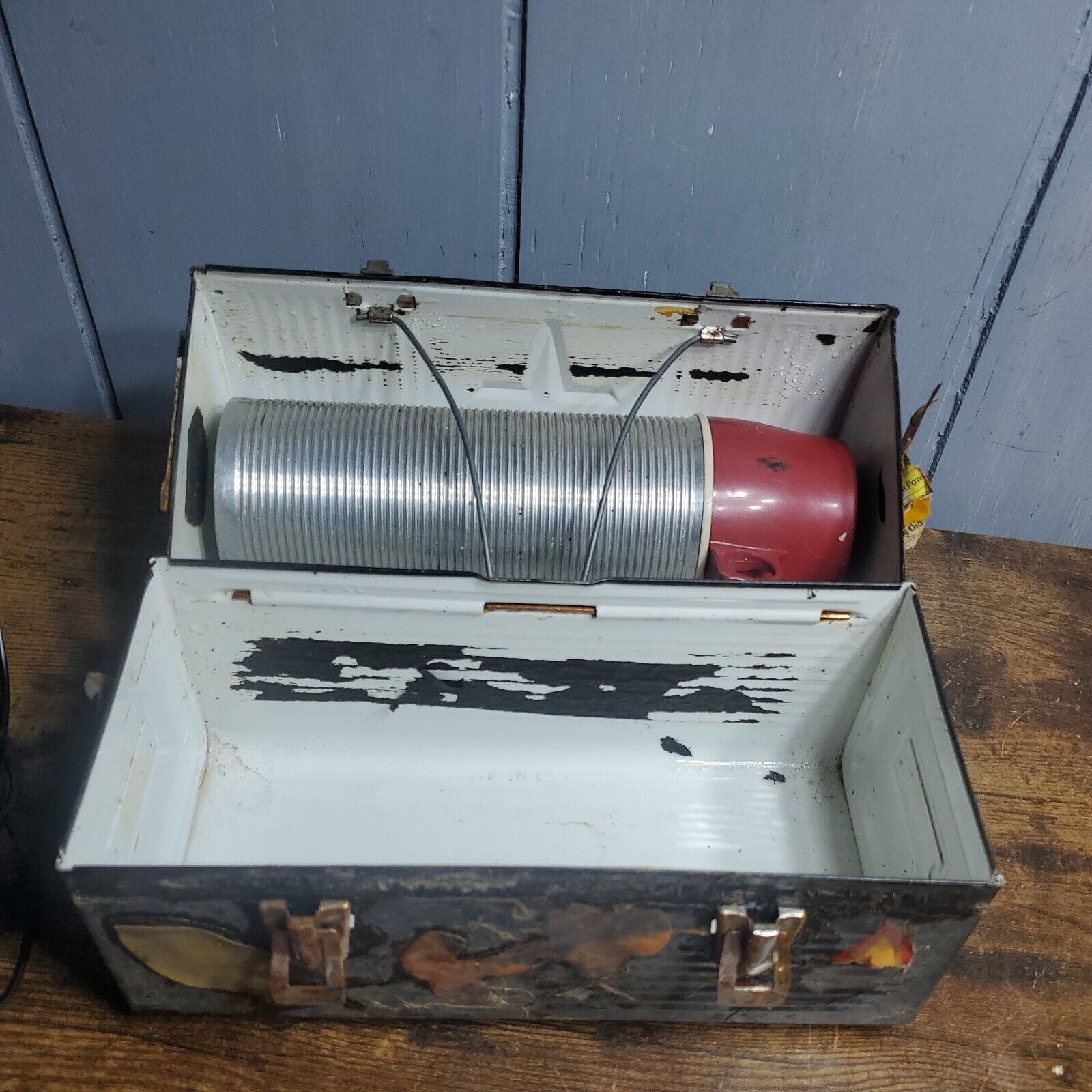 Vintage American Thermos Products Black Metal 'V' Lunch Box, Red plad Thermos.